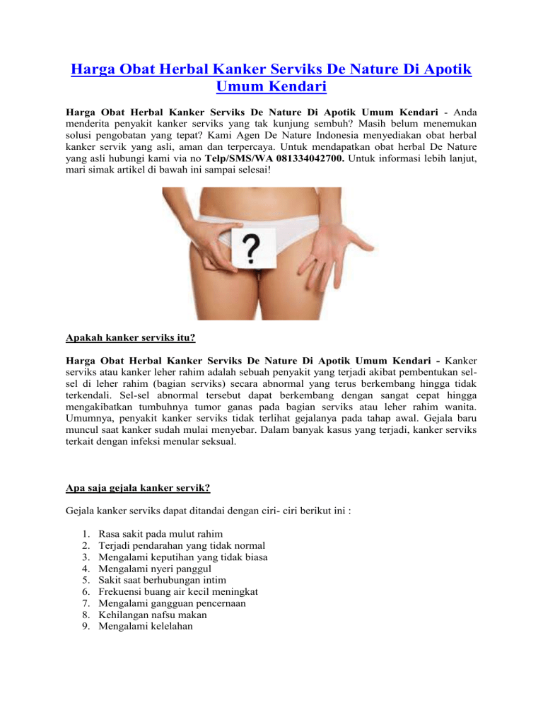 Harga Obat Herbal Kanker Serviks De Nature Di Apotik Umum Kendari Harga Obat Herbal Kanker Serviks De Nature Di Apotik Umum Kendari - Anda menderita penyakit kanker serviks yang tak kunjung sembuh? Masih belum menemukan solusi pengobatan yang tepat? Kami Agen De Nature Indonesia menyediakan obat herbal kanker servik yang asli, aman dan terpercaya. Untuk mendapatkan obat herbal De Nature yang asli hubungi kami via no Telp/SMS/WA 081334042700. Untuk informasi lebih lanjut, mari simak artikel di bawah ini sampai selesai! Apakah kanker serviks itu? Harga Obat Herbal Kanker Serviks De Nature Di Apotik Umum Kendari - Kanker serviks atau kanker leher rahim adalah sebuah penyakit yang terjadi akibat pembentukan selsel di leher rahim (bagian serviks) secara abnormal yang terus berkembang hingga tidak terkendali. Sel-sel abnormal tersebut dapat berkembang dengan sangat cepat hingga mengakibatkan tumbuhnya tumor ganas pada bagian serviks atau leher rahim wanita. Umumnya, penyakit kanker serviks tidak terlihat gejalanya pada tahap awal. Gejala baru muncul saat kanker sudah mulai menyebar. Dalam banyak kasus yang terjadi, kanker serviks terkait dengan infeksi menular seksual. Apa saja gejala kanker servik? Gejala kanker serviks dapat ditandai dengan ciri- ciri berikut ini : 1. 2. 3. 4. 5. 6. 7. 8. 9. Rasa sakit pada mulut rahim Terjadi pendarahan yang tidak normal Mengalami keputihan yang tidak biasa Mengalami nyeri panggul Sakit saat berhubungan intim Frekuensi buang air kecil meningkat Mengalami gangguan pencernaan Kehilangan nafsu makan Mengalami kelelahan Akan tetapi banyak wanita yang tidak menyadari bahkan meremehkan tanda yang mereka alami yang mungkin bisa jadi gejala kanker serviks stadium awal. Lalu, apa saja pengobatan yang dapat dilakukan oleh penderita kanker serviks? Pengobatan Kanker Serviks Harga Obat Herbal Kanker Serviks De Nature Di Apotik Umum Kendari - Ada beberapa langkah pengobatan yang dapat dilakukan untuk menyembuhkan kanker serviks yang sedang Anda derita yaitu dengan cara Operasi, Radioterapi, ataupun Kemoterapi. Akan tetapi cara pengobatan tersebut ternyata tidak seefektif yang pasien harapkan. Penyakit ini bisa semakin kronis dan muncul kembali meskipun pengobatanya sudah dilakukan. Tapi jangan khawatir karena berbagai penelitian kesehatan yang dilakukan oleh orang berkompeten selalu berupaya menemukan pengobatan yang benar-benar efektif untuk penyakit ini. Baca Juga : Harga Obat Herbal Kanker Servik De Nature Di Apotik Umum Kediri Obat herbal De Nature adalah satu-satunya solusi terbaik bagi Anda untuk mendapatkan pengobatan yang ampuh untuk penyakit kanker serviks yang sedang Anda derita saat ini. Obat herbal De Nature sudah teruji secara klinis bahwa obat herbal De Nature memiliki kandungan antioksidan yang sangat tinggi di mana zat antioksidan ini merupakan zat antikanker yang mampu menghambat atau menekan pertumbuhan dan perkembangan sel-sel kanker dalam tubuh Anda. Kini Anda tidak perlu ragu untuk melakukan pemesanan obat herbal De Nature yang asli, karena sekarang Anda telah menemukan situs yang tepat. Kami Agen obat herbal de nature yang asli dan terpercaya, jadi Anda tidak perlu lagi khawatir untuk melakukan pemesanan. Untuk mendapatkan produk yang asli segera hubungi no Telp/SMS/ Wa 081334042700. OBAT HERBAL KANKER SERVIKS ZIIRZAX & TYPHOGELL DE NATURE Informasi Pemesanan Produk Hubungi No Telp/SMS/ Wa 081334042700 Harga Obat Kanker Serviks De Nature : Paket 1 minggu : Rp 315.000 (Terdiri dari 1 botol Ziirzax dan 1 botol Typhogell) Paket 1 bulan : Rp 1.150.000 (Terdiri dari 4 botol Ziirzax dan 4 botol Typhogell) hemat Rp 110.000 Paket 2 bulan : Rp 1.995.000 (Terdiri dari 8 botol Ziirzak dan 8 botol Typhogell) hemat Rp 525.000 Obat Kanker Serviks De Nature berisi : 1 Botol Ziirzax isi 50 Kapsul 1 Botol Typhogell isi 50 Kapsul Aturan Minum: Kapsul Ziirzax diminum 3 kali Sehari 2 kapsul/btl 1 jam sebelum makan. Kapsul Typhogell diminum 3 kali Sehari 2 kapsul/btl 1 jam sebelum makan. (Belum termasuk ongkir) Obat Herbal Ziirzax De Nature Obat kanker alami de nature ziirzax diproduksi dari daun dan buah sirsak alami yang mempunyai banyak manfaat, dipadukan dengan bahan- bahan herbal lainya yang dapat membantu menyembuhkan penyakit kanker. Tiap kapsul obat kanker alami de nature ziirzax mengandung ekstrak yang setara dengan Annonane muricata folium 2500 mg. Obat kanker alami de nature ziirzax ini mempunyai banyak khasiat yang dapat membantu anda dalam mempercepat penyembuhan penyakit kanker dalam tubuh anda. Serta daun sirsak juga dapat membunuh dan memperbaiki tingkat kesehatan dalam tubuh. Obat Herbal Thypogell De Nature Obat kanker alami de nature typhogell diproduksi dari tanaman keladi tikus (Typhonium flagelliforme) yang digunakan sebagai obat kanker payudara. Tiap kapsul obat de nature mengandung ekstrak yang setara dengan Typhonium flagelliforme 500 mg Rhizoma exstra. Obat kanker alami de nature typhogell mempunyai banyak khasiat bagi tubuh anda.Sebagai imunitas antikanker, antimikrobia dan antioksidan. Penghambat pertumbuhan sel- sel kanker. Mengurangi efek buruk kemoterapi. Anti virus dan anti bakteri. Mengatasi diabetes. Mengatasi hipertensi. Meningkatkan kekebalan tubuh. OBAT HERBAL DE NATURE INDONESIA AMAN & ALAMI JL. Pahonjean Perum Cendana Asri No 9, Kecamatan Majenang, Kabupaten Cilacap,Jawa Tengah Kode Pos 53257 Whatsapp/ Telp/ Sms : 0813-3404-2700 Agen Resmi De Nature Indonesia menyediakan berbagai macam obat herbal de nature sebagai solusi untuk masalah kesehatan Anda. Anda sekarang tidak perlu lagi bingungbingung untuk mencari obat herbal yang ampuh untuk menyembuhkan penyakit yang sedang Anda derita, setiap penyakit pasti ada obatnya tetapi tidak semua penyakit obatnya sama, jadi Anda harus bijak dalam memilih obat herbal. Obat herbal de nature adalah solusi yang tepat untuk setiap penyakit Anda, Anda tidak perlu ragu untuk mengonsumsi obat herbal de nature, karena de nature dijamin aman dan ampuh untuk segala penyakit Anda. Berikut Daftar Produk 