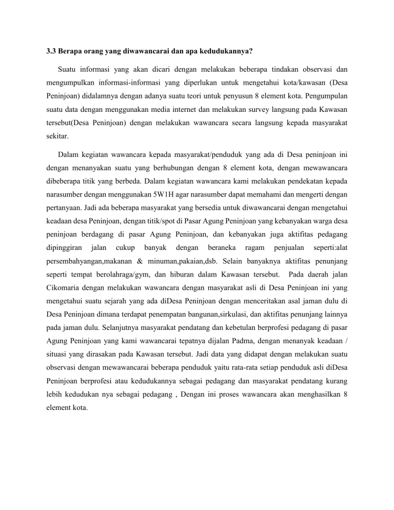 3.3 Berapa orang yang diwawancarai dan apa kedudukannya? Suatu informasi yang akan dicari dengan melakukan beberapa tindakan observasi dan mengumpulkan informasi-informasi yang diperlukan untuk mengetahui kota/kawasan (Desa Peninjoan) didalamnya dengan adanya suatu teori untuk penyusun 8 element kota. Pengumpulan suatu data dengan menggunakan media internet dan melakukan survey langsung pada Kawasan tersebut(Desa Peninjoan) dengan melakukan wawancara secara langsung kepada masyarakat sekitar. Dalam kegiatan wawancara kepada masyarakat/penduduk yang ada di Desa peninjoan ini dengan menanyakan suatu yang berhubungan dengan 8 element kota, dengan mewawancara dibeberapa titik yang berbeda. Dalam kegiatan wawancara kami melakukan pendekatan kepada narasumber dengan menggunakan 5W1H agar narasumber dapat memahami dan mengerti dengan pertanyaan. Jadi ada beberapa masyarakat yang bersedia untuk diwawancarai dengan mengetahui keadaan desa Peninjoan, dengan titik/spot di Pasar Agung Peninjoan yang kebanyakan warga desa peninjoan berdagang di pasar Agung Peninjoan, dan kebanyakan juga aktifitas pedagang dipinggiran jalan cukup banyak dengan beraneka ragam penjualan seperti:alat persembahyangan,makanan & minuman,pakaian,dsb. Selain banyaknya aktifitas penunjang seperti tempat berolahraga/gym, dan hiburan dalam Kawasan tersebut. Pada daerah jalan Cikomaria dengan melakukan wawancara dengan masyarakat asli di Desa Peninjoan ini yang mengetahui suatu sejarah yang ada diDesa Peninjoan dengan menceritakan asal jaman dulu di Desa Peninjoan dimana terdapat penempatan bangunan,sirkulasi, dan aktifitas penunjang lainnya pada jaman dulu. Selanjutnya masyarakat pendatang dan kebetulan berprofesi pedagang di pasar Agung Peninjoan yang kami wawancarai tepatnya dijalan Padma, dengan menanyak keadaan / situasi yang dirasakan pada Kawasan tersebut. Jadi data yang didapat dengan melakukan suatu observasi dengan mewawancarai beberapa penduduk yaitu rata-rata setiap penduduk asli diDesa Peninjoan berprofesi atau kedudukannya sebagai pedagang dan masyarakat pendatang kurang lebih kedudukan nya sebagai pedagang , Dengan ini proses wawancara akan menghasilkan 8 element kota. Gambar ? : 8 Element Kota Sumber: Hasil Modifikasi 2019 3.4 Bagaimana peta 3d dibuat? Tahap awal sebelum pembuatan 3d Kawasan kami melakukan survey ke untuk mencari datadata yang tidak bisa kami dapatkan melalui google map. Sebelumnya kami juga menggunakan google map untuk menentukan titik-titik yang susah dijangkau lewat google map seperti ketinggian rata-rata permukiman, letak bangunan-bangunan tradisional dan pembagian batas-batas wilayah agar nantinya bisa disatukan menjadi kawasan. Setelah mendapatkan informasi yang cukup tentang perletakan bangunan zona wilayah dan jenis-jenis bangunan kemudian masuk kedalam tahap pembuatan gambar secara 2d menggunakan autocad untuk mengetahui letak tiap bangunan agar lebih presisi dan akurat peletakannya. Setelah semua bagian telah di gambarkan secara 2d selanjutnya gambar 2d di import kedalam sketchup untuk mengembangkan kedalam bentuk 3d agar dapat memudahkan melihat leveling serta sirkulasi bangunan secara visual 3d. 4.5 Pembahasan 8 kualitas urban studi kasus 4.5.1 Tata Guna Lahan Gambar ? : tata guna lahan kawasan peninjoan Sumber: Hasil Modifikasi 2019 Perkembangan jaman yang semakin modern membuat suatu kawasan mengalami perubahan yang dapat dibilang berkembang ke sisi positif dan juga negative. Ditinjau dari tata guna lahan kawasan peninjoan ini, merupakan kawasan yang berkembang sangat cepat hal ini diperkirakan terjadi karena kawasan peninjoan ini berada di pinggiran kota yang menjadi salah satu daerah pembatas Antara kabupaten badung dan kota Denpasar. Akibatnya pada kawasan peninjoan ini banyak sekali terdapat kawasan pemukiman baru dan fasilitas yang mendukungnya, dikarenakan hal tersebut kini daerah yang dikenal sebagai desa peguyangan kangin ini menjadi sangat padat dan menimbulkan berbagai perubahan dari segi social,ekonomi dan lingkungan. Alih fungsi lahan yang marak tejadi di kawasan ini menyebabkan penduduk yang dulunya mayoritas berprofesi sebagai petani kini sudah mulai beralih menjadi pengusaha yang memfasilitasi banyaknya penduduk baru yang tinggal disana sehingga sebagian besar lahan pertanian telah beralih menjadi kawasan pemukiman dan perdagangan. Selain factor internal masyarakatnya sendiri, factor external seperti kekuasan presiden juga mempengaruhi perkembangan daerah ini, dari hasil wawancara dengan beberapa narasumber diperoleh sebuah informasi bahwa saat masa pemerintahan presiden soeharto dulu dengan ketatnya peraturan yang berlaku, kawasan ini masih sangat banyak mempunyai ruang terbuka hijau yang luas dan tidak ada yang berani menentang dengan mengubahnya menjadi fungsi lain. Ditinjau dari 8 kualitas urban, dari pembahasan mengenai tata guna lahan, kawasan peninjoan ini memiliki berbagai macam penilaian kualitas urban, dari hasil wawancara dan observasi kawasan dapat disimpulkan kawasan peninjoan ini memiliki kualitas tata guna lahan yang belum terlalu tertata dengan rapi. Hal ini dilihat dari : 1. Pemukiman tradisional Banyaknya fasilitas fasilitas pendukung pemukiman baru yang berada diantara pemukiman tradisional 2. Pemukiman baru Kualitas tata guna lahan pemukiman baru benyak yang belum sesuai aturan dimana terdapat beberapa pemukiman baru pada kawasan yang bertentangan dengan aturan sempadan sungai dan jalur hijau. 3. Perkantoran Ditinjau dari fungsi fungsi lahan diskitarnya penempatan kawasan perkantoran dinilai sudah tertata dengan baik karena berada di titik keramaian kawasan ini. Namun jika dilihat dari perspektif lain yang menyinggung konsep kawasan hulu teben, seharusnya kawasan perkantoran khususnya kantor desa berada di tengah tengah pemukiman warga. Bukan berada di area yang berdekatan dengan setra yang menjadi zona kotor dalam suatu kawasan desa di bali. 4. Pariwisata Belum terdapat fasilitas penunjang pariwisata dalam kawasan 5. Ruko/perdagangan Jika dinilai p