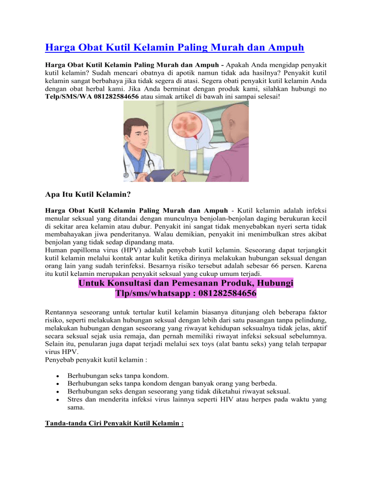 Harga Obat Kutil Kelamin Paling Murah dan Ampuh Harga Obat Kutil Kelamin Paling Murah dan Ampuh - Apakah Anda mengidap penyakit kutil kelamin? Sudah mencari obatnya di apotik namun tidak ada hasilnya? Penyakit kutil kelamin sangat berbahaya jika tidak segera di atasi. Segera obati penyakit kutil kelamin Anda dengan obat herbal kami. Jika Anda berminat dengan produk kami, silahkan hubungi no Telp/SMS/WA 081282584656 atau simak artikel di bawah ini sampai selesai! Apa Itu Kutil Kelamin? Harga Obat Kutil Kelamin Paling Murah dan Ampuh - Kutil kelamin adalah infeksi menular seksual yang ditandai dengan munculnya benjolan-benjolan daging berukuran kecil di sekitar area kelamin atau dubur. Penyakit ini sangat tidak menyebabkan nyeri serta tidak membahayakan jiwa penderitanya. Walau demikian, penyakit ini menimbulkan stres akibat benjolan yang tidak sedap dipandang mata. Human papilloma virus (HPV) adalah penyebab kutil kelamin. Seseorang dapat terjangkit kutil kelamin melalui kontak antar kulit ketika dirinya melakukan hubungan seksual dengan orang lain yang sudah terinfeksi. Besarnya risiko tersebut adalah sebesar 66 persen. Karena itu kutil kelamin merupakan penyakit seksual yang cukup umum terjadi. Untuk Konsultasi dan Pemesanan Produk, Hubungi Tlp/sms/whatsapp : 081282584656 Rentannya seseorang untuk tertular kutil kelamin biasanya ditunjang oleh beberapa faktor risiko, seperti melakukan hubungan seksual dengan lebih dari satu pasangan tanpa pelindung, melakukan hubungan dengan seseorang yang riwayat kehidupan seksualnya tidak jelas, aktif secara seksual sejak usia remaja, dan pernah memiliki riwayat infeksi seksual sebelumnya. Selain itu, penularan juga dapat terjadi melalui sex toys (alat bantu seks) yang telah terpapar virus HPV. Penyebab penyakit kutil kelamin : Berhubungan seks tanpa kondom. Berhubungan seks tanpa kondom dengan banyak orang yang berbeda. Berhubungan seks dengan seseorang yang tidak diketahui riwayat seksual. Stres dan menderita infeksi virus lainnya seperti HIV atau herpes pada waktu yang sama. Tanda-tanda Ciri Penyakit Kutil Kelamin : Harga Obat Kutil Kelamin Paling Murah dan Ampuh - Berikut Ciri ciri kutil kelamin pada wanita (Kondiloma Akuminata) atau jengger ayam ini bisa jadi penyakit paling mematikan dunia jika tidak segera di obati. Tidak hanya wanita sajayang patut mewaspadai tentang penyakit kutil kelamin ini, pria pun harus waspada pada munculnya kutil di kelamin tersebut. Berikut ini tanda-tanda atau ciri -ciri kutil kelamin beserta munculnya penyakit kutil kelamin atau jengger ayam yang patut di waspadai : Munculnya Benjolan di kelamin secara bergerombol Benjolan berisi daging Bentuk benjolan kecil Bengkak Kemerahan Menyerupai Jengger Ayam Menyerupai Kembang Kol Terasa Gatal Tidak Nyaman Pendarahan Nyeri Berbau Perih Kutil bisa berdarah Pada wanita muncul di bibir vagina, serviks, vagina Warna Kutil di kelamin hitam agak kemerahan, abu-abu agak kemerahan, cokelat agak kemerahan dan juga merah. Daerah penyebaran kutil kelamin pada Pria: Batang penis. Ujung kepala penis. Selangkangan. Paha bagian atas. Disekitar anus atau bisa didalamnya. Di dalam Uretra. Daerah penyebaran kutil kelamin pada Wanita: Anus. Vulva. Bagian antara anus dan kelamin. Leher Rahim. Paha bagian atas. Bagaimana cara mencegah Penyakit Kutil Kelamin? Untuk mengurangi risiko infeksi kutil kelamin bisa dilakukan dengan berbagai cara, antara lain : Gunakan kondom dengan benar setiap kali Anda berhubungan seks. Setia terhadap pasangan, jangan berganti-ganti partner seks. Membatasi kontak seksual hanya dengan satu pasangan yang benar-benar steril. Pertanyaan yang sering terpikirkan di benak Anda : Jika Saya terlanjur kena kutil kelamin bagaimana cara mengobatinya? Bagaimana cara mengobati kutil kelamin dengan cepat dan tuntas? Bagaimana berobat yang mudah tanpa perlu malu untuk ke dokter? Jawabannya: semua bisa, asal Anda memilih produk yang tepat, yaitu Gang Jie Gho Siah Pipeca dan Kapsul BD De Nature. Pengobatan Penyakit Kutil Kelamin Harga Obat Kutil Kelamin Paling Murah dan Ampuh - Pengobatan Kutil Kelamin secara tradisional yaitu dengan menggunakan Obat Kutil Kelamin dari De Nature. Produk yang terbuat dari bahan herbal alami diramu dengan resep tradisional dan diolah secara teknologi modern, sehingga aman di konsumsi. Jadi anda juga tak perlu khawatir karena Obat Herbal De Nature yang kami tawarkan ini, Alhamdulillah, merupakan obat yang telah banyak menyembuhkan penderitanya baik dari dalam maupun luar negeri. Sudah banyak pasien kami yang merasakan kesembuhannya dengan mengonsumsi obat herbal dari De Nature. Rp 950.000,Pemesanan obat hubungi tlp/sms/whatsapp : 081282584656 Sekedar informasi untuk kenyamanan Konsumen, bahwa Produk dari perusahaan kami ini sudah memiliki: Ijin Resmi Perusahaan dari Kementerian Kesehatan Ijin BPOM, yang artinya sudah lulus uji stabilitas Produk Sertifikat Halal MUI, sehingga halal bisa dipertanggungjawabkan Apoteker yang sudah berpengalaman Sudah melewati Proses Sortir Bahan Baku, Guna Menjaga Mutu Produk Proses Produksi Sesuai Alur CPOTB (Cara Pembuatan Obat Tradisional Yang Baik Dan Benar). Cara Pembelian: Pembayaran terlebih dulu via transfer Bank, setelah transfer SMS-kan konfirmasinya untuk proses pengiriman. Format Pemesanan: Nama, Alamat Lengkap beserta kode Pos, Nama Bank / Rekening anda, Nominal transfer, Nama Obat yg dipesan, No.Hp Anda Agar pesanan Anda bisa segera diproses, segera konfirmasikan pembayaran Anda via Telp/SMS/WA ke 081282584656 Setelah itu barang kami kirim melalui TIKI / JNE / J&T / POS. CONTOH SMS KONFIRMASI: Ahmad Husein, Jl.Raya Perumas Cendana Asri No.95, Kecamatan Majenang, Kabupaten Cilacap, Provinsi Jawa Tengah Kode Pos 53257, Rekening Pentransfer atas Nama Ahmad Husein, Transfer 320rb, Obat Eksim, 081xxxxxxxxx INFO LENGKAP HUBUNGI KAMI: Telp/SMS/WA ke 081282584656 Sistem Pembayaran : Nikmati pembayaran yang aman dan nyaman melalui Bank BRI, BNI, BCA, dan Mandiri. Jasa Pengiriman : Barang Kami Kirim via POS, JNE atau TIK