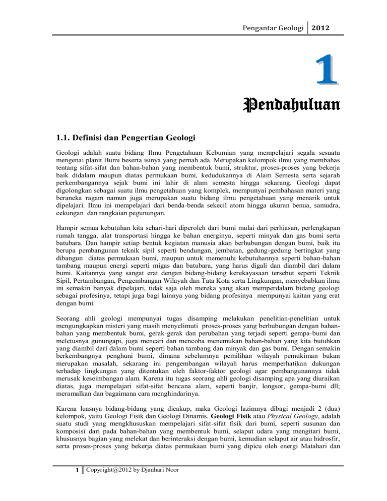 Pengantar Geologi 2012 1 Pendahuluan 1.1. Definisi dan Pengertian Geologi Geologi adalah suatu bidang Ilmu Pengetahuan Kebumian yang mempelajari segala sesuatu mengenai planit Bumi beserta isinya yang pernah ada. Merupakan kelompok ilmu yang membahas tentang sifat-sifat dan bahan-bahan yang membentuk bumi, struktur, proses-proses yang bekerja baik didalam maupun diatas permukaan bumi, kedudukannya di Alam Semesta serta sejarah perkembangannya sejak bumi ini lahir di alam semesta hingga sekarang. Geologi dapat digolongkan sebagai suatu ilmu pengetahuan yang komplek, mempunyai pembahasan materi yang beraneka ragam namun juga merupakan suatu bidang ilmu pengetahuan yang menarik untuk dipelajari. Ilmu ini mempelajari dari benda-benda sekecil atom hingga ukuran benua, samudra, cekungan dan rangkaian pegunungan. Hampir semua kebutuhan kita sehari-hari diperoleh dari bumi mulai dari perhiasan, perlengkapan rumah tangga, alat transportasi hingga ke bahan energinya, seperti minyak dan gas bumi serta batubara. Dan hampir setiap bentuk kegiatan manusia akan berhubungan dengan bumi, baik itu berupa pembangunan teknik sipil seperti bendungan, jembatan, gedung-gedung bertingkat yang dibangun diatas permukaan bumi, maupun untuk memenuhi kebutuhannya seperti bahan-bahan tambang maupun energi seperti migas dan batubara, yang harus digali dan diambil dari dalam bumi. Kaitannya yang sangat erat dengan bidang-bidang kerekayasaan tersebut seperti Teknik Sipil, Pertambangan, Pengembangan Wilayah dan Tata Kota serta Lingkungan, menyebabkan ilmu ini semakin banyak dipelajari, tidak saja oleh mereka yang akan memperdalam bidang geologi sebagai profesinya, tetapi juga bagi lainnya yang bidang profesinya mempunyai kaitan yang erat dengan bumi. Seorang ahli geologi mempunyai tugas disamping melakukan penelitian-penelitian untuk mengungkapkan misteri yang masih menyelimuti proses-proses yang berhubungan dengan bahanbahan yang membentuk bumi, gerak-gerak dan perubahan yang terjadi seperti gempa-bumi dan meletusnya gunungapi, juga mencari dan mencoba menemukan bahan-bahan yang kita butuhkan yang diambil dari dalam bumi seperti bahan tambang dan minyak dan gas bumi. Dengan semakin berkembangnya penghuni bumi, dimana sebelumnya pemilihan wilayah pemukiman bukan merupakan masalah, sekarang ini pengembangan wilayah harus memperhatikan dukungan terhadap lingkungan yang ditentukan oleh faktor-faktor geologi agar pembangunannya tidak merusak keseimbangan alam. Karena itu tugas seorang ahli geologi disamping apa yang diuraikan diatas, juga mempelajari sifat-sifat bencana alam, seperti banjir, longsor, gempa-bumi dll; meramalkan dan bagaimana cara menghindarinya. Karena luasnya bidang-bidang yang dicakup, maka Geologi lazimnya dibagi menjadi 2 (dua) kelompok, yaitu Geologi Fisik dan Geologi Dinamis. Geologi Fisik atau Physical Geology, adalah suatu studi yang mengkhususkan mempelajari sifat-sifat fisik dari bumi, seperti susunan dan komposisi dari pada bahan-bahan yang membentuk bumi, selaput udara yang mengitari bumi, khususnya bagian yang melekat dan berinteraksi dengan bumi, kemudian selaput air atau hidrosfir, serta proses-proses yang bekerja diatas permukaan bumi yang dipicu oleh energi Matahari dan 1 Copyright@2012 by Djauhari Noor Pengantar Geologi 2012 tarikan gayaberat bumi. Proses-proses yang dimaksud itu, dapat dijabarkan sebagai pelapukan, pengikisan, pemindahan dan pengendapan. Dalam skema dibawah ini diperlihatkan hubungan yang saling berinteraksi dan saling mempengaruhi antara Litosfir yang merupakan bagian paling luar dari Bumi yang bersifat padat, dengan Atmosfir (udara) dan Hidrosfir (selaput air), yang kemudian menciptakan Biosfir yang merupakan bagian dari Bumi dimana terdapat interaksi antara ketiganya dan kehidupan di Bumi. Interaksi ini menyebabkan sifat bumi yang dinamis. Kedalam Biosfir itu termasuk semua jenis kehidupan yang ada di Bumi. Dan semuanya itu terkumpul dalam lapisan atau zona yang dimulai dari dasar samudra keatas dan menembus hingga beberapa kilometer kedalam Atmosfir. Kemudian tepat dibawah Atmosfir dan samudra terdapat bagian yang keras dari bumi yang disebut Litosfir. ATMOSFIR BIOSFIR HIDROSFIR LITOSFIR Gambar 1-1 Interaksi antara Litosfir, Hidrosfir, Biosfir dan Atmosfir Disisi lain, Geologi Dinamis adalah bagian dari Ilmu Geologi yang mempelajari dan membahas tentang sifat-sifat dinamika bumi. Sisi ini berhubungan dengan perubahan-perubahan pada bagian bumi yang diakibatkan oleh gaya-gaya yang dipicu oleh energi yang bersumber dari dalam bumi, seperti kegiatan magma yang menghasilkan vulkanisma, gerak-gerak litosfir akibat adanya arus konveksi, gempabumi dan gerak-gerak pembentukan cekungan pengendapan dan pegunungan. Dalam perioda abad ke 20, bagian dari ilmu geologi ini dapat dikatakan sedang berada dalam puncak perkembangannya yang semakin mempesona bagi para pakar ilmu kebumian, yaitu dengan dicetuskannya Konsep Tektonik Global Yang Baru (The New Global Tectonic) dengan Teori Tektonik Lempengnya. Teori ini telah menimbulkan suatu revolusi dalam pemikiran-pemikirannya dan telah banyak mempengaruhi cabang-cabang lainnya dari ilmu geologi seperti petrologi, stratigrafi, geologi struktur, tektonik serta implikasinya terhadap pembentukan cebakan mineral, minyak bumi dan sebagainya. 1.2. Sejarah Perkembangan Ilmu Geologi Pada awalnya, orang tertarik untuk mempelajari geologi hanya karena didorong oleh rasa keingin tahuan terhadap apa yang dilihat dan dirasakan disekitarnya. Hal ini dapat dilihat dari kenyataan dengan tersiratnya konsep-konsep terjadinya bumi di hampir semua budaya kuno dan dalam ajaran-ajaran agamanya. Proses-proses alam yang menakjubkan, seperti meletusnya gunung-api yang mengeluarkan bahan-bahan pijar dari dalam perut bumi, goncangan bumi yang menghancurkan segala yang ada dimuka bumi dsb, telah mendorong orang-orang untuk mencari jawabannya. Ilmu Geologi itu sendiri sebenarnya dapat dikatakan baru dimulai pada sekitar tahun 500 hingga 300 tahun sebelum Masehi, yang 