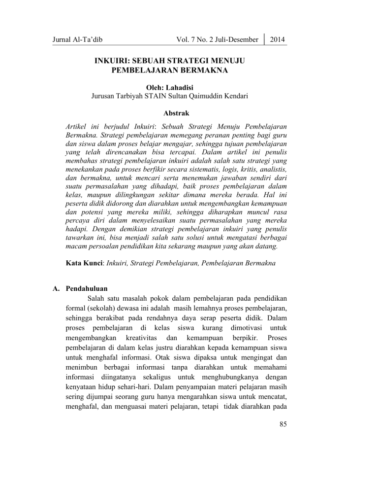 Jurnal Al-Ta’dib Vol. 7 No. 2 Juli-Desember 2014 INKUIRI: SEBUAH STRATEGI MENUJU PEMBELAJARAN BERMAKNA Oleh: Lahadisi Jurusan Tarbiyah STAIN Sultan Qaimuddin Kendari Abstrak Artikel ini berjudul Inkuiri: Sebuah Strategi Menuju Pembelajaran Bermakna. Strategi pembelajaran memegang peranan penting bagi guru dan siswa dalam proses belajar mengajar, sehingga tujuan pembelajaran yang telah direncanakan bisa tercapai. Dalam artikel ini penulis membahas strategi pembelajaran inkuiri adalah salah satu strategi yang menekankan pada proses berfikir secara sistematis, logis, kritis, analistis, dan bermakna, untuk mencari serta menemukan jawaban sendiri dari suatu permasalahan yang dihadapi, baik proses pembelajaran dalam kelas, maupun dilingkungan sekitar dimana mereka berada. Hal ini peserta didik didorong dan diarahkan untuk mengembangkan kemampuan dan potensi yang mereka miliki, sehingga diharapkan muncul rasa percaya diri dalam menyelesaikan suatu permasalahan yang mereka hadapi. Dengan demikian strategi pembelajaran inkuiri yang penulis tawarkan ini, bisa menjadi salah satu solusi untuk mengatasi berbagai macam persoalan pendidikan kita sekarang maupun yang akan datang. Kata Kunci: Inkuiri, Strategi Pembelajaran, Pembelajaran Bermakna A. Pendahuluan Salah satu masalah pokok dalam pembelajaran pada pendidikan formal (sekolah) dewasa ini adalah masih lemahnya proses pembelajaran, sehingga berakibat pada rendahnya daya serap peserta didik. Dalam proses pembelajaran di kelas siswa kurang dimotivasi untuk mengembangkan kreativitas dan kemampuan berpikir. Proses pembelajaran di dalam kelas justru diarahkan kepada kemampuan siswa untuk menghafal informasi. Otak siswa dipaksa untuk mengingat dan menimbun berbagai informasi tanpa diarahkan untuk memahami informasi diingatanya sekaligus untuk menghubungkanya dengan kenyataan hidup sehari-hari. Dalam penyampaian materi pelajaran masih sering dijumpai seorang guru hanya mengarahkan siswa untuk mencatat, menghafal, dan menguasai materi pelajaran, tetapi tidak diarahkan pada 85 2014 Vol. 7 No. 2 Juli-Desember Jurnal Al-Ta’dib proses berfikir analisis, kritis dan sistematis, dengan harapan siswa dapat mengembangkan kemampuan dan potensi yang mereka miliki. Berbagai persoalan pendidikan tersebut, mendasari munculnya paradigma baru dengan menawarkan berbagai macam strategi pembelajaran yang variatif yaitu: aktif, dan bermakna yang terfokus pada siswa (student centered). Adapun strategi yang penulis tawarkan dalam tulisan ini sebagai solusi terhadap permasalahan yang dikemukakan di atas adalah strategi pembelajaran inkuiri, dengan harapan akan tercipta pembelajaran bermakna yang memberi kebebasan dan kepercayaan kepada siswa, untuk mencari dan mengemukakan sendiri jawaban dalam setiap permasalahan yang ada, baik di dalam proses pembelajaran di kelas, maupun permasalahan yang ada dilingkungan dimana mereka berada. Strategi pembelajaran menurut Arthur L. Costa dalam Trianto “merupakan pola kegiatan pembelajaran berurutan yang diterapkan dari waktu kewaktu dan diarahkan untuk mencapai suatu hasil belajar siswa yang diinginkan.”1 Sedangkan startegi pembelajaran inkuiri adalah rangkaian kegiatan pembelajaran yang menekan pada proses berpikir secara kritis dan analistis untuk mencari dan menemukan sendiri jawaban dari suatu masalah yang dipertanyakan. Strategi pembelajaran inkuiri banyak dipengaruhi oleh aliran belajar kognitif yang dipelopori oleh Piaget. Menurut aliran ini, belajar pada hakikatnya adalah proses mental dan proses berpikir dengan memanfaatkan segala potensi yang dimiliki setiap individu secara optimal. Belajar lebih dari sekedar proses menghafal dan menumpuk ilmu pengetahuan, tetapi bagaimana pengetahuan yang diperolehnya bermakna untuk siswa melalui keterampilan berpikir. Teori belajar lain yang menjadi dasar strategi pembelajaran inkuiri adalah teori belajar konstruktivistik. Teori belajar ini dikembangkan oleh Piaget, bahwa pengetahuan itu bermakna manakala dicari dan ditemukan sendiri oleh siswa. Sejak kecil menurut Piaget, setiap individu berusaha dan mampu mengembangkan pengetahuan melalui skema yang ada dalam struktur kognitifnya. Skema itu secara terus menerus diperbarui dan diubah melalui proses asimilasi dan akomodasi. 1 Trianto, Model-Model Pembelajaran Inovatif Berorientasi Konstrutivistik, (Cet. I; Jakarta: Prestasi Pustaka, 2007) h, 129 86 Jurnal Al-Ta’dib Vol. 7 No. 2 Juli-Desember 2014 B. Konsep Dasar Strategi Pembelajaran 1. Pengertian Strategi Pembelajaran Secara umum strategi mempunyai pengertian sebagai suatu garis besar haluan dalam bertindak untuk mencapai sasaran yang telah ditentukkan. Strategi berasal dari bahasa Yunani yaitu Strategos artinya suatu usaha untuk mencapai kemenangan dalam suatu peperangan yang awalnya digunakan dalam lingkungan militer. Selanjutnya istilah strategi digunakan dalam berbagai bidang yang memiliki esensi relatif sama termaksud diadobsi dalam konteks pembelajaran yang dikenal dengan istilah strategi pembelajaran.2 Untuk memahami makna dan hakikat strategi pembelajaran kita simak pendapat yang dikemukakan para ahli antara lain: J.R David, Kemp dan Moedjiono dalam Masitoh dan Laksmi Dewi sebagai berikut : J.R David berpendapat bahwa strategi pembelajaran adalah perencanan yang berisi tentang rangkaian kegiatan yang di desain untuk mencapai tujuan pendidikan tertentu. Kemp mengatakan bahwa strategi pembelajaran adalah suatu kegiatan pembelajaran yang harus di kerjakan oleh guru dan siswa agar tujuan pembelajaran dapat di capai secara efektif dan efisien. Sedangkan moedjiono berpendapat bahwa strategi pembelajaran adalah kegiatan guru untuk memikirkan dan mengupayakan terjadinya antara aspek aspek dari komponen pembentuk sistem pembelajaran, dimana guru menggunakan siasat tertentu.3 Merujuk kepeda beberapa pendapat diatas, strategi pembelajaran dapat dimaknai secara sempit dan luas secara sempit strategi mempunyai kesamaan dengan metode yang berati cara untuk mencapai tujuan belajar yang telah