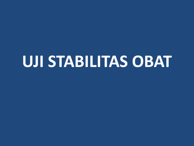 UJI STABILITAS OBAT PENGERTIAN UJI STABILITAS = melihat terjadinya perubahan kualitas sediaan obat dari waktu ke waktu dengan kata lain, melihat kestabilan kualitas sediaan obat selama waktu tertentu LATAR BELAKANG Kualitas sediaan obat dapat berubah selama ia disimpan. Bila perubahan itu terjadi, berarti obat tsb tidak boleh digunakan lagi (karena khasiatnya berkurang, bahkan bisa tidak aman dikonsumsi) Maka harus dilakukan uji stabilitas obat, agar dapat diketahui sampai kapan obat tsb bisa dikonsumsi TUJUAN UJI STABILITAS • Menentukan usia simpan produk → waktu kadaluarsa • Mendapat informasi tentang kondisi penyimpanan produk PARAMETER STABILITAS PRODUK • FISIKA misal : kekerasan tablet, kecepatan disolusi obat, homogenitas fase krim, kejernihan larutan, endapan suspensi, dll • KIMIA misal : kadar zat aktif, pH larutan • MIKROBIOLOGI misal : adanya mikroba (untuk produk steril) BENTUK SEDIAAN EVALUASI TABLET PENAMPILAN, BAU, WARNA, KADAR OBAT, PRODUK URAIAN, DISOLUSI, KELEMBABAN, DAN KEKERASAN/ KERAPUHAN KAPSUL PENAMPILAN, BAU DAN WARNA ISI KAPSUL, KADAR OBAT, PRODUK URAIAN, DISOLUSI, KELEMBABAN, KANDUNGAN MIKROBA EMULSI PENAMPILAN, PEMISAHAM FASE, WARNA, BAU, KADAR, PRODUK URAIAN, pH, VISKOSITAS, CEMARAN MIKROBA, DAYA PENGAWET, UKURAN RATA-RATA DAN DISTRIBUSI GLOBUL BENTUK SEDIAAN EVALUATION LARUTAN ORAL PEMBENTUKAN ENDAPAN, KEJERNIHAN, BAU, WARNA, KADAR OBAT, PRODUK URAIAN, pH, VISKOSITAS, CEMARAN MIKROBA, DAYA PENGAWET SUSPENSI IDEM LARUTAN ORAL + REDISPERSIBILITY, UKURAN PARTIKEL PADAT TOPIKAL DAN SEDIAAN MATA PENAMPILAN, KEJERNIHAN, BAU, WARNA, HOMOGENITAS, KADAR OBAT, pH, VISKOSITAS, UKURAN PARTIKEL PADAT, PRODUK URAIAN, KANDUNGAN PENGAWET DAN ANTIOKSIDAN, BATAS CEMARAN MIKROBA, STERILITAS (SEDIAAN MATA) JENIS-JENIS UJI STABILITAS REAL TIME PRODUK DISIMPAN PADA SUHU KAMAR, SAMPAI WAKTU KADALUARSANYA DIPERCEPAT PRODUK DISIMPAN DALAM WAKTU YANG LEBIH CEPAT, DGN CARA DISIMPAN PADA SUHU LEBIH TINGGI. • Pada uji stabilitas dipercepat, kita tidak usah menyimpan produk selama masa kadaluarsanya → hemat waktu • Dari hasil uji stabilitas dipercepat ini, dapat diramalkan stabilitas produk yang sebenarnya (pada suhu simpan normal/ suhu kamar) • Ketika sebuah pabrik ingin cepat-cepat mendapat nomor registrasi Badan POM (izin edar), maka syaratnya ada data hasil uji stabilitas produk dipercepat → jadi pabrik tidak usah menunggu waktu kadaluarsa produk yang lama • Namun, meskipun demikian, data hasil uji stabilitas real time harus ada (karena inilah stabilitas produk yang sesungguhnya) “hasil uji stabilitas dipercepat HANYA untuk MERAMALKAN stabilitas pada waktu sebenarnya” KONDISI UJI STABILITAS Pengujian Real Time Dipercepat Kondisi simpan suhu 25°C ; kelembaban 60% suhu 40°C ; kelembaban 75% Waktu simpan sampai kadaluarsa 6 bulan HUBUNGAN ANTARA HASIL UJI STABILITAS Usia simpan pada suhu 400C Usia simpan pada suhu 250C 3 bulan 1 tahun 6 bulan 2 tahun