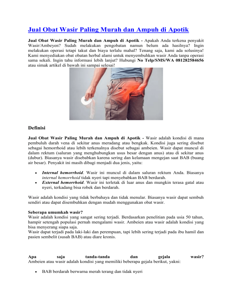 Jual Obat Wasir Paling Murah dan Ampuh di Apotik Jual Obat Wasir Paling Murah dan Ampuh di Apotik - Apakah Anda terkena penyakit Wasir/Ambeyen? Sudah melakukan pengobatan namun belum ada hasilnya? Ingin melakukan operasi tetapi takut dan biaya terlalu mahal? Tenang saja, kami ada solusinya! Kami menyediakan obat obatan herbal alami untuk menyembuhkan wasir Anda tanpa operasi sama sekali. Ingin tahu informasi lebih lanjut? Hubungi No Telp/SMS/WA 081282584656 atau simak artikel di bawah ini sampai selesai! Definisi Jual Obat Wasir Paling Murah dan Ampuh di Apotik - Wasir adalah kondisi di mana pembuluh darah vena di sekitar anus meradang atau bengkak. Kondisi juga sering disebut sebagai hemorrhoid atau lebih terkenalnya disebut sebagai ambeien. Wasir dapat muncul di dalam rektum (saluran yang menghubungkan usus besar dengan anus) atau di sekitar anus (dubur). Biasanya wasir disebabkan karena sering dan kelamaan mengejan saat BAB (buang air besar). Penyakit ini masih dibagi menjadi dua jenis, yaitu: Internal hemorrhoid. Wasir ini muncul di dalam saluran rektum Anda. Biasanya internal hemorrhoid tidak nyeri tapi menyebabkan BAB berdarah. External hemorrhoid. Wasir ini terletak di luar anus dan mungkin terasa gatal atau nyeri, terkadang bisa robek dan berdarah. Wasir adalah kondisi yang tidak berbahaya dan tidak menular. Biasanya wasir dapat sembuh sendiri atau dapat disembuhkan dengan mudah menggunakan obat wasir. Seberapa umumkah wasir? Wasir adalah kondisi yang sangat sering terjadi. Berdasarkan penelitian pada usia 50 tahun, hampir setengah populasi pernah mengalami wasir. Ambeien atau wasir adalah kondisi yang bisa menyerang siapa saja. Wasir dapat terjadi pada laki-laki dan perempuan, tapi lebih sering terjadi pada ibu hamil dan pasien sembelit (susah BAB) atau diare kronis. Apa saja tanda-tanda dan gejala Ambeien atau wasir adalah kondisi yang memiliki beberapa gejala berikut, yakni: BAB berdarah berwarna merah terang dan tidak nyeri wasir? Gatal dan iritasi pada area rektum Nyeri dan rasa tidak nyaman Bengkak di sekitar anus Benjolan yang sensitif atau nyeri di dekat anus Kondisi ambeien yang yang lebih sering menyebabkan rasa tidak nyaman dan nyeri yaitu external hemorrhoid. Internal hemorrhoid biasanya tidak menyebabkan rasa nyeri. Kemungkinan ada tanda-tanda dan gejala yang tidak disebutkan di atas. Bila Anda memiliki kekhawatiran akan sebuah gejala tertentu, konsultasikanlah dengan dokter Anda. Penyebab Penyebab wasir yaitu pembengkakan pembuluh darah vena. Pembengkakan bisa terjadi akibat meningkatnya tekanan di rektum bagian bawah. Faktor yang meningkatkan tekanan tersebut yaitu: Mengejan saat BAB Duduk terlalu lama Diare atau sembelit kronis Berat badan berlebih atau obesitas Hamil Kurang asupan makanan berserat Faktor-faktor risiko Wasir disebabkan oleh bengkaknya pembuluh darah vena akibat peningkatan tekanan di rektum bagian bawah. Faktor-faktor yang bisa menjadi penyebab wasir antara lain: 1. Sembelit kronis. Feses yang mengeras akibat sembelit membuat Anda harus mengeluarkan tenaga lebih banyak untuk mengejan. Tekanan ekstra tersebut akhirnya bisa memicu pembengkakan pembuluh darah di anus, menjadi penyebab wasir. 2. Kehamilan. Seiring usia kehamilan yang semakin membesar, rahim akan ikut berkembang mengikuti perkembangan janin. Tekanan rahim ini kemudian akan menekan pembuluh darah yang ada di usus besar hingga memicu munculnya benjolan di daerah anus. 3. Duduk terlalu lama. Kebiasaan duduk yang terlalu lama bisa menjadi penyebab wasir, sebab pembuluh darah di sekitar anus akan banyak terisi darah. Aliran darah yang konstan tersebut akhirnya akan menekan dinding pembuluh darah hingga semakin membesar. 4. Mengangkat benda berat. Berulang kali mengangkat benda yang berat bisa jadi penyebab wasir karena adanya penumpukan tekanan di bagian rektum yang akan memengaruhi aliran darah dan membuat pembuluh darah menjadi bengkak. 5. Usia. Kondisi tubuh yang semakin menua secara alami menyebabkan jaringan pembuluh darah di sekitar rektum dan anus semakin melemah dan meregang, sehingga rentan membengkak. Inilah yang akhirnya jadi penyebab wasir. Untuk Konsultasi dan Pemesanan Obat Hubungi No Telp/SMS/WA 081282584656 Siapa saja yang berisiko kena wasir? Ada banyak faktor risiko untuk wasir, yaitu: Memiliki pekerjaan yang mengharuskan Anda duduk atau berdiri dalam waktu yang lama. Mengalami diare atau sembelit kronis. Anda mengalami obesitas. Ibu hamil. Sering melakukan seks anal, yakni penetrasi lewat anus. Konsumsi makanan tinggi lemak dan rendah serat. Tingkatan Stadium Wasir Atau Sakit Ambeien Pada Ibu Hamil Wasir stadium 1 : Wasir Jenis ini Biasanya tidak Sampai prolaps. Rasanya Cuma kadang Kurang Nyaman Saat Buang Air Besar. Ambeien stadium 2 : bagian anus sudah bisa diraba ada benjolan, namun biasanya belum ada pendarahan. kadang ada rasa panas dan gatal Wasir stadium 3 : benjolan pada anus sudah besar dan susah masuk lagi harus dibantu dengan jari Ambeien stadium 4 : benjolan vena sudah besar sekali dan sering pendarahan, Obat ambeien alami Pertanyaan yang sering terpikirkan di benak Anda : Jika Saya terlanjur kena wasir bagaimana cara mengobatinya? Bagaimana cara mengobati wasir dengan cepat dan tuntas? Bagaimana berobat yang mudah tanpa perlu malu untuk ke dokter dan tanpa operasi? Jawabannya: semua bisa, asal Anda memilih produk yang tepat, yaitu Ambejoss dan Salep Salwa De Nature. Harga Rp 275.000 Anda ingin sembuh dari wasir? Segera hubungi tlp/sms/whatsapp : 081282584656 Sekedar informasi untuk kenyamanan Konsumen, bahwa Produk dari perusahaan kami ini sudah memiliki: Ijin Resmi Perusahaan dari Kementerian Kesehatan Ijin BPOM, yang artinya sudah lulus uji stabilitas Produk Sertifikat Halal MUI, sehingga halal bisa dipertanggungjawabkan Apoteker yang sudah berpengalaman Sudah melewati Proses Sortir Bahan Baku, Guna Menjaga Mutu Produk Proses Produksi Sesuai Alur CPOTB (Cara Pembuatan Obat Tradisional Yang Baik Dan Benar) Cara Pemesanan Pembayaran terlebih dulu via transfer