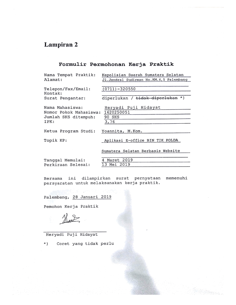 Lampiran 4 KERANGKA ACUAN Nama Tempat Praktik: Nama Penyelia: Jabatan Penyelia: Alamat: Telepon/Fax/Email: Polda Sumatera Selatan Drs.H.Abdul Latief Maulana Said, M.Si Kabid TIK Polda Sumatera Selatan Jl. Jendral Sudirman KM.4,5 Palembang 082178033300 Turut Memeriksa Laporan: YA / TIDAK *) Nama Mahasiswa: Heryadi Puji Hidayat, R. Putra Kurniawan Ramadhan Nomor Pokok Mahasiswa: 1620250051, 1620250065 Telepon/Fax/Email: 081377612327,082278194724 SKS semester berjalan: 17 SKS, 17 SKS Nama PEMBIMBING: Dr. Wijang Widhiarso, M.Kom Telepon/Fax/Email: Alamat: Judul/Topik/Tema: Uraian Singkat: Perkiraan Jangka Waktu: 081373555312/[email protected] Jl. Rajawali No. 14 Palembang Aplikasi Informasi BID TIK Polda Sumsel dan Fitur Chat Admin berbasis Website. Aplikasi ini digunakan untuk Membantu masyarakat dalam mencari berita informasi BID TIK Polda Sumsel dan 15 Polres berbeda serta mempermudah masyarakat dalam melakukan pengaduan masyarakat. 04 Maret 2019 s/d. 13 Mei 2019 GARIS BESAR RENCANA KERJA (per minggu) No Waktu Uraian Rencana Kerja 1. Minggu ke-1 a. Pengenalan lingkungan tempat kerja praktik. b. Wawancara mengenai sistem yang digunakan. c. Analisis masalah yang ada pada instansi. 2. Minggu ke-2 a. Berdiskusi dengan kebutuhan instansi penyelia mengenai terkait yang akan dibuat, seperti fitur-fitur pada aplikasi dalam menyelesaikan masalah yang ada. b. Mengumpulkan bahan yang diperlukan berupa data-data yang dibutuhkan untuk aplikasi tersebut, baik membuat melalui tanya jawab dan wawancara singkat. 3. Minggu ke-3 a. Membuat rancangan dibuat, serta website yang mendiskusikan akan dengan penyelia, agar didapat hasil yang sesuai keinginan. 4. Minggu ke-4 a. Merancang database sesuai dengan sistem dari instansi terkait. 5. Minggu ke-5 a. Mendesain aplikasi yang akan dibuat menggunakan framework Laravel 5.7, CSS, Uikit dan javascript. b. Mengimplementasikan rancangan ke dalam pengkodean. c. Melakukan perbaikan di bagian yang error. 6. Minggu ke-6 a. Melanjutkan pengkodean aplikasi. b. Menambahkan efek animasi dan visualisasi. c. Melakukan perbaikan di bagian yang error. 7. Minggu ke-7 a. Melanjutkan pengkodean aplikasi. b. Melakukan perbaikan di bagian yang error. c. Melakukan pengujian terhadap aplikasi yang telah dibuat. 8. Minggu ke-8 a. Menyelesaikan pembuatan aplikasi. b. Merevisi fitur-fitur yang dianggap kurang sesuai dengan kebutuhan. c. Melakukan perbaikan error. 9. Minggu ke-9 10. Minggu ke-10 a. Melakukan revisi dari kesalahan program. a. Menyelesaikan revisi aplikasi dan laporan akhir Kerja Praktik. b. Melakukan hosting serta melakukan pelatihan pada Admin dan Operator Polda Sumatera Selatan. FORMULIR LOG HARIAN KERJA PRAKTIK Program Studi Teknik Informatika NPM Lokasi KP 1620250051 Nama Polda Sumatera Selatan Judul Aplikasi Informasi BID TIK Polda Sumsel dan Fitur Mailbox berbasis Website Penyelia Pembimbing Heryadi Puji Hidayat Drs. H. Abdul Latief Maulana Said, M.Si Dr. Wijang Widhiarso, M.Kom Minggu I No. 1. Tanggal Waktu 04 Maret 2019 08:00 – 14:00 WIB Uraian Kegiatan 2. 05 Maret 2019 08:00 – 14:00 WIB 3. 06 Maret 2019 08:00 – 14:00 WIB 4. 07 Maret 2019 08:00 - 14:00 WIB 5. 08 Maret 2019 08:00 – 14:00 WIB Keterangan Pengenalan lingkungan tempat kerja praktik. Wawancara mengenai sistem yang digunakan. Sesuai KAKP Melanjutkan lingkungan. Mempelajari digunakan. Sesuai KAKP pengenalan sistem yang Melanjutkan mempelajari sistem yang digunakan. Melakukan wawancara kepada penyelia untuk mendapatkan masalah yang ada pada sistem. Sesuai KAKP Melanjutkan mempelajari sistem yang digunakan. Melakukan analisis sistem lebih lanjut terhadap masalah yang ada pada instansi. Sesuai KAKP Memberikan beberapa solusi kepada penyelia sebagai pemecahan masalah terhadap sistem. Melanjutkan mempelajari sistem yang digunakan. Penjelasan gambaran aplikasi yang akan dibuat kepada penyelia. Sesuai KAKP Program Studi Teknik Informatika FORMULIR LOG HARIAN KERJA PRAKTIK FORMULIR LOG HARIAN KERJA PRAKTIK Program Studi Teknik Informatika NPM Lokasi KP 1620250065 Nama Polda Sumatera Selatan Judul Aplikasi Informasi BID TIK Polda Sumsel dan Fitur Mailbox berbasis Website Penyelia Pembimbing Raden Putra Kurniawan Ramadhan Drs. H. Abdul Latief Maulana Said, M.Si Dr. Wijang Widhiarso, M.Kom Minggu I No. 1. Tanggal Waktu 04 Maret 2019 08:00 – 14:00 WIB Uraian Kegiatan 2. 05 Maret 2019 08:00 – 14:00 WIB 3. 06 Maret 2019 08:00 – 14:00 WIB 4. 07 Maret 2019 08:00 - 14:00 WIB 5. 08 Maret 2019 08:00 – 14:00 WIB Keterangan Pengenalan lingkungan tempat kerja praktik. Wawancara mengenai sistem yang digunakan. Sesuai KAKP Melanjutkan lingkungan. Mempelajari digunakan. Sesuai KAKP pengenalan sistem yang Melanjutkan mempelajari sistem yang digunakan. Melakukan wawancara kepada penyelia untuk mendapatkan masalah yang ada pada sistem. Sesuai KAKP Melanjutkan mempelajari sistem yang digunakan. Melakukan analisis sistem lebih lanjut terhadap masalah yang ada pada instansi. Sesuai KAKP Memberikan beberapa solusi kepada penyelia sebagai pemecahan masalah terhadap sistem. Melanjutkan mempelajari sistem yang digunakan. Penjelasan gambaran aplikasi yang akan dibuat kepada penyelia. Sesuai KAKP Program Studi Teknik Informatika FORMULIR LOG HARIAN KERJA PRAKTIK FORMULIR LOG HARIAN KERJA PRAKTIK Program Studi Teknik Informatika NPM Lokasi KP 1620250051 Nama Polda Sumatera Selatan Judul Aplikasi Informasi BID TIK Polda Sumsel dan Fitur Mailbox berbasis Website Penyelia Pembimbing Heryadi Puji Hidayat Drs. H. Abdul Latief Maulana Said, M.Si Dr. Wijang Widhiarso, M.Kom Minggu II No. 1. Tanggal Waktu 11 Maret 2019 08:00 – 14:00 WIB Uraian Kegiatan 2. 12 Maret 2019 08:00 – 14:00 WIB 3. 13 Maret 2019 08:00 – 14:00 WIB Keterangan Melakukan wawancara dan diskusi mengenai fitur-fitur yang dibutuhkan pada aplikasi yang akan dibuat. Melakukan diskusi mengenai tampilan tatap muka pengguna / UI (User Interface) dan informasi apasaja yang akan ditampilkan pada aplikasi website dengan penyelia. Sesuai KAKP Melakukan tanya jawab dan waw