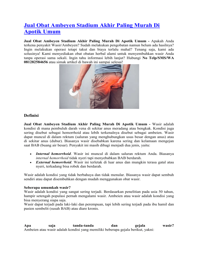 Jual Obat Ambeyen Stadium Akhir Paling Murah Di Apotik Umum Jual Obat Ambeyen Stadium Akhir Paling Murah Di Apotik Umum - Apakah Anda terkena penyakit Wasir/Ambeyen? Sudah melakukan pengobatan namun belum ada hasilnya? Ingin melakukan operasi tetapi takut dan biaya terlalu mahal? Tenang saja, kami ada solusinya! Kami menyediakan obat obatan herbal alami untuk menyembuhkan wasir Anda tanpa operasi sama sekali. Ingin tahu informasi lebih lanjut? Hubungi No Telp/SMS/WA 081282584656 atau simak artikel di bawah ini sampai selesai! Definisi Jual Obat Ambeyen Stadium Akhir Paling Murah Di Apotik Umum - Wasir adalah kondisi di mana pembuluh darah vena di sekitar anus meradang atau bengkak. Kondisi juga sering disebut sebagai hemorrhoid atau lebih terkenalnya disebut sebagai ambeien. Wasir dapat muncul di dalam rektum (saluran yang menghubungkan usus besar dengan anus) atau di sekitar anus (dubur). Biasanya wasir disebabkan karena sering dan kelamaan mengejan saat BAB (buang air besar). Penyakit ini masih dibagi menjadi dua jenis, yaitu: Internal hemorrhoid. Wasir ini muncul di dalam saluran rektum Anda. Biasanya internal hemorrhoid tidak nyeri tapi menyebabkan BAB berdarah. External hemorrhoid. Wasir ini terletak di luar anus dan mungkin terasa gatal atau nyeri, terkadang bisa robek dan berdarah. Wasir adalah kondisi yang tidak berbahaya dan tidak menular. Biasanya wasir dapat sembuh sendiri atau dapat disembuhkan dengan mudah menggunakan obat wasir. Seberapa umumkah wasir? Wasir adalah kondisi yang sangat sering terjadi. Berdasarkan penelitian pada usia 50 tahun, hampir setengah populasi pernah mengalami wasir. Ambeien atau wasir adalah kondisi yang bisa menyerang siapa saja. Wasir dapat terjadi pada laki-laki dan perempuan, tapi lebih sering terjadi pada ibu hamil dan pasien sembelit (susah BAB) atau diare kronis. Apa saja tanda-tanda dan gejala Ambeien atau wasir adalah kondisi yang memiliki beberapa gejala berikut, yakni: wasir? BAB berdarah berwarna merah terang dan tidak nyeri Gatal dan iritasi pada area rektum Nyeri dan rasa tidak nyaman Bengkak di sekitar anus Benjolan yang sensitif atau nyeri di dekat anus Kondisi ambeien yang yang lebih sering menyebabkan rasa tidak nyaman dan nyeri yaitu external hemorrhoid. Internal hemorrhoid biasanya tidak menyebabkan rasa nyeri. Kemungkinan ada tanda-tanda dan gejala yang tidak disebutkan di atas. Bila Anda memiliki kekhawatiran akan sebuah gejala tertentu, konsultasikanlah dengan dokter Anda. Penyebab Penyebab wasir yaitu pembengkakan pembuluh darah vena. Pembengkakan bisa terjadi akibat meningkatnya tekanan di rektum bagian bawah. Faktor yang meningkatkan tekanan tersebut yaitu: Mengejan saat BAB Duduk terlalu lama Diare atau sembelit kronis Berat badan berlebih atau obesitas Hamil Kurang asupan makanan berserat Faktor-faktor risiko Wasir disebabkan oleh bengkaknya pembuluh darah vena akibat peningkatan tekanan di rektum bagian bawah. Faktor-faktor yang bisa menjadi penyebab wasir antara lain: 1. Sembelit kronis. Feses yang mengeras akibat sembelit membuat Anda harus mengeluarkan tenaga lebih banyak untuk mengejan. Tekanan ekstra tersebut akhirnya bisa memicu pembengkakan pembuluh darah di anus, menjadi penyebab wasir. 2. Kehamilan. Seiring usia kehamilan yang semakin membesar, rahim akan ikut berkembang mengikuti perkembangan janin. Tekanan rahim ini kemudian akan menekan pembuluh darah yang ada di usus besar hingga memicu munculnya benjolan di daerah anus. 3. Duduk terlalu lama. Kebiasaan duduk yang terlalu lama bisa menjadi penyebab wasir, sebab pembuluh darah di sekitar anus akan banyak terisi darah. Aliran darah yang konstan tersebut akhirnya akan menekan dinding pembuluh darah hingga semakin membesar. 4. Mengangkat benda berat. Berulang kali mengangkat benda yang berat bisa jadi penyebab wasir karena adanya penumpukan tekanan di bagian rektum yang akan memengaruhi aliran darah dan membuat pembuluh darah menjadi bengkak. 5. Usia. Kondisi tubuh yang semakin menua secara alami menyebabkan jaringan pembuluh darah di sekitar rektum dan anus semakin melemah dan meregang, sehingga rentan membengkak. Inilah yang akhirnya jadi penyebab wasir. Untuk Konsultasi dan Pemesanan Obat Hubungi No Telp/SMS/WA 081282584656 Siapa saja yang berisiko kena wasir? Ada banyak faktor risiko untuk wasir, yaitu: Memiliki pekerjaan yang mengharuskan Anda duduk atau berdiri dalam waktu yang lama. Mengalami diare atau sembelit kronis. Anda mengalami obesitas. Ibu hamil. Sering melakukan seks anal, yakni penetrasi lewat anus. Konsumsi makanan tinggi lemak dan rendah serat. Tingkatan Stadium Wasir Atau Sakit Ambeien Pada Ibu Hamil Wasir stadium 1 : Wasir Jenis ini Biasanya tidak Sampai prolaps. Rasanya Cuma kadang Kurang Nyaman Saat Buang Air Besar. Ambeien stadium 2 : bagian anus sudah bisa diraba ada benjolan, namun biasanya belum ada pendarahan. kadang ada rasa panas dan gatal Wasir stadium 3 : benjolan pada anus sudah besar dan susah masuk lagi harus dibantu dengan jari Ambeien stadium 4 : benjolan vena sudah besar sekali dan sering pendarahan, Obat ambeien alami Pertanyaan yang sering terpikirkan di benak Anda : Jika Saya terlanjur kena wasir bagaimana cara mengobatinya? Bagaimana cara mengobati wasir dengan cepat dan tuntas? Bagaimana berobat yang mudah tanpa perlu malu untuk ke dokter dan tanpa operasi? Jawabannya: semua bisa, asal Anda memilih produk yang tepat, yaitu Ambejoss dan Salep Salwa De Nature. Harga Rp 275.000 Anda ingin sembuh dari wasir? Segera hubungi tlp/sms/whatsapp : 081282584656 Sekedar informasi untuk kenyamanan Konsumen, bahwa Produk dari perusahaan kami ini sudah memiliki: Ijin Resmi Perusahaan dari Kementerian Kesehatan Ijin BPOM, yang artinya sudah lulus uji stabilitas Produk Sertifikat Halal MUI, sehingga halal bisa dipertanggungjawabkan Apoteker yang sudah berpengalaman Sudah melewati Proses Sortir Bahan Baku, Guna Menjaga Mutu Produk Proses Produksi Sesuai Alur CPOTB (Cara Pembuatan Obat Tradisional Yang Baik Dan Benar) Cara Pemesanan Pemb