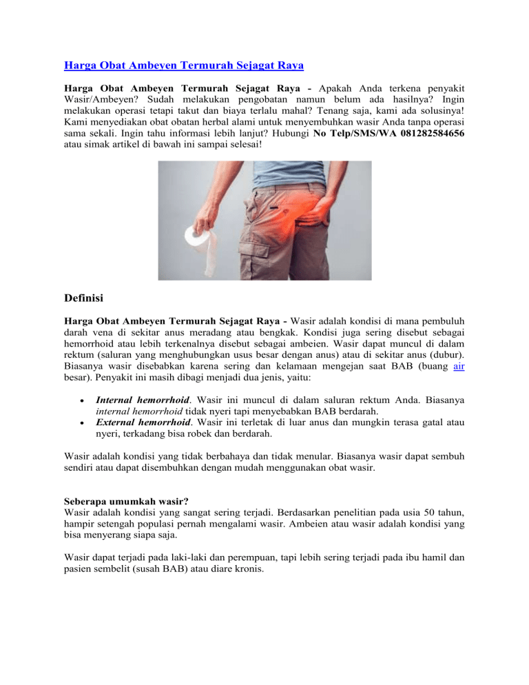 Harga Obat Ambeyen Termurah Sejagat Raya Harga Obat Ambeyen Termurah Sejagat Raya - Apakah Anda terkena penyakit Wasir/Ambeyen? Sudah melakukan pengobatan namun belum ada hasilnya? Ingin melakukan operasi tetapi takut dan biaya terlalu mahal? Tenang saja, kami ada solusinya! Kami menyediakan obat obatan herbal alami untuk menyembuhkan wasir Anda tanpa operasi sama sekali. Ingin tahu informasi lebih lanjut? Hubungi No Telp/SMS/WA 081282584656 atau simak artikel di bawah ini sampai selesai! Definisi Harga Obat Ambeyen Termurah Sejagat Raya - Wasir adalah kondisi di mana pembuluh darah vena di sekitar anus meradang atau bengkak. Kondisi juga sering disebut sebagai hemorrhoid atau lebih terkenalnya disebut sebagai ambeien. Wasir dapat muncul di dalam rektum (saluran yang menghubungkan usus besar dengan anus) atau di sekitar anus (dubur). Biasanya wasir disebabkan karena sering dan kelamaan mengejan saat BAB (buang air besar). Penyakit ini masih dibagi menjadi dua jenis, yaitu: Internal hemorrhoid. Wasir ini muncul di dalam saluran rektum Anda. Biasanya internal hemorrhoid tidak nyeri tapi menyebabkan BAB berdarah. External hemorrhoid. Wasir ini terletak di luar anus dan mungkin terasa gatal atau nyeri, terkadang bisa robek dan berdarah. Wasir adalah kondisi yang tidak berbahaya dan tidak menular. Biasanya wasir dapat sembuh sendiri atau dapat disembuhkan dengan mudah menggunakan obat wasir. Seberapa umumkah wasir? Wasir adalah kondisi yang sangat sering terjadi. Berdasarkan penelitian pada usia 50 tahun, hampir setengah populasi pernah mengalami wasir. Ambeien atau wasir adalah kondisi yang bisa menyerang siapa saja. Wasir dapat terjadi pada laki-laki dan perempuan, tapi lebih sering terjadi pada ibu hamil dan pasien sembelit (susah BAB) atau diare kronis. Apa saja tanda-tanda dan gejala Ambeien atau wasir adalah kondisi yang memiliki beberapa gejala berikut, yakni: wasir? BAB berdarah berwarna merah terang dan tidak nyeri Gatal dan iritasi pada area rektum Nyeri dan rasa tidak nyaman Bengkak di sekitar anus Benjolan yang sensitif atau nyeri di dekat anus Kondisi ambeien yang yang lebih sering menyebabkan rasa tidak nyaman dan nyeri yaitu external hemorrhoid. Internal hemorrhoid biasanya tidak menyebabkan rasa nyeri. Kemungkinan ada tanda-tanda dan gejala yang tidak disebutkan di atas. Bila Anda memiliki kekhawatiran akan sebuah gejala tertentu, konsultasikanlah dengan dokter Anda. Penyebab Penyebab wasir yaitu pembengkakan pembuluh darah vena. Pembengkakan bisa terjadi akibat meningkatnya tekanan di rektum bagian bawah. Faktor yang meningkatkan tekanan tersebut yaitu: Mengejan saat BAB Duduk terlalu lama Diare atau sembelit kronis Berat badan berlebih atau obesitas Hamil Kurang asupan makanan berserat Faktor-faktor risiko Wasir disebabkan oleh bengkaknya pembuluh darah vena akibat peningkatan tekanan di rektum bagian bawah. Faktor-faktor yang bisa menjadi penyebab wasir antara lain: 1. Sembelit kronis. Feses yang mengeras akibat sembelit membuat Anda harus mengeluarkan tenaga lebih banyak untuk mengejan. Tekanan ekstra tersebut akhirnya bisa memicu pembengkakan pembuluh darah di anus, menjadi penyebab wasir. 2. Kehamilan. Seiring usia kehamilan yang semakin membesar, rahim akan ikut berkembang mengikuti perkembangan janin. Tekanan rahim ini kemudian akan menekan pembuluh darah yang ada di usus besar hingga memicu munculnya benjolan di daerah anus. 3. Duduk terlalu lama. Kebiasaan duduk yang terlalu lama bisa menjadi penyebab wasir, sebab pembuluh darah di sekitar anus akan banyak terisi darah. Aliran darah yang konstan tersebut akhirnya akan menekan dinding pembuluh darah hingga semakin membesar. 4. Mengangkat benda berat. Berulang kali mengangkat benda yang berat bisa jadi penyebab wasir karena adanya penumpukan tekanan di bagian rektum yang akan memengaruhi aliran darah dan membuat pembuluh darah menjadi bengkak. 5. Usia. Kondisi tubuh yang semakin menua secara alami menyebabkan jaringan pembuluh darah di sekitar rektum dan anus semakin melemah dan meregang, sehingga rentan membengkak. Inilah yang akhirnya jadi penyebab wasir. Untuk Konsultasi dan Pemesanan Obat Hubungi No Telp/SMS/WA 081282584656 Siapa saja yang berisiko kena wasir? Ada banyak faktor risiko untuk wasir, yaitu: Memiliki pekerjaan yang mengharuskan Anda duduk atau berdiri dalam waktu yang lama. Mengalami diare atau sembelit kronis. Anda mengalami obesitas. Ibu hamil. Sering melakukan seks anal, yakni penetrasi lewat anus. Konsumsi makanan tinggi lemak dan rendah serat. Tingkatan Stadium Wasir Atau Sakit Ambeien Pada Ibu Hamil Wasir stadium 1 : Wasir Jenis ini Biasanya tidak Sampai prolaps. Rasanya Cuma kadang Kurang Nyaman Saat Buang Air Besar. Ambeien stadium 2 : bagian anus sudah bisa diraba ada benjolan, namun biasanya belum ada pendarahan. kadang ada rasa panas dan gatal Wasir stadium 3 : benjolan pada anus sudah besar dan susah masuk lagi harus dibantu dengan jari Ambeien stadium 4 : benjolan vena sudah besar sekali dan sering pendarahan, Obat ambeien alami Pertanyaan yang sering terpikirkan di benak Anda : Jika Saya terlanjur kena wasir bagaimana cara mengobatinya? Bagaimana cara mengobati wasir dengan cepat dan tuntas? Bagaimana berobat yang mudah tanpa perlu malu untuk ke dokter dan tanpa operasi? Jawabannya: semua bisa, asal Anda memilih produk yang tepat, yaitu Ambejoss dan Salep Salwa De Nature. Harga Rp 275.000 Anda ingin sembuh dari wasir? Segera hubungi tlp/sms/whatsapp : 081282584656 Sekedar informasi untuk kenyamanan Konsumen, bahwa Produk dari perusahaan kami ini sudah memiliki: Ijin Resmi Perusahaan dari Kementerian Kesehatan Ijin BPOM, yang artinya sudah lulus uji stabilitas Produk Sertifikat Halal MUI, sehingga halal bisa dipertanggungjawabkan Apoteker yang sudah berpengalaman Sudah melewati Proses Sortir Bahan Baku, Guna Menjaga Mutu Produk Proses Produksi Sesuai Alur CPOTB (Cara Pembuatan Obat Tradisional Yang Baik Dan Benar) Cara Pemesanan Pembayaran terlebih dulu via transfer Bank, setelah transfer 