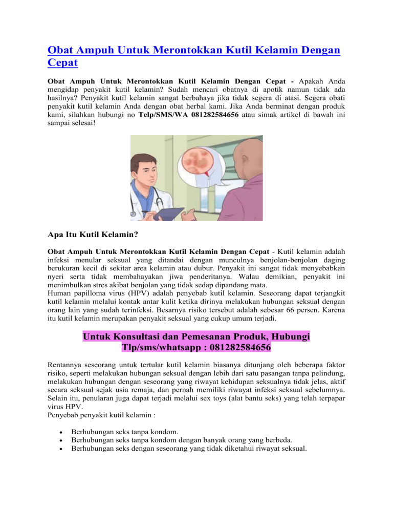 Obat Ampuh Untuk Merontokkan Kutil Kelamin Dengan Cepat Obat Ampuh Untuk Merontokkan Kutil Kelamin Dengan Cepat - Apakah Anda mengidap penyakit kutil kelamin? Sudah mencari obatnya di apotik namun tidak ada hasilnya? Penyakit kutil kelamin sangat berbahaya jika tidak segera di atasi. Segera obati penyakit kutil kelamin Anda dengan obat herbal kami. Jika Anda berminat dengan produk kami, silahkan hubungi no Telp/SMS/WA 081282584656 atau simak artikel di bawah ini sampai selesai! Apa Itu Kutil Kelamin? Obat Ampuh Untuk Merontokkan Kutil Kelamin Dengan Cepat - Kutil kelamin adalah infeksi menular seksual yang ditandai dengan munculnya benjolan-benjolan daging berukuran kecil di sekitar area kelamin atau dubur. Penyakit ini sangat tidak menyebabkan nyeri serta tidak membahayakan jiwa penderitanya. Walau demikian, penyakit ini menimbulkan stres akibat benjolan yang tidak sedap dipandang mata. Human papilloma virus (HPV) adalah penyebab kutil kelamin. Seseorang dapat terjangkit kutil kelamin melalui kontak antar kulit ketika dirinya melakukan hubungan seksual dengan orang lain yang sudah terinfeksi. Besarnya risiko tersebut adalah sebesar 66 persen. Karena itu kutil kelamin merupakan penyakit seksual yang cukup umum terjadi. Untuk Konsultasi dan Pemesanan Produk, Hubungi Tlp/sms/whatsapp : 081282584656 Rentannya seseorang untuk tertular kutil kelamin biasanya ditunjang oleh beberapa faktor risiko, seperti melakukan hubungan seksual dengan lebih dari satu pasangan tanpa pelindung, melakukan hubungan dengan seseorang yang riwayat kehidupan seksualnya tidak jelas, aktif secara seksual sejak usia remaja, dan pernah memiliki riwayat infeksi seksual sebelumnya. Selain itu, penularan juga dapat terjadi melalui sex toys (alat bantu seks) yang telah terpapar virus HPV. Penyebab penyakit kutil kelamin : Berhubungan seks tanpa kondom. Berhubungan seks tanpa kondom dengan banyak orang yang berbeda. Berhubungan seks dengan seseorang yang tidak diketahui riwayat seksual. Stres dan menderita infeksi virus lainnya seperti HIV atau herpes pada waktu yang sama. Tanda-tanda Ciri Penyakit Kutil Kelamin : Obat Ampuh Untuk Merontokkan Kutil Kelamin Dengan Cepat - Berikut Ciri ciri kutil kelamin pada wanita (Kondiloma Akuminata) atau jengger ayam ini bisa jadi penyakit paling mematikan dunia jika tidak segera di obati. Tidak hanya wanita sajayang patut mewaspadai tentang penyakit kutil kelamin ini, pria pun harus waspada pada munculnya kutil di kelamin tersebut. Berikut ini tanda-tanda atau ciri -ciri kutil kelamin beserta munculnya penyakit kutil kelamin atau jengger ayam yang patut di waspadai : Munculnya Benjolan di kelamin secara bergerombol Benjolan berisi daging Bentuk benjolan kecil Bengkak Kemerahan Menyerupai Jengger Ayam Menyerupai Kembang Kol Terasa Gatal Tidak Nyaman Pendarahan Nyeri Berbau Perih Kutil bisa berdarah Pada wanita muncul di bibir vagina, serviks, vagina Warna Kutil di kelamin hitam agak kemerahan, abu-abu agak kemerahan, cokelat agak kemerahan dan juga merah. Daerah penyebaran kutil kelamin pada Pria: Batang penis. Ujung kepala penis. Selangkangan. Paha bagian atas. Disekitar anus atau bisa didalamnya. Di dalam Uretra. Daerah penyebaran kutil kelamin pada Wanita: Anus. Vulva. Bagian antara anus dan kelamin. Leher Rahim. Paha bagian atas. Bagaimana cara mencegah Penyakit Kutil Kelamin? Untuk mengurangi risiko infeksi kutil kelamin bisa dilakukan dengan berbagai cara, antara lain : Gunakan kondom dengan benar setiap kali Anda berhubungan seks. Setia terhadap pasangan, jangan berganti-ganti partner seks. Membatasi kontak seksual hanya dengan satu pasangan yang benar-benar steril. Pertanyaan yang sering terpikirkan di benak Anda : Jika Saya terlanjur kena kutil kelamin bagaimana cara mengobatinya? Bagaimana cara mengobati kutil kelamin dengan cepat dan tuntas? Bagaimana berobat yang mudah tanpa perlu malu untuk ke dokter? Jawabannya: semua bisa, asal Anda memilih produk yang tepat, yaitu Gang Jie Gho Siah Pipeca dan Kapsul BD De Nature. Pengobatan Penyakit Kutil Kelamin Obat Ampuh Untuk Merontokkan Kutil Kelamin Dengan Cepat - Pengobatan Kutil Kelamin secara tradisional yaitu dengan menggunakan Obat Kutil Kelamin dari De Nature. Produk yang terbuat dari bahan herbal alami diramu dengan resep tradisional dan diolah secara teknologi modern, sehingga aman di konsumsi. Jadi anda juga tak perlu khawatir karena Obat Herbal De Nature yang kami tawarkan ini, Alhamdulillah, merupakan obat yang telah banyak menyembuhkan penderitanya baik dari dalam maupun luar negeri. Sudah banyak pasien kami yang merasakan kesembuhannya dengan mengonsumsi obat herbal dari De Nature. Rp 950.000,Pemesanan obat hubungi tlp/sms/whatsapp : 081282584656 Sekedar informasi untuk kenyamanan Konsumen, bahwa Produk dari perusahaan kami ini sudah memiliki: Ijin Resmi Perusahaan dari Kementerian Kesehatan Ijin BPOM, yang artinya sudah lulus uji stabilitas Produk Sertifikat Halal MUI, sehingga halal bisa dipertanggungjawabkan Apoteker yang sudah berpengalaman Sudah melewati Proses Sortir Bahan Baku, Guna Menjaga Mutu Produk Proses Produksi Sesuai Alur CPOTB (Cara Pembuatan Obat Tradisional Yang Baik Dan Benar). Cara Pembelian: Pembayaran terlebih dulu via transfer Bank, setelah transfer SMS-kan konfirmasinya untuk proses pengiriman. Format Pemesanan: Nama, Alamat Lengkap beserta kode Pos, Nama Bank / Rekening anda, Nominal transfer, Nama Obat yg dipesan, No.Hp Anda Agar pesanan Anda bisa segera diproses, segera konfirmasikan pembayaran Anda via Telp/SMS/WA ke 081282584656 Setelah itu barang kami kirim melalui TIKI / JNE / J&T / POS. CONTOH SMS KONFIRMASI: Ahmad Husein, Jl.Raya Perumas Cendana Asri No.95, Kecamatan Majenang, Kabupaten Cilacap, Provinsi Jawa Tengah Kode Pos 53257, Rekening Pentransfer atas Nama Ahmad Husein, Transfer 320rb, Obat Eksim, 081xxxxxxxxx INFO LENGKAP HUBUNGI KAMI: Telp/SMS/WA ke 081282584656 Sistem Pembayaran : Nikmati pembayaran yang aman dan nyaman melalui Bank BRI, BNI, BCA, dan Mandiri. Jasa Pengiriman :
