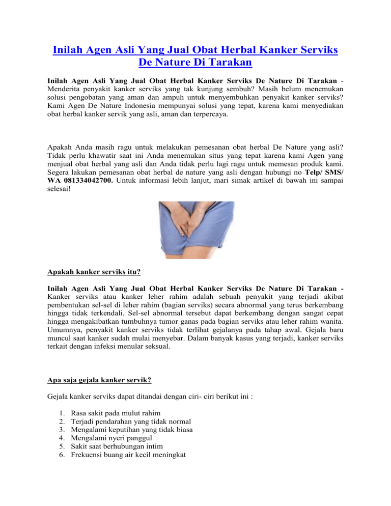 Inilah Agen Asli Yang Jual Obat Herbal Kanker Serviks De Nature Di Tarakan Inilah Agen Asli Yang Jual Obat Herbal Kanker Serviks De Nature Di Tarakan Menderita penyakit kanker serviks yang tak kunjung sembuh? Masih belum menemukan solusi pengobatan yang aman dan ampuh untuk menyembuhkan penyakit kanker serviks? Kami Agen De Nature Indonesia mempunyai solusi yang tepat, karena kami menyediakan obat herbal kanker servik yang asli, aman dan terpercaya. Apakah Anda masih ragu untuk melakukan pemesanan obat herbal De Nature yang asli? Tidak perlu khawatir saat ini Anda menemukan situs yang tepat karena kami Agen yang menjual obat herbal yang asli dan Anda tidak perlu lagi ragu untuk memesan produk kami. Segera lakukan pemesanan obat herbal de nature yang asli dengan hubungi no Telp/ SMS/ WA 081334042700. Untuk informasi lebih lanjut, mari simak artikel di bawah ini sampai selesai! Apakah kanker serviks itu? Inilah Agen Asli Yang Jual Obat Herbal Kanker Serviks De Nature Di Tarakan Kanker serviks atau kanker leher rahim adalah sebuah penyakit yang terjadi akibat pembentukan sel-sel di leher rahim (bagian serviks) secara abnormal yang terus berkembang hingga tidak terkendali. Sel-sel abnormal tersebut dapat berkembang dengan sangat cepat hingga mengakibatkan tumbuhnya tumor ganas pada bagian serviks atau leher rahim wanita. Umumnya, penyakit kanker serviks tidak terlihat gejalanya pada tahap awal. Gejala baru muncul saat kanker sudah mulai menyebar. Dalam banyak kasus yang terjadi, kanker serviks terkait dengan infeksi menular seksual. Apa saja gejala kanker servik? Gejala kanker serviks dapat ditandai dengan ciri- ciri berikut ini : 1. 2. 3. 4. 5. 6. Rasa sakit pada mulut rahim Terjadi pendarahan yang tidak normal Mengalami keputihan yang tidak biasa Mengalami nyeri panggul Sakit saat berhubungan intim Frekuensi buang air kecil meningkat 7. Mengalami gangguan pencernaan 8. Kehilangan nafsu makan 9. Mengalami kelelahan Akan tetapi banyak wanita yang tidak menyadari bahkan meremehkan tanda yang mereka alami yang mungkin bisa jadi gejala kanker serviks stadium awal. Lalu, apa saja pengobatan yang dapat dilakukan oleh penderita kanker serviks? Pengobatan Kanker Serviks Inilah Agen Asli Yang Jual Obat Herbal Kanker Serviks De Nature Di Tarakan - Ada beberapa langkah pengobatan yang dapat dilakukan untuk menyembuhkan kanker serviks yang sedang Anda derita yaitu dengan cara Operasi, Radioterapi, ataupun Kemoterapi. Akan tetapi cara pengobatan tersebut ternyata tidak seefektif yang pasien harapkan. Penyakit ini bisa semakin kronis dan muncul kembali meskipun pengobatanya sudah dilakukan. Tapi jangan khawatir karena berbagai penelitian kesehatan yang dilakukan oleh orang berkompeten selalu berupaya menemukan pengobatan yang benar-benar efektif untuk penyakit ini. Baca Juga : Resmi! Alamat Agen Jual Obat Herbal Kanker Serviks De Nature Di Madiun Obat herbal De Nature adalah satu-satunya solusi terbaik bagi Anda untuk mendapatkan pengobatan yang ampuh untuk penyakit kanker serviks yang sedang Anda derita saat ini. Obat herbal De Nature sudah teruji secara klinis bahwa obat herbal De Nature memiliki kandungan antioksidan yang sangat tinggi di mana zat antioksidan ini merupakan zat antikanker yang mampu menghambat atau menekan pertumbuhan dan perkembangan sel-sel kanker dalam tubuh Anda. Kini Anda tidak perlu ragu untuk melakukan pemesanan obat herbal De Nature yang asli, karena sekarang Anda telah menemukan situs yang tepat. Kami Agen obat herbal de nature yang asli dan terpercaya, jadi Anda tidak perlu lagi khawatir untuk melakukan pemesanan. Untuk mendapatkan produk yang asli segera hubungi no Telp/SMS/ Wa 081334042700. OBAT HERBAL KANKER SERVIKS ZIIRZAX & TYPHOGELL DE NATURE Informasi Pemesanan Produk Hubungi No Telp/SMS/ Wa 081334042700 Harga Obat Kanker Serviks De Nature : Paket 1 minggu : Rp 315.000 (Terdiri dari 1 botol Ziirzax dan 1 botol Typhogell) Paket 1 bulan : Rp 1.150.000 (Terdiri dari 4 botol Ziirzax dan 4 botol Typhogell) hemat Rp 110.000 Paket 2 bulan : Rp 1.995.000 (Terdiri dari 8 botol Ziirzak dan 8 botol Typhogell) hemat Rp 525.000 Obat Kanker Serviks De Nature berisi : 1 Botol Ziirzax isi 50 Kapsul 1 Botol Typhogell isi 50 Kapsul Aturan Minum: Kapsul Ziirzax diminum 3 kali Sehari 2 kapsul/btl 1 jam sebelum makan. Kapsul Typhogell diminum 3 kali Sehari 2 kapsul/btl 1 jam sebelum makan. (Belum termasuk ongkir) Obat Herbal Ziirzax De Nature Obat kanker alami de nature ziirzax diproduksi dari daun dan buah sirsak alami yang mempunyai banyak manfaat, dipadukan dengan bahan- bahan herbal lainya yang dapat membantu menyembuhkan penyakit kanker. Tiap kapsul obat kanker alami de nature ziirzax mengandung ekstrak yang setara dengan Annonane muricata folium 2500 mg. Obat kanker alami de nature ziirzax ini mempunyai banyak khasiat yang dapat membantu anda dalam mempercepat penyembuhan penyakit kanker dalam tubuh anda. Serta daun sirsak juga dapat membunuh dan memperbaiki tingkat kesehatan dalam tubuh. Obat Herbal Thypogell De Nature Obat kanker alami de nature typhogell diproduksi dari tanaman keladi tikus (Typhonium flagelliforme) yang digunakan sebagai obat kanker payudara. Tiap kapsul obat de nature mengandung ekstrak yang setara dengan Typhonium flagelliforme 500 mg Rhizoma exstra. Obat kanker alami de nature typhogell mempunyai banyak khasiat bagi tubuh anda.Sebagai imunitas antikanker, antimikrobia dan antioksidan. Penghambat pertumbuhan sel- sel kanker. Mengurangi efek buruk kemoterapi. Anti virus dan anti bakteri. Mengatasi diabetes. Mengatasi hipertensi. Meningkatkan kekebalan tubuh. OBAT HERBAL DE NATURE INDONESIA AMAN & ALAMI JL. Pahonjean Perum Cendana Asri No 9, Kecamatan Majenang, Kabupaten Cilacap,Jawa Tengah Kode Pos 53257 Whatsapp/ Telp/ Sms : 081334042700 Agen Resmi De Nature Indonesia menyediakan berbagai macam obat herbal de nature sebagai solusi untuk masalah kesehatan Anda. Anda sekarang tidak perlu lagi bingungbingung untuk mencari obat herbal yang ampuh untuk menyembuhkan 