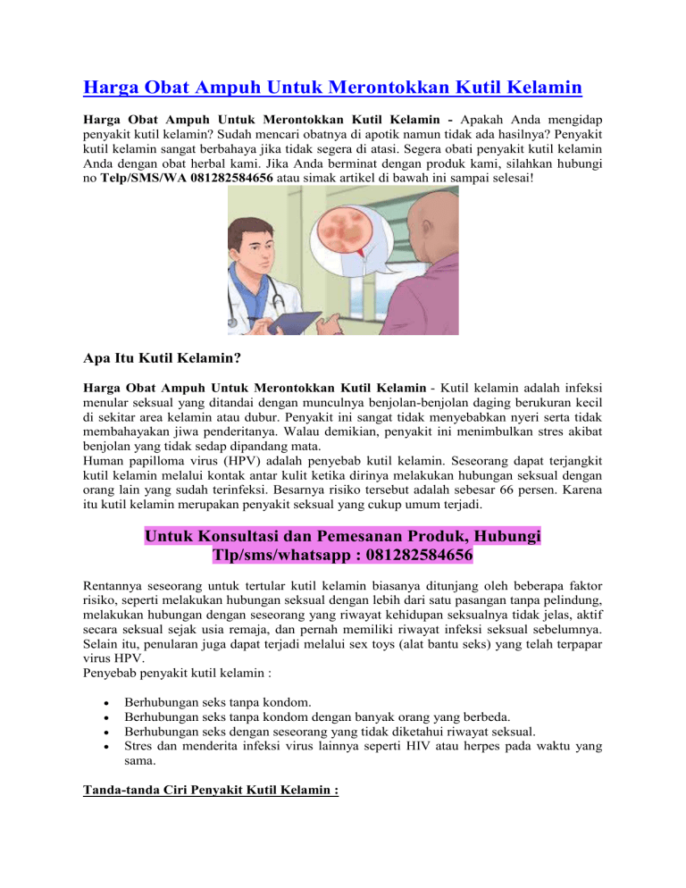 Harga Obat Ampuh Untuk Merontokkan Kutil Kelamin Harga Obat Ampuh Untuk Merontokkan Kutil Kelamin - Apakah Anda mengidap penyakit kutil kelamin? Sudah mencari obatnya di apotik namun tidak ada hasilnya? Penyakit kutil kelamin sangat berbahaya jika tidak segera di atasi. Segera obati penyakit kutil kelamin Anda dengan obat herbal kami. Jika Anda berminat dengan produk kami, silahkan hubungi no Telp/SMS/WA 081282584656 atau simak artikel di bawah ini sampai selesai! Apa Itu Kutil Kelamin? Harga Obat Ampuh Untuk Merontokkan Kutil Kelamin - Kutil kelamin adalah infeksi menular seksual yang ditandai dengan munculnya benjolan-benjolan daging berukuran kecil di sekitar area kelamin atau dubur. Penyakit ini sangat tidak menyebabkan nyeri serta tidak membahayakan jiwa penderitanya. Walau demikian, penyakit ini menimbulkan stres akibat benjolan yang tidak sedap dipandang mata. Human papilloma virus (HPV) adalah penyebab kutil kelamin. Seseorang dapat terjangkit kutil kelamin melalui kontak antar kulit ketika dirinya melakukan hubungan seksual dengan orang lain yang sudah terinfeksi. Besarnya risiko tersebut adalah sebesar 66 persen. Karena itu kutil kelamin merupakan penyakit seksual yang cukup umum terjadi. Untuk Konsultasi dan Pemesanan Produk, Hubungi Tlp/sms/whatsapp : 081282584656 Rentannya seseorang untuk tertular kutil kelamin biasanya ditunjang oleh beberapa faktor risiko, seperti melakukan hubungan seksual dengan lebih dari satu pasangan tanpa pelindung, melakukan hubungan dengan seseorang yang riwayat kehidupan seksualnya tidak jelas, aktif secara seksual sejak usia remaja, dan pernah memiliki riwayat infeksi seksual sebelumnya. Selain itu, penularan juga dapat terjadi melalui sex toys (alat bantu seks) yang telah terpapar virus HPV. Penyebab penyakit kutil kelamin : Berhubungan seks tanpa kondom. Berhubungan seks tanpa kondom dengan banyak orang yang berbeda. Berhubungan seks dengan seseorang yang tidak diketahui riwayat seksual. Stres dan menderita infeksi virus lainnya seperti HIV atau herpes pada waktu yang sama. Tanda-tanda Ciri Penyakit Kutil Kelamin : Obat Ampuh Untuk Merontokkan Kutil Kelamin Dengan Cepat - Berikut Ciri ciri kutil kelamin pada wanita (Kondiloma Akuminata) atau jengger ayam ini bisa jadi penyakit paling mematikan dunia jika tidak segera di obati. Tidak hanya wanita sajayang patut mewaspadai tentang penyakit kutil kelamin ini, pria pun harus waspada pada munculnya kutil di kelamin tersebut. Berikut ini tanda-tanda atau ciri -ciri kutil kelamin beserta munculnya penyakit kutil kelamin atau jengger ayam yang patut di waspadai : Munculnya Benjolan di kelamin secara bergerombol Benjolan berisi daging Bentuk benjolan kecil Bengkak Kemerahan Menyerupai Jengger Ayam Menyerupai Kembang Kol Terasa Gatal Tidak Nyaman Pendarahan Nyeri Berbau Perih Kutil bisa berdarah Pada wanita muncul di bibir vagina, serviks, vagina Warna Kutil di kelamin hitam agak kemerahan, abu-abu agak kemerahan, cokelat agak kemerahan dan juga merah. Daerah penyebaran kutil kelamin pada Pria: Batang penis. Ujung kepala penis. Selangkangan. Paha bagian atas. Disekitar anus atau bisa didalamnya. Di dalam Uretra. Daerah penyebaran kutil kelamin pada Wanita: Anus. Vulva. Bagian antara anus dan kelamin. Leher Rahim. Paha bagian atas. Bagaimana cara mencegah Penyakit Kutil Kelamin? Untuk mengurangi risiko infeksi kutil kelamin bisa dilakukan dengan berbagai cara, antara lain : Gunakan kondom dengan benar setiap kali Anda berhubungan seks. Setia terhadap pasangan, jangan berganti-ganti partner seks. Membatasi kontak seksual hanya dengan satu pasangan yang benar-benar steril. Pertanyaan yang sering terpikirkan di benak Anda : Jika Saya terlanjur kena kutil kelamin bagaimana cara mengobatinya? Bagaimana cara mengobati kutil kelamin dengan cepat dan tuntas? Bagaimana berobat yang mudah tanpa perlu malu untuk ke dokter? Jawabannya: semua bisa, asal Anda memilih produk yang tepat, yaitu Gang Jie Gho Siah Pipeca dan Kapsul BD De Nature. Pengobatan Penyakit Kutil Kelamin Harga Obat Ampuh Untuk Merontokkan Kutil Kelamin - Pengobatan Kutil Kelamin secara tradisional yaitu dengan menggunakan Obat Kutil Kelamin dari De Nature. Produk yang terbuat dari bahan herbal alami diramu dengan resep tradisional dan diolah secara teknologi modern, sehingga aman di konsumsi. Jadi anda juga tak perlu khawatir karena Obat Herbal De Nature yang kami tawarkan ini, Alhamdulillah, merupakan obat yang telah banyak menyembuhkan penderitanya baik dari dalam maupun luar negeri. Sudah banyak pasien kami yang merasakan kesembuhannya dengan mengonsumsi obat herbal dari De Nature. Rp 950.000,Pemesanan obat hubungi tlp/sms/whatsapp : 081282584656 Sekedar informasi untuk kenyamanan Konsumen, bahwa Produk dari perusahaan kami ini sudah memiliki: Ijin Resmi Perusahaan dari Kementerian Kesehatan Ijin BPOM, yang artinya sudah lulus uji stabilitas Produk Sertifikat Halal MUI, sehingga halal bisa dipertanggungjawabkan Apoteker yang sudah berpengalaman Sudah melewati Proses Sortir Bahan Baku, Guna Menjaga Mutu Produk Proses Produksi Sesuai Alur CPOTB (Cara Pembuatan Obat Tradisional Yang Baik Dan Benar). Cara Pembelian: Pembayaran terlebih dulu via transfer Bank, setelah transfer SMS-kan konfirmasinya untuk proses pengiriman. Format Pemesanan: Nama, Alamat Lengkap beserta kode Pos, Nama Bank / Rekening anda, Nominal transfer, Nama Obat yg dipesan, No.Hp Anda Agar pesanan Anda bisa segera diproses, segera konfirmasikan pembayaran Anda via Telp/SMS/WA ke 081282584656 Setelah itu barang kami kirim melalui TIKI / JNE / J&T / POS. CONTOH SMS KONFIRMASI: Ahmad Husein, Jl.Raya Perumas Cendana Asri No.95, Kecamatan Majenang, Kabupaten Cilacap, Provinsi Jawa Tengah Kode Pos 53257, Rekening Pentransfer atas Nama Ahmad Husein, Transfer 320rb, Obat Eksim, 081xxxxxxxxx INFO LENGKAP HUBUNGI KAMI: Telp/SMS/WA ke 081282584656 Sistem Pembayaran : Nikmati pembayaran yang aman dan nyaman melalui Bank BRI, BNI, BCA, dan Mandiri. Jasa Pengiriman : Barang Kami Kirim via POS, 