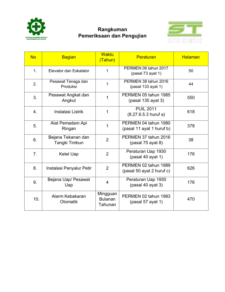 Rangkuman Pemeriksaan dan Pengujian Bagian Waktu (Tahun) Peraturan Halaman 1. Elevator dan Eskalator 1 PERMEN 06 tahun 2017 (pasal 73 ayat 1) 50 2. Pesawat Tenaga dan Produksi 1 PERMEN 38 tahun 2016 (pasal 133 ayat 1) 44 3. Pesawat Angkat dan Angkut 1 PERMEN 05 tahun 1985 (pasal 135 ayat 3) 550 4. Instalasi Listrik 1 PUIL 2011 (8.27.6.5.3 huruf a) 618 5. Alat Pemadam Api Ringan 1 PERMEN 04 tahun 1980 (pasal 11 ayat 1 huruf b) 378 6. Bejana Tekanan dan Tangki Timbun 2 PERMEN 37 tahun 2016 (pasal 75 ayat 8) 38 7. Ketel Uap 2 Peraturan Uap 1930 (pasal 40 ayat 1) 176 8. Instalasi Penyalur Petir 2 PERMEN 02 tahun 1989 (pasal 50 ayat 2 huruf c) 626 9. Bejana Uap/ Pesawat Uap 4 Peraturan Uap 1930 (pasal 40 ayat 3) 176 10. Alarm Kebakaran Otomatik Mingguan Bulanan Tahunan PERMEN 02 tahun 1983 (pasal 57 ayat 1) 470 No
