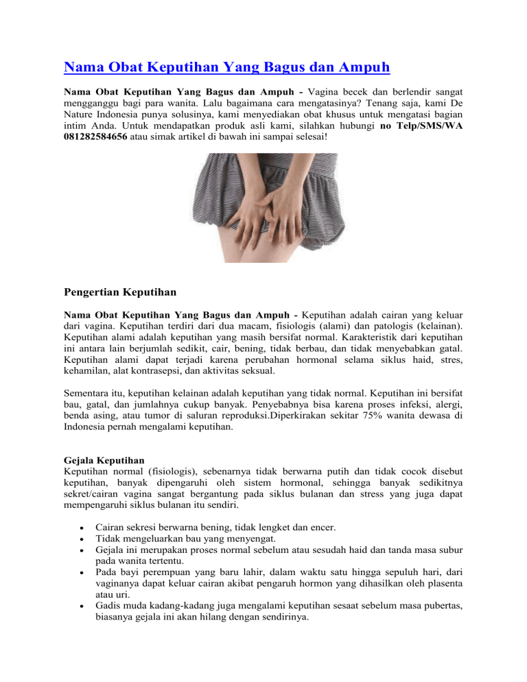 Nama Obat Keputihan Yang Bagus dan Ampuh Nama Obat Keputihan Yang Bagus dan Ampuh - Vagina becek dan berlendir sangat mengganggu bagi para wanita. Lalu bagaimana cara mengatasinya? Tenang saja, kami De Nature Indonesia punya solusinya, kami menyediakan obat khusus untuk mengatasi bagian intim Anda. Untuk mendapatkan produk asli kami, silahkan hubungi no Telp/SMS/WA 081282584656 atau simak artikel di bawah ini sampai selesai! Pengertian Keputihan Nama Obat Keputihan Yang Bagus dan Ampuh - Keputihan adalah cairan yang keluar dari vagina. Keputihan terdiri dari dua macam, fisiologis (alami) dan patologis (kelainan). Keputihan alami adalah keputihan yang masih bersifat normal. Karakteristik dari keputihan ini antara lain berjumlah sedikit, cair, bening, tidak berbau, dan tidak menyebabkan gatal. Keputihan alami dapat terjadi karena perubahan hormonal selama siklus haid, stres, kehamilan, alat kontrasepsi, dan aktivitas seksual. Sementara itu, keputihan kelainan adalah keputihan yang tidak normal. Keputihan ini bersifat bau, gatal, dan jumlahnya cukup banyak. Penyebabnya bisa karena proses infeksi, alergi, benda asing, atau tumor di saluran reproduksi.Diperkirakan sekitar 75% wanita dewasa di Indonesia pernah mengalami keputihan. Gejala Keputihan Keputihan normal (fisiologis), sebenarnya tidak berwarna putih dan tidak cocok disebut keputihan, banyak dipengaruhi oleh sistem hormonal, sehingga banyak sedikitnya sekret/cairan vagina sangat bergantung pada siklus bulanan dan stress yang juga dapat mempengaruhi siklus bulanan itu sendiri. Cairan sekresi berwarna bening, tidak lengket dan encer. Tidak mengeluarkan bau yang menyengat. Gejala ini merupakan proses normal sebelum atau sesudah haid dan tanda masa subur pada wanita tertentu. Pada bayi perempuan yang baru lahir, dalam waktu satu hingga sepuluh hari, dari vaginanya dapat keluar cairan akibat pengaruh hormon yang dihasilkan oleh plasenta atau uri. Gadis muda kadang-kadang juga mengalami keputihan sesaat sebelum masa pubertas, biasanya gejala ini akan hilang dengan sendirinya. Biasanya keputihan yang normal tidak disertai dengan rasa gatal. Keputihan juga dapat dialami oleh wanita yang terlalu lelah atau yang daya tahan tubuhnya lemah. Sebagian besar cairan tersebut berasal dari leher rahim, walaupun ada yang berasal dari vagina yang terinfeksi, atau alat kelamin luar. Pada wanita hamil keputihan lebih sering timbul, karena pada ssat wanita hamil, maka kekebaln tubuhnya akan menurun. Pada waktu menopause dimana keseimbangan hormonalnya terganggu. Pada orang tua dimana kekebalan tubuhnya sudah menurun dapat pula timbul Keputihan Tanda-tanda keputihan tidak :: normal Berbau Umumnya keputihan yang normal tidaklah bau. Ketika keputihan Anda berbau bahkan menyengat dan hampir dikatakan seperti bau busuk, maka bisa jadi ada kuman yang bersarang dan berkembang biak di miss V Anda. ::Berwarna Ketika normal, warna keputihan adalah bening dan transparan. Namun jika sudah hijau pekat, kuning, atau bahkan disertai dengan darah, ini masuk dalam kategori keputihan yang tidak normal. ::Menimbulkan gatal Area V Anda gatal dan ketika mengalami keputihan? Ini juga merupakan salah satu ciri miss V dalam masalah. :: Nyeri ketika kencing Nyeri ketika kencing merupakan tanda bahaya ketika Anda sedang mengalami keputihan. Ini tanda bahwa kuman sudah sampai di kandung kemih Anda. Penyebab keputihan Penyebab keputihan secara umum adalah: Ketidakseimbangan hormon Gejala suatu penyakit tertentu Rusaknya keseimbangan biologis dan keasaman (pH) lingkungan vagina. Hal-hal yang bisa terjadinya infeksi Sering memakai tissue saat membasuh bagian kewanitaan, sehabis buang air kecil maupun buang air besar Memakai pakaian dalam yang ketat dari bahan sintetis (bukan katun), sehingga berkeringat dan memudahkan timbulnya jamur Sering menggunakan toilet umum yang kotor Tidak mengganti panty liner Membilas vagina dari arah yang salah, yaitu dari arah anus ke arah depan vagina Sering bertukar celana dalam/handuk dengan orang lain Kurang menjaga kebersihan vagina Kelelahan yang amat sangat Stres Tidak segera mengganti pembalut saat menstruasi Sering membasuh vagina, yang harus dibasuh adalah vulva (bagian yang menggembung) dan bukan vaginanya Tidak mejalani pola hidup sehat (makan tidak teratur, tidak pernah olahraga, tidur kurang) Lingkungan sanitasi yang kotor. Sering mandi berendam dengan air hangat dan panas. Jamur yang menyebabkan keputihan lebih mungkin tumbuh di kondisi hangat. Sering berganti pasangan dalam berhubungan seks Kadar gula darah tinggi Sering menggaruk vagina � Kami De Nature Indonesia, Apotik Herbal Online menjual berbagai produk herbal untuk penyakit kelamin seperti Kencing Nanah, Wasir, Sipilis, Kutil Kelamin dan lainnya. Untuk konsultasi dan pemesanan hubungi no Telp/SMS/WA 081282584656. De Nature Indonesia beralamat di Perum Cendana Asri No.9 Majenang, Jl. Pahonjean Km.5 Majenang, Cilacap, Jawa Tengah � Jenis-jenis Keputihan yang Tidak Normal Keputihan yang tidak normal umumnya terjadi karena infeksi. Kondisi ini juga terkadang dapat menjadi indikasi dari penyakit-penyakit tertentu sehingga sebaiknya diwaspadai. Berikut ini adalah penjelasan jenis-jenis keputihan yang tidak normal: :: Keputihan dengan lendir berwarna cokelat atau mengandung darah Keputihan ini umumnya disebabkan oleh siklus menstruasi yang tidak teratur. Tetapi tetap perlu diwaspadai karena walau jarang, kondisi ini bisa menjadi indikasi dari kanker serviks atau rahim. :: Keputihan disertai rasa nyeri atau pendarahan Rasa nyeri pada tulang panggul atau saat buang air kecil serta munculnya pendarahan di luar siklus menstruasi atau setelah berhubungan seks yang menyertai keputihan, dapat mengindikasikan gonore atau chlamydia (klamidia). Jika dibiarkan, kedua penyakit menular seksual ini dapat memicu infeksi serius pada organ reproduksi wanita. Karena itu, segera temui dokter untuk menjalani pengobatan dengan antibiotik. :: Keputihan dengan lendir berwarna hijau, kuning, atau berbuih Jenis k