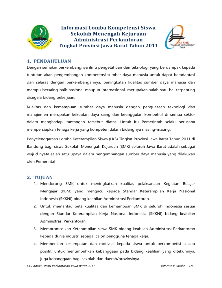 Informasi Lomba Kompetensi Siswa Sekolah Menengah Kejuruan Administrasi Perkantoran Tingkat Provinsi Jawa Barat Tahun 2011 1. PENDAHULUAN Dengan semakin berkembangnya ilmu pengetahuan dan teknologi yang berdampak kepada tuntutan akan pengembangan kompetensi sumber daya manusia untuk dapat beradaptasi dan selaras dengan perkembangannya, peningkatan kualitas sumber daya manusia dan mampu bersaing baik nasional maupun internasional, merupakan salah satu hal terpenting disegala bidang pekerjaan. Kualitas dan kemampuan sumber daya manusia dengan penguasaan teknologi dan manajemen merupakan kekuatan daya saing dan keunggulan kompetitif di semua sektor dalam menghadapi tantangan tersebut diatas. Untuk itu Pemerintah selalu berusaha mempersiapkan tenaga kerja yang kompeten dalam bidangnya masing-masing. Penyelenggaraan Lomba Keterampilan Siswa (LKS) Tingkat Provinsi Jawa Barat Tahun 2011 di Bandung bagi siswa Sekolah Menengah Kejuruan (SMK) seluruh Jawa Barat adalah sebagai wujud nyata salah satu upaya dalam pengembangan sumber daya manusia yang dilakukan oleh Pemerintah. 2. TUJUAN 1. Mendorong SMK untuk meningkatkan kualitas pelaksanaan Kegiatan Belajar Mengajar (KBM) yang mengacu kepada Standar Keterampilan Kerja Nasional Indonesia (SKKNI) bidang keahlian Administrasi Perkantoran. 2. Untuk memantau peta kualitas dan kemampuan SMK di seluruh Indonesia sesuai dengan Standar Keterampilan Kerja Nasional Indonesia (SKKNI) bidang keahlian Administrasi Perkantoran 3. Mempromosikan Keterampilan siswa SMK bidang keahlian Administrasi Perkantoran kepada dunia industri sebagai calon pengguna tenaga kerja. 4. Memberikan kesempatan dan motivasi kepada siswa untuk berkompetisi secara positif, untuk menumbuhkan kebanggaan pada bidang keahlian yang ditekuninya, juga kebanggaan bagi sekolah dan daerah/provinsinya. LKS Administrasi Perkantoran Jawa Barat 2011 Informasi Lomba - 1/6 3. PESERTA Peserta adalah siswa SMK dengan kriteria sebagai berikut : 1. Warga Negara Kesatuan Republik Indonesia. 2. Tercatat sebagai Siswa aktif SMK Negeri atau Swasta program keahlian Administrasi Perkantoran di Jawa Barat dalam tahun pelajaran 2010/2011. 3. Dinyatakan sebagai Pemenang LKS Tingkat Kabupaten/Kota program keahlian Administrasi Perkantoran 4. Setiap Kabupaten/Kota hanya dapat diwakili oleh 1 (satu) orang peserta. 4. MATERI LOMBA a. Lingkup Kemampuan yang Diujikan 1) Penanganan telepon 2) Membuat surat dalam bahasa Indonesia dan bahasa Inggris dengan menerapkan kaidah mengetik kecepatan. 3) Menangani Kas Kecil (Petty Cash) 4) Membuat Agenda Kegiatan Pimpinan (Daily Agenda) 5) Menata dan menemukan arsip (Filing) 6) Wawancara (termasuk Pengetahuan Kesekretarisan) 7) Mengoperasikan internet 8) Membuat Materi Presentasi dan melakukan Pesentasi dengan menggunakan bahasa Inggris b. Aspek Penilaian 1) Praktek : 75% 2) Wawancara (termasuk pengetahuan Kesekretarisan) : 10% 3) Presentasi : 15% 5. TIM PENGUJI Tim Juri/Penguji terdiri dari 3 orang professional/praktisi/akademisi di bidang Administrasi Perkantoran. LKS Administrasi Perkantoran Jawa Barat 2011 Informasi Lomba - 2/6 6. KRITERIA PEMENANG LOMBA Juara Lomba adalah peserta yang memiliki nilai akhir tertinggi dari seluruh nilai para peserta lomba. Apabila ada juara lomba yang memiliki nilai akhir yang sama maka pertama akan diperhitungkan kecepatan menyelesaikan tugas-tugas. Seandainya setelah diperhitungkan kecepatannya ternyata nilai masih sama maka akan diadakan tes wawancara oleh setiap juri. Para Juara ditentukan langsung oleh Juri meliputi: Juara I, II dan III, serta Juara Harapan I & II. 7. TEMPAT LOMBA Lomba akan dilaksanakan di Bandung. 8. TATA TERTIB LOMBA Peserta diharapkan : 1. Hanya satu orang yang menjadi peserta mewakili propinsi dengan Surat Penunjukkan dari Dinas Pendidikan Kabupaten/Kota. 2. Tidak dibenarkan peserta diganti disaat tengah lomba berlangsung. 3. Peserta harus hadir pada saat ‘technical meeting’. 4. Peserta harus sudah hadir 15 menit sebelum test dimulai. 5. Wajib mengisi daftar hadir pada saat setiap jenis lomba yang diadakan. 6. Berpakaian kerja yang rapi, diwajibkan hanya memakai identitas nomor peserta dari panitia. 7. Tidak diperbolehkan membawa buku/catatan/HP di ruang lomba. 8. Mengerjakan tugas dengan menggunakan pena/ballpoint, tidak dibenarkan menulis dengan pensil. 9. Tidak diperbolehkan menggunakan tipp-ex untuk menghapus kesalahan. 10. Kesalahan hendaknya dicoret pada kata/angka yang salah dan ditulis kata/angka yang benar. 11. Untuk alasan kesehatan peserta diperbolehkan membawa makanan kecil dan minuman ke dalam ruang ujian. LKS Administrasi Perkantoran Jawa Barat 2011 Informasi Lomba - 3/6 12. Perlengkapan yang harus dibawa oleh peserta : a. Pena/Ballpoint hitam, (disarankan lebih dari satu) b. Pensil 2B c. Penggaris, d. Penghapus e. Kalender Meja Tahun 2011 f. Mematuhi tata tertib yang telah ditentukan oleh Panitia atau Juri, apabila melanggar maka akan dikenakan sanksi. 9. PENUTUP Hal-hal yang belum tercantum dalam lembar informasi ini akan diinformasikan pada waktu rapat teknis (technical meeting). LKS Administrasi Perkantoran Jawa Barat 2011 Informasi Lomba - 4/6 Skenario Lomba Kompetensi Siswa Sekolah Menengah Kejuruan Administrasi Perkantoran Tingkat Provinsi Jawa Barat Tahun 2011 1. Pelaksanaan lomba didesain atau dirancang seperti layaknya Staf Administrasi bekerja. Tempat kerja yang lengkap artinya meja kerja disiapkan dengan fasilitas yang lengkap seperti : Komputer, Baki Surat, Telepon dan Alat Tulis serta Kalender 2011. 2. Selama bekerja, peserta diperbolehkan menentukan jenis pekerjaan/tugas yang dianggap mendesak/prioritas untuk diselesaikan. 3. Pada saat bekerja, Tim Juri akan mengarahkan peserta untuk mendapat tugas mengetik surat Indonesia dan surat Inggris, menerima telepon/menelpon, dipanggil untuk wawancara, mencari dokumen dan mengoperasikan internet. 4. Pada tugas Presentasi, setiap peserta mempersiapkan materi dan mempresentasikan hasilnya dengan Judul Presentasi yang akan ditentukan oleh Juri. Seti