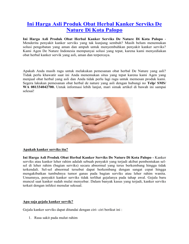 Ini Harga Asli Produk Obat Herbal Kanker Serviks De Nature Di Kota Palopo Ini Harga Asli Produk Obat Herbal Kanker Serviks De Nature Di Kota Palopo Menderita penyakit kanker serviks yang tak kunjung sembuh? Masih belum menemukan solusi pengobatan yang aman dan ampuh untuk menyembuhkan penyakit kanker serviks? Kami Agen De Nature Indonesia mempunyai solusi yang tepat, karena kami menyediakan obat herbal kanker servik yang asli, aman dan terpercaya. Apakah Anda masih ragu untuk melakukan pemesanan obat herbal De Nature yang asli? Tidak perlu khawatir saat ini Anda menemukan situs yang tepat karena kami Agen yang menjual obat herbal yang asli dan Anda tidak perlu lagi ragu untuk memesan produk kami. Segera lakukan pemesanan obat herbal de nature yang asli dengan hubungi no Telp/ SMS/ WA 081334042700. Untuk informasi lebih lanjut, mari simak artikel di bawah ini sampai selesai! Apakah kanker serviks itu? Ini Harga Asli Produk Obat Herbal Kanker Serviks De Nature Di Kota Palopo - Kanker serviks atau kanker leher rahim adalah sebuah penyakit yang terjadi akibat pembentukan selsel di leher rahim (bagian serviks) secara abnormal yang terus berkembang hingga tidak terkendali. Sel-sel abnormal tersebut dapat berkembang dengan sangat cepat hingga mengakibatkan tumbuhnya tumor ganas pada bagian serviks atau leher rahim wanita. Umumnya, penyakit kanker serviks tidak terlihat gejalanya pada tahap awal. Gejala baru muncul saat kanker sudah mulai menyebar. Dalam banyak kasus yang terjadi, kanker serviks terkait dengan infeksi menular seksual. Apa saja gejala kanker servik? Gejala kanker serviks dapat ditandai dengan ciri- ciri berikut ini : 1. Rasa sakit pada mulut rahim 2. 3. 4. 5. 6. 7. 8. 9. Terjadi pendarahan yang tidak normal Mengalami keputihan yang tidak biasa Mengalami nyeri panggul Sakit saat berhubungan intim Frekuensi buang air kecil meningkat Mengalami gangguan pencernaan Kehilangan nafsu makan Mengalami kelelahan Akan tetapi banyak wanita yang tidak menyadari bahkan meremehkan tanda yang mereka alami yang mungkin bisa jadi gejala kanker serviks stadium awal. Lalu, apa saja pengobatan yang dapat dilakukan oleh penderita kanker serviks? Pengobatan Kanker Serviks Ini Harga Asli Produk Obat Herbal Kanker Serviks De Nature Di Kota Palopo - Ada beberapa langkah pengobatan yang dapat dilakukan untuk menyembuhkan kanker serviks yang sedang Anda derita yaitu dengan cara Operasi, Radioterapi, ataupun Kemoterapi. Akan tetapi cara pengobatan tersebut ternyata tidak seefektif yang pasien harapkan. Penyakit ini bisa semakin kronis dan muncul kembali meskipun pengobatanya sudah dilakukan. Tapi jangan khawatir karena berbagai penelitian kesehatan yang dilakukan oleh orang berkompeten selalu berupaya menemukan pengobatan yang benar-benar efektif untuk penyakit ini. Baca Juga : Agen Penjual Obat Kanker Serviks De Nature Di Kota Prabumulih Obat herbal De Nature adalah satu-satunya solusi terbaik bagi Anda untuk mendapatkan pengobatan yang ampuh untuk penyakit kanker serviks yang sedang Anda derita saat ini. Obat herbal De Nature sudah teruji secara klinis bahwa obat herbal De Nature memiliki kandungan antioksidan yang sangat tinggi di mana zat antioksidan ini merupakan zat antikanker yang mampu menghambat atau menekan pertumbuhan dan perkembangan sel-sel kanker dalam tubuh Anda. Kini Anda tidak perlu ragu untuk melakukan pemesanan obat herbal De Nature yang asli, karena sekarang Anda telah menemukan situs yang tepat. Kami Agen obat herbal de nature yang asli dan terpercaya, jadi Anda tidak perlu lagi khawatir untuk melakukan pemesanan. Untuk mendapatkan produk yang asli segera hubungi no Telp/SMS/ Wa 081334042700. OBAT HERBAL KANKER SERVIKS ZIIRZAX & TYPHOGELL DE NATURE Informasi Pemesanan Produk Hubungi No Telp/SMS/ Wa 081334042700 Harga Obat Kanker Serviks De Nature : Paket 1 minggu : Rp 315.000 (Terdiri dari 1 botol Ziirzax dan 1 botol Typhogell) Paket 1 bulan : Rp 1.150.000 (Terdiri dari 4 botol Ziirzax dan 4 botol Typhogell) hemat Rp 110.000 Paket 2 bulan : Rp 1.995.000 (Terdiri dari 8 botol Ziirzak dan 8 botol Typhogell) hemat Rp 525.000 Obat Kanker Serviks De Nature berisi : 1 Botol Ziirzax isi 50 Kapsul 1 Botol Typhogell isi 50 Kapsul Aturan Minum: Kapsul Ziirzax diminum 3 kali Sehari 2 kapsul/btl 1 jam sebelum makan. Kapsul Typhogell diminum 3 kali Sehari 2 kapsul/btl 1 jam sebelum makan. (Belum termasuk ongkir) Obat Herbal Ziirzax De Nature Obat kanker alami de nature ziirzax diproduksi dari daun dan buah sirsak alami yang mempunyai banyak manfaat, dipadukan dengan bahan- bahan herbal lainya yang dapat membantu menyembuhkan penyakit kanker. Tiap kapsul obat kanker alami de nature ziirzax mengandung ekstrak yang setara dengan Annonane muricata folium 2500 mg. Obat kanker alami de nature ziirzax ini mempunyai banyak khasiat yang dapat membantu anda dalam mempercepat penyembuhan penyakit kanker dalam tubuh anda. Serta daun sirsak juga dapat membunuh dan memperbaiki tingkat kesehatan dalam tubuh. Obat Herbal Thypogell De Nature Obat kanker alami de nature typhogell diproduksi dari tanaman keladi tikus (Typhonium flagelliforme) yang digunakan sebagai obat kanker payudara. Tiap kapsul obat de nature mengandung ekstrak yang setara dengan Typhonium flagelliforme 500 mg Rhizoma exstra. Obat kanker alami de nature typhogell mempunyai banyak khasiat bagi tubuh anda.Sebagai imunitas antikanker, antimikrobia dan antioksidan. Penghambat pertumbuhan sel- sel kanker. Mengurangi efek buruk kemoterapi. Anti virus dan anti bakteri. Mengatasi diabetes. Mengatasi hipertensi. Meningkatkan kekebalan tubuh. OBAT HERBAL DE NATURE INDONESIA AMAN & ALAMI JL. Pahonjean Perum Cendana Asri No 9, Kecamatan Majenang, Kabupaten Cilacap,Jawa Tengah Kode Pos 53257 Whatsapp/ Telp/ Sms : 081334042700 Agen Resmi De Nature Indonesia menyediakan berbagai macam obat herbal de nature sebagai solusi untuk masalah kesehatan Anda. Anda sekarang tidak perlu lagi bingungbingung untuk mencari obat herbal yang ampuh untuk menyembuhkan penyakit yan