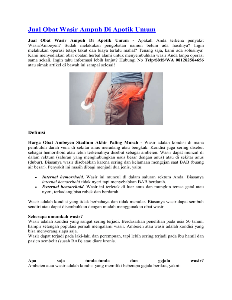 Jual Obat Wasir Ampuh Di Apotik Umum Jual Obat Wasir Ampuh Di Apotik Umum - Apakah Anda terkena penyakit Wasir/Ambeyen? Sudah melakukan pengobatan namun belum ada hasilnya? Ingin melakukan operasi tetapi takut dan biaya terlalu mahal? Tenang saja, kami ada solusinya! Kami menyediakan obat obatan herbal alami untuk menyembuhkan wasir Anda tanpa operasi sama sekali. Ingin tahu informasi lebih lanjut? Hubungi No Telp/SMS/WA 081282584656 atau simak artikel di bawah ini sampai selesai! Definisi Harga Obat Ambeyen Stadium Akhir Paling Murah - Wasir adalah kondisi di mana pembuluh darah vena di sekitar anus meradang atau bengkak. Kondisi juga sering disebut sebagai hemorrhoid atau lebih terkenalnya disebut sebagai ambeien. Wasir dapat muncul di dalam rektum (saluran yang menghubungkan usus besar dengan anus) atau di sekitar anus (dubur). Biasanya wasir disebabkan karena sering dan kelamaan mengejan saat BAB (buang air besar). Penyakit ini masih dibagi menjadi dua jenis, yaitu: Internal hemorrhoid. Wasir ini muncul di dalam saluran rektum Anda. Biasanya internal hemorrhoid tidak nyeri tapi menyebabkan BAB berdarah. External hemorrhoid. Wasir ini terletak di luar anus dan mungkin terasa gatal atau nyeri, terkadang bisa robek dan berdarah. Wasir adalah kondisi yang tidak berbahaya dan tidak menular. Biasanya wasir dapat sembuh sendiri atau dapat disembuhkan dengan mudah menggunakan obat wasir. Seberapa umumkah wasir? Wasir adalah kondisi yang sangat sering terjadi. Berdasarkan penelitian pada usia 50 tahun, hampir setengah populasi pernah mengalami wasir. Ambeien atau wasir adalah kondisi yang bisa menyerang siapa saja. Wasir dapat terjadi pada laki-laki dan perempuan, tapi lebih sering terjadi pada ibu hamil dan pasien sembelit (susah BAB) atau diare kronis. Apa saja tanda-tanda dan gejala Ambeien atau wasir adalah kondisi yang memiliki beberapa gejala berikut, yakni: wasir? BAB berdarah berwarna merah terang dan tidak nyeri Gatal dan iritasi pada area rektum Nyeri dan rasa tidak nyaman Bengkak di sekitar anus Benjolan yang sensitif atau nyeri di dekat anus Kondisi ambeien yang yang lebih sering menyebabkan rasa tidak nyaman dan nyeri yaitu external hemorrhoid. Internal hemorrhoid biasanya tidak menyebabkan rasa nyeri. Kemungkinan ada tanda-tanda dan gejala yang tidak disebutkan di atas. Bila Anda memiliki kekhawatiran akan sebuah gejala tertentu, konsultasikanlah dengan dokter Anda. Penyebab Penyebab wasir yaitu pembengkakan pembuluh darah vena. Pembengkakan bisa terjadi akibat meningkatnya tekanan di rektum bagian bawah. Faktor yang meningkatkan tekanan tersebut yaitu: Mengejan saat BAB Duduk terlalu lama Diare atau sembelit kronis Berat badan berlebih atau obesitas Hamil Kurang asupan makanan berserat Faktor-faktor risiko Wasir disebabkan oleh bengkaknya pembuluh darah vena akibat peningkatan tekanan di rektum bagian bawah. Faktor-faktor yang bisa menjadi penyebab wasir antara lain: 1. Sembelit kronis. Feses yang mengeras akibat sembelit membuat Anda harus mengeluarkan tenaga lebih banyak untuk mengejan. Tekanan ekstra tersebut akhirnya bisa memicu pembengkakan pembuluh darah di anus, menjadi penyebab wasir. 2. Kehamilan. Seiring usia kehamilan yang semakin membesar, rahim akan ikut berkembang mengikuti perkembangan janin. Tekanan rahim ini kemudian akan menekan pembuluh darah yang ada di usus besar hingga memicu munculnya benjolan di daerah anus. 3. Duduk terlalu lama. Kebiasaan duduk yang terlalu lama bisa menjadi penyebab wasir, sebab pembuluh darah di sekitar anus akan banyak terisi darah. Aliran darah yang konstan tersebut akhirnya akan menekan dinding pembuluh darah hingga semakin membesar. 4. Mengangkat benda berat. Berulang kali mengangkat benda yang berat bisa jadi penyebab wasir karena adanya penumpukan tekanan di bagian rektum yang akan memengaruhi aliran darah dan membuat pembuluh darah menjadi bengkak. 5. Usia. Kondisi tubuh yang semakin menua secara alami menyebabkan jaringan pembuluh darah di sekitar rektum dan anus semakin melemah dan meregang, sehingga rentan membengkak. Inilah yang akhirnya jadi penyebab wasir. Untuk Konsultasi dan Pemesanan Obat Hubungi No Telp/SMS/WA 081282584656 Siapa saja yang berisiko kena wasir? Ada banyak faktor risiko untuk wasir, yaitu: Memiliki pekerjaan yang mengharuskan Anda duduk atau berdiri dalam waktu yang lama. Mengalami diare atau sembelit kronis. Anda mengalami obesitas. Ibu hamil. Sering melakukan seks anal, yakni penetrasi lewat anus. Konsumsi makanan tinggi lemak dan rendah serat. Tingkatan Stadium Wasir Atau Sakit Ambeien Pada Ibu Hamil Wasir stadium 1 : Wasir Jenis ini Biasanya tidak Sampai prolaps. Rasanya Cuma kadang Kurang Nyaman Saat Buang Air Besar. Ambeien stadium 2 : bagian anus sudah bisa diraba ada benjolan, namun biasanya belum ada pendarahan. kadang ada rasa panas dan gatal Wasir stadium 3 : benjolan pada anus sudah besar dan susah masuk lagi harus dibantu dengan jari Ambeien stadium 4 : benjolan vena sudah besar sekali dan sering pendarahan, Obat ambeien alami Pertanyaan yang sering terpikirkan di benak Anda : Jika Saya terlanjur kena wasir bagaimana cara mengobatinya? Bagaimana cara mengobati wasir dengan cepat dan tuntas? Bagaimana berobat yang mudah tanpa perlu malu untuk ke dokter dan tanpa operasi? Jawabannya: semua bisa, asal Anda memilih produk yang tepat, yaitu Ambejoss dan Salep Salwa De Nature. Harga Rp 275.000 Anda ingin sembuh dari wasir? Segera hubungi tlp/sms/whatsapp : 081282584656 Sekedar informasi untuk kenyamanan Konsumen, bahwa Produk dari perusahaan kami ini sudah memiliki: Ijin Resmi Perusahaan dari Kementerian Kesehatan Ijin BPOM, yang artinya sudah lulus uji stabilitas Produk Sertifikat Halal MUI, sehingga halal bisa dipertanggungjawabkan Apoteker yang sudah berpengalaman Sudah melewati Proses Sortir Bahan Baku, Guna Menjaga Mutu Produk Proses Produksi Sesuai Alur CPOTB (Cara Pembuatan Obat Tradisional Yang Baik Dan Benar) Cara Pemesanan Pembayaran terlebih dulu via transfer Bank, setelah transfer SMS
