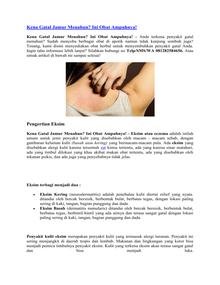 Kena Gatal Jamur Menahun? Ini Obat Ampuhnya! Kena Gatal Jamur Menahun? Ini Obat Ampuhnya! - Anda terkena penyakit gatal menahun? Sudah mencoba berbagai obat di apotik namun tidak kunjung sembuh juga? Tenang, kami disini menyediakan obat herbal untuk menyembuhkan penyakit gatal Anda. Ingin tahu informasi lebih lanjut? Silahkan hubungi no Telp/SMS/WA 081282584656. Atau simak artikel di bawah ini sampai selesai! Pengertian Eksim Kena Gatal Jamur Menahun? Ini Obat Ampuhnya! - Eksim atau eczema adalah istilah umum untuk jenis penyakit kulit yang disebabkan oleh macam - macam sebab, dengan gambaran kelainan kulit (basah atau kering) yang bermacam-macam pula. Ada eksim yang disebabkan alergi kulit karena tersentuh zat kimia tertentu, ada yang karena sinar matahari, ada yang timbul dilokasi yang khas akibat makan obat tertentu, ada yang disebabkan oleh tekanan psikis, dan ada juga yang penyebabnya tidak jelas. Eksim terbagi menjadi dua : Eksim Kering (neurodermatitis) adalah penebalan kulit diertai relief yang nyata. ditandai oleh bercak bersisik, berbentuk bulat, berbatas tegas, dengan lokasi paling sering di kaki, tangan, bagian punggung dan dada. Eksim Basah (dermatitis numularis) ditandai oleh bercak bersisik, berbentuk bulat, berbatas tegas, berbintil-bintil yang ada airnya dan terasa sangat gatal dengan lokasi paling sering di kaki, tangan, bagian punggung dan dada. Penyakit kulit eksim merupakan penyakit kulit yang termasuk alergi turunan. Penyakit ini sering menjangkit di daerah tropis dan lembab. Makanan dan lingkungan yang kotor bisa menjadi pemicu timbulnya penyakit eksim. Kulit yang terkena eksim akan terasa sangat gatal dan bisa menjadi luka. Biasanya eksim diawali dengan rasa gatal, panas, dan merah di bagian permukaan tubuh yang terserang. Kemudian timbul lepuh dikulit yang berwarna merah tadi. Sebagian atau seluruh lepuh dapat berisi nanah yang mudah pecah. Dalam keadaan ini eksim dikenal dengan eksim basah. Lama kelamaan lepuh mengering dan mengeropeng yang disebut eksim kering. Eksim kering dapat berubah lagi menjadi eksim basah jika lepuh bernanah timbul lagi. Harga Rp 295.000 Informasi lebih lanjut hubungi Telp/SMS/WA 081282584656 Apa Saja Gejala Eksim? Kena Gatal Jamur Menahun? Ini Obat Ampuhnya! - Dimanapun lokasi timbulnya eksim, gejala utama yang dirasakan pasien adalah gatal. Terkadang rasa gatal sudah muncul sebelum ada tanda kemerahan pada kulit. Gejala kemerahan biasanya akan muncul pada wajah, lutut, tangan dan kaki, namun tidak menutup kemungkinan kemerahan muncul di daerah lain. Daerah yang terkena akan terasa sangat kering, menebal atau keropeng. Pada orang kulit putih, daerah ini pada mulanya akan berwarna merah muda lalu berubah menjadi cokelat. Sementara itu pada orang dengan kulit lebih gelap, eksim akan mempengaruhi pigmen kulit sehingga daerah eksim akan tampak lebih terang atau lebih gelap. Apa yang Menjadi Penyebab Eksim Kena Gatal Jamur? Ini Dia Solusinya! - Penyebab dari eksim sebenarnya belum diketahui dengan pasti, namun beberapa ahli mencurigai eksim berhubungan dengan aktifitas daya pertahanan tubuh (imun) yang berlebihan. Hal ini menyebabkan tubuh mengalami reaksi berlebihan terhadap bakteri atau iritan yang sebenarnya tidak berbahaya pada kulit. Oleh karena itu, eksim banyak ditemukan pada keluarga dengan riwayat penyakit alergi atau asma. Tiap tiap orang mempunyai pencetus eksim yang berbeda beda. Ada orang yang setelah memegang sabun atau deterjen akan merasakan gatal yang luar biasa, ada pula yang disebabkan oleh bahan atau alat rumah tangga yang lain. Gejala yang timbul pun bervariasi, ada yang gatalnya ringan tetapi rasa panas yang dominan, ada pula yang sebaliknya. Infeksi saluran nafas bagian atas atau flu juga bisa menjadi pencetus timbulnya eksim. Stress yang dialami penderita akan membuat gejala menjadi lebih buruk. Jenis – Jenis Penyakit Gatal Eksim : 1. Dermatitis atopik : salah satu jenis eksim yang paling sering dijumpai dan merupakan penyakit turunan. Dermatitis atopik umumnya dimulai ketika bayi dan masih anakanak dengan gejala berupa gatal, radang kulit, dan pada sebagian penderita sering timbul asma dan demam hay (hay fever). 2. Dermatitis kontak : meliputi dermatitis kontak alergik dan iritan. Dermatitis kontak alergik disebabkan oleh reaksi kekebalan tertunda (delayed immune system) akibat kontak kulit dengan senyawa alergenik sehingga menyebabkan radang kulit dalam 48 jam setelah paparan terjadi. Beberapa agen penyebab eksim jenis ini adalah jelatang, parfum, pengawet kosmetik, metal, dan pewarna. 3. Dermatitis kontak iritan terjadi karena paparan senyawa iritan yang dapat merusak kulit secara kimiawi, contohnya sabun keras, detergen, dan produk pembersih lainnya. Senyawa iritan tersebut dapat menghilangkan minyak dan kelembaban dari lapisan luar kulit, kemudian merusak lapisan pelindung dan memicu terjadinya peradangan. 4. Eksim numular : beberapa plak eksim yang biasanya berhubungan dengan kulit kering dan terjadi pada bagian luar dari kaki, tangan, dan lengan. 5. Eksim stasis : jenis eksim kronis pada daerah bawah kaki bagian dalam yang berkaitan dengan varises. Pertanyaan yang sering terpikirkan di benak Anda : Jika Saya terlanjur kena penyakit eksim, bagaimana cara mengobatinya? Bagaimana cara mengobati penyakit eksim dengan cepat dan tuntas? Bagaimana berobat yang mudah tanpa perlu malu untuk ke dokter? Jawabannya: semua bisa, asal Anda memilih produk yang tepat, yaitu Eximtas, Kapsul BD De Nature dan Salep Exclear. Pengobatan Penyakit Eksim Kena Gatal Jamur Menahun? Ini Obat Ampuhnya! - Pengobatan Eksim secara tradisional yaitu dengan menggunakan Obat Eksim dari De Nature. Produk yang terbuat dari bahan herbal alami diramu dengan resep tradisional dan diolah secara teknologi modern, sehingga aman di konsumsi. Jadi anda juga tak perlu khawatir karena Obat Herbal De Nature yang kami tawarkan ini, Alhamdulillah, merupakan obat yang telah banyak menyembuhkan penderitanya baik dari dalam maupun luar negeri. Sudah banyak pas
