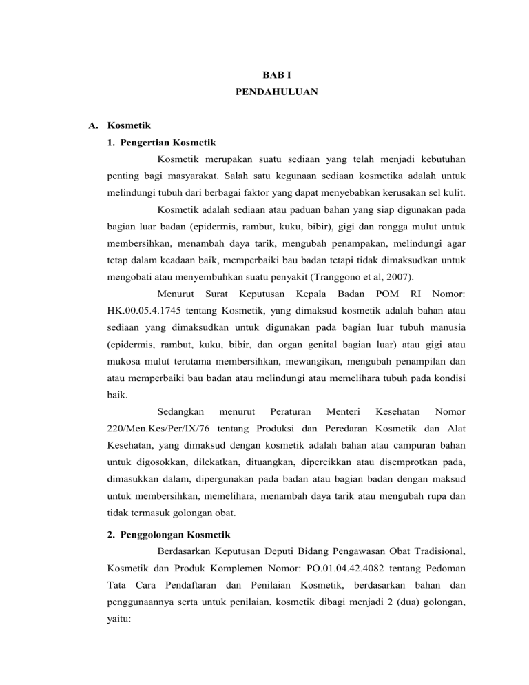 BAB I PENDAHULUAN A. Kosmetik 1. Pengertian Kosmetik Kosmetik merupakan suatu sediaan yang telah menjadi kebutuhan penting bagi masyarakat. Salah satu kegunaan sediaan kosmetika adalah untuk melindungi tubuh dari berbagai faktor yang dapat menyebabkan kerusakan sel kulit. Kosmetik adalah sediaan atau paduan bahan yang siap digunakan pada bagian luar badan (epidermis, rambut, kuku, bibir), gigi dan rongga mulut untuk membersihkan, menambah daya tarik, mengubah penampakan, melindungi agar tetap dalam keadaan baik, memperbaiki bau badan tetapi tidak dimaksudkan untuk mengobati atau menyembuhkan suatu penyakit (Tranggono et al, 2007). Menurut Surat Keputusan Kepala Badan POM RI Nomor: HK.00.05.4.1745 tentang Kosmetik, yang dimaksud kosmetik adalah bahan atau sediaan yang dimaksudkan untuk digunakan pada bagian luar tubuh manusia (epidermis, rambut, kuku, bibir, dan organ genital bagian luar) atau gigi atau mukosa mulut terutama membersihkan, mewangikan, mengubah penampilan dan atau memperbaiki bau badan atau melindungi atau memelihara tubuh pada kondisi baik. Sedangkan menurut Peraturan Menteri Kesehatan Nomor 220/Men.Kes/Per/IX/76 tentang Produksi dan Peredaran Kosmetik dan Alat Kesehatan, yang dimaksud dengan kosmetik adalah bahan atau campuran bahan untuk digosokkan, dilekatkan, dituangkan, dipercikkan atau disemprotkan pada, dimasukkan dalam, dipergunakan pada badan atau bagian badan dengan maksud untuk membersihkan, memelihara, menambah daya tarik atau mengubah rupa dan tidak termasuk golongan obat. 2. Penggolongan Kosmetik Berdasarkan Keputusan Deputi Bidang Pengawasan Obat Tradisional, Kosmetik dan Produk Komplemen Nomor: PO.01.04.42.4082 tentang Pedoman Tata Cara Pendaftaran dan Penilaian Kosmetik, berdasarkan bahan dan penggunaannya serta untuk penilaian, kosmetik dibagi menjadi 2 (dua) golongan, yaitu: a. Kosmetik golongan I, adalah: 1) Kosmetik yang digunakan untuk bayi; 2) Kosmetik yang digunakan disekitar mata, rongga mulut dan mukosa lainnya; 3) Kosmetika yang mengandung bahan dengan persyaratan kadar dan penandaan; 4) Kosmetik yang mengandung bahan dan fungsinya belum lazim serta belum diketahui keamanan dan kemanfaatannya. b. Kosmetik golongan II adalah kosmetik yang tidak termasuk golongan I 3. Kategori Kosmetik Berdasarkan fungsi kosmetik terdiri dari 13 (tiga belas) kategori, yaitu: a. Sediaan bayi; b. Sediaan mandi; c. Sediaan kebersihan badan; d. Sediaan cukur; e. Sediaan wangi-wangian; f. Sediaan rambut; g. Sediaan pewarna rambut; h. Sediaan rias mata; i. Sediaan rias wajah; j. Sedian perawatan kulit; k. Sediaan mandi surya dan tabir surya; l. Sediaan kuku; m. Sediaan hygiene mulut. 4. Penandaan Kosmetik Penandaan kosmetik harus memenuhi persyaratan umum, yaitu etiket wadah atau pembungkus harus mencantumkan penandaan berisi informasi yang lengkap, objektif dan tidak menyesatkan, sesuai dengan data pendaftaran yang telah disetujui, jelas dan mudah terbaca, menggunakan huruf latin dan angka arab; dan tidak boleh mencantumkan penandaan seolah-olah sebagai obat, rekomendasi dari dokter, apoteker, pakar di bidang kosmetik atau organisasi profesi. Keterangan-keterangan yang harus dicantumkan pada etiket wadah dan atau pembungkus meliputi: a. Nama produk; b. Nama dan alamat produsen atau importer/penyalur; c. Ukuran, isi atau berat bersih; d. Komposisi harus memuat semua bahan; e. Nomor ijin edar; f. Nomor bets/kode produksi; g. Kegunaan dan cara penggunaan kecuali untuk produk yang sudah jelas penggunaannya; h. Bulan dan tahunkadaluwarsa bagi produk yang stabilitasnya kurang dari 30 bulan; i. Penandaan yang berkaitan dengan keamananatau mutu 5. Nomor ijin edar Kosmetik yang telah mendapatkan ijin edar memiliki nomor registrasi ijin edar, dengan kode sebagai berikut: a. Yang mendapatkan ijin edar sebelum notifikasi, ijin edar diterbitkan oleh Departemen kesehatan dengan kode CD/CL diikuti 10 digit angka,: CD/CL12345678910 Keterangan: CD/CL : Kosmetik produksi dalam negeri/Kosmetik produksi luar atau lisensi 1, 2 : Jenis kategori kosmetik 3, 4 : Jenis sub kategori 5,6 : Tahun berakhir ijin (dibalik) 7,8,9,10 : Tahun pendaftaran b. Ijin melalui notifikasi, ijin edar diterbitkan oleh Badan POM RI dengan kode C diikuti 12 digit angka: C123456789101112 Keterangan: C : Huruf C singkatan dari cosmetic 1 : Kode benua, disusun secara alphabetis 2,3 : Kode Negara yang disusun secara alphabetis 4,5 : Tahun notifikasi 6,7 : Kategori kosmetik ASEAN 8-12 : Nomor urut notifikasi pada tahun yang bersangkutan B. Dasar Hukum Peraturan di Bidang Kosmetik Undang–Undang Nomor 36 Tahun 2009 tentang Kesehatan sebagai dasar berbagai peraturan yang mengatur pelayanan kesehatan bagi masyarakat. UndangUndang ini memuat pengaturan berbagai hal pokok tentang kesehatan, yaitu berisi tentang: 1. Ketentuan umum yang memuat istilah dan pengertian berbagai hal tentang kesehatan; 2. Azaz dan tujuan pembangunan kesehatan, diselenggarakan dengan berasaskan perikemanusiaan, keseimbangan, manfaat, pelindungan, penghormatan terhadap hak dan kewajiban, keadilan, gender dan nondiskriminatif dan norma-norma agama dan bertujuan untuk meningkatkan kesadaran, kemauan, dan kemampuan hidup sehat bagi setiap orang agar terwujud derajat kesehatan masyarakat yang setinggitingginya; 3. Hak dan kewajibandalam memperoleh pelayanan kesehatan yang aman, bermutu, dan terjangkau, untuk mendapatkan informasi dan edukasi tentang kesehatan, dan kewajiban ikut mewujudkan, mempertahankan, dan meningkatkan derajat kesehatan masyarakat yang setinggi-tingginya; 4. Tanggung jawab pemerintah dalam merencanakan, mengatur, menyelenggarakan, membina, dan mengawasi penyelenggaraan upaya kesehatan yang merata dan terjangkau oleh masyarakat; 5. Sumber daya di bidang kesehatan dalam rangka penyelenggaraan pelayanan kesehatan; 6. Upaya kesehatan yang diselenggarakan dalam bentuk kegiatan dengan pendekatan promotif, preventif, kuratif, dan rehabilitatif yang dilaksanakan secara terpadu, menyeluruh, dan berkesinambungan; 7. Pengawasan, penyidikan dan