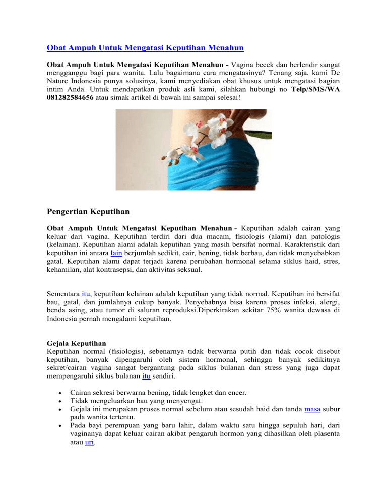 Obat Ampuh Untuk Mengatasi Keputihan Menahun Obat Ampuh Untuk Mengatasi Keputihan Menahun - Vagina becek dan berlendir sangat mengganggu bagi para wanita. Lalu bagaimana cara mengatasinya? Tenang saja, kami De Nature Indonesia punya solusinya, kami menyediakan obat khusus untuk mengatasi bagian intim Anda. Untuk mendapatkan produk asli kami, silahkan hubungi no Telp/SMS/WA 081282584656 atau simak artikel di bawah ini sampai selesai! Pengertian Keputihan Obat Ampuh Untuk Mengatasi Keputihan Menahun - Keputihan adalah cairan yang keluar dari vagina. Keputihan terdiri dari dua macam, fisiologis (alami) dan patologis (kelainan). Keputihan alami adalah keputihan yang masih bersifat normal. Karakteristik dari keputihan ini antara lain berjumlah sedikit, cair, bening, tidak berbau, dan tidak menyebabkan gatal. Keputihan alami dapat terjadi karena perubahan hormonal selama siklus haid, stres, kehamilan, alat kontrasepsi, dan aktivitas seksual. Sementara itu, keputihan kelainan adalah keputihan yang tidak normal. Keputihan ini bersifat bau, gatal, dan jumlahnya cukup banyak. Penyebabnya bisa karena proses infeksi, alergi, benda asing, atau tumor di saluran reproduksi.Diperkirakan sekitar 75% wanita dewasa di Indonesia pernah mengalami keputihan. Gejala Keputihan Keputihan normal (fisiologis), sebenarnya tidak berwarna putih dan tidak cocok disebut keputihan, banyak dipengaruhi oleh sistem hormonal, sehingga banyak sedikitnya sekret/cairan vagina sangat bergantung pada siklus bulanan dan stress yang juga dapat mempengaruhi siklus bulanan itu sendiri. Cairan sekresi berwarna bening, tidak lengket dan encer. Tidak mengeluarkan bau yang menyengat. Gejala ini merupakan proses normal sebelum atau sesudah haid dan tanda masa subur pada wanita tertentu. Pada bayi perempuan yang baru lahir, dalam waktu satu hingga sepuluh hari, dari vaginanya dapat keluar cairan akibat pengaruh hormon yang dihasilkan oleh plasenta atau uri. Gadis muda kadang-kadang juga mengalami keputihan sesaat sebelum masa pubertas, biasanya gejala ini akan hilang dengan sendirinya. Biasanya keputihan yang normal tidak disertai dengan rasa gatal. Keputihan juga dapat dialami oleh wanita yang terlalu lelah atau yang daya tahan tubuhnya lemah. Sebagian besar cairan tersebut berasal dari leher rahim, walaupun ada yang berasal dari vagina yang terinfeksi, atau alat kelamin luar. Pada wanita hamil keputihan lebih sering timbul, karena pada ssat wanita hamil, maka kekebaln tubuhnya akan menurun. Pada waktu menopause dimana keseimbangan hormonalnya terganggu. Pada orang tua dimana kekebalan tubuhnya sudah menurun dapat pula timbul Keputihan Tanda-tanda keputihan tidak :: normal Berbau Umumnya keputihan yang normal tidaklah bau. Ketika keputihan Anda berbau bahkan menyengat dan hampir dikatakan seperti bau busuk, maka bisa jadi ada kuman yang bersarang dan berkembang biak di miss V Anda. ::Berwarna Ketika normal, warna keputihan adalah bening dan transparan. Namun jika sudah hijau pekat, kuning, atau bahkan disertai dengan darah, ini masuk dalam kategori keputihan yang tidak normal. ::Menimbulkan gatal Area V Anda gatal dan ketika mengalami keputihan? Ini juga merupakan salah satu ciri miss V dalam masalah. :: Nyeri ketika kencing Nyeri ketika kencing merupakan tanda bahaya ketika Anda sedang mengalami keputihan. Ini tanda bahwa kuman sudah sampai di kandung kemih Anda. Penyebab keputihan Penyebab keputihan secara umum adalah: Ketidakseimbangan hormon Gejala suatu penyakit tertentu Rusaknya keseimbangan biologis dan keasaman (pH) lingkungan vagina. Hal-hal yang bisa terjadinya infeksi Sering memakai tissue saat membasuh bagian kewanitaan, sehabis buang air kecil maupun buang air besar Memakai pakaian dalam yang ketat dari bahan sintetis (bukan katun), sehingga berkeringat dan memudahkan timbulnya jamur Sering menggunakan toilet umum yang kotor Tidak mengganti panty liner Membilas vagina dari arah yang salah, yaitu dari arah anus ke arah depan vagina Sering bertukar celana dalam/handuk dengan orang lain Kurang menjaga kebersihan vagina Kelelahan yang amat sangat Stres Tidak segera mengganti pembalut saat menstruasi Sering membasuh vagina, yang harus dibasuh adalah vulva (bagian yang menggembung) dan bukan vaginanya Tidak mejalani pola hidup sehat (makan tidak teratur, tidak pernah olahraga, tidur kurang) Lingkungan sanitasi yang kotor. Sering mandi berendam dengan air hangat dan panas. Jamur yang menyebabkan keputihan lebih mungkin tumbuh di kondisi hangat. Sering berganti pasangan dalam berhubungan seks Kadar gula darah tinggi Sering menggaruk vagina � Kami De Nature Indonesia, Apotik Herbal Online menjual berbagai produk herbal untuk penyakit kelamin seperti Kencing Nanah, Wasir, Sipilis, Kutil Kelamin dan lainnya. Untuk konsultasi dan pemesanan hubungi no Telp/SMS/WA 081282584656. De Nature Indonesia beralamat di Perum Cendana Asri No.9 Majenang, Jl. Pahonjean Km.5 Majenang, Cilacap, Jawa Tengah � Jenis-jenis Keputihan yang Tidak Normal Keputihan yang tidak normal umumnya terjadi karena infeksi. Kondisi ini juga terkadang dapat menjadi indikasi dari penyakit-penyakit tertentu sehingga sebaiknya diwaspadai. Berikut ini adalah penjelasan jenis-jenis keputihan yang tidak normal: :: Keputihan dengan lendir berwarna cokelat atau mengandung darah Keputihan ini umumnya disebabkan oleh siklus menstruasi yang tidak teratur. Tetapi tetap perlu diwaspadai karena walau jarang, kondisi ini bisa menjadi indikasi dari kanker serviks atau rahim. :: Keputihan disertai rasa nyeri atau pendarahan Rasa nyeri pada tulang panggul atau saat buang air kecil serta munculnya pendarahan di luar siklus menstruasi atau setelah berhubungan seks yang menyertai keputihan, dapat mengindikasikan gonore atau chlamydia (klamidia). Jika dibiarkan, kedua penyakit menular seksual ini dapat memicu infeksi serius pada organ reproduksi wanita. Karena itu, segera temui dokter untuk menjalani pengobatan dengan antibiotik. :: Keputihan dengan lendir berwarna hijau, kuning, atau ber