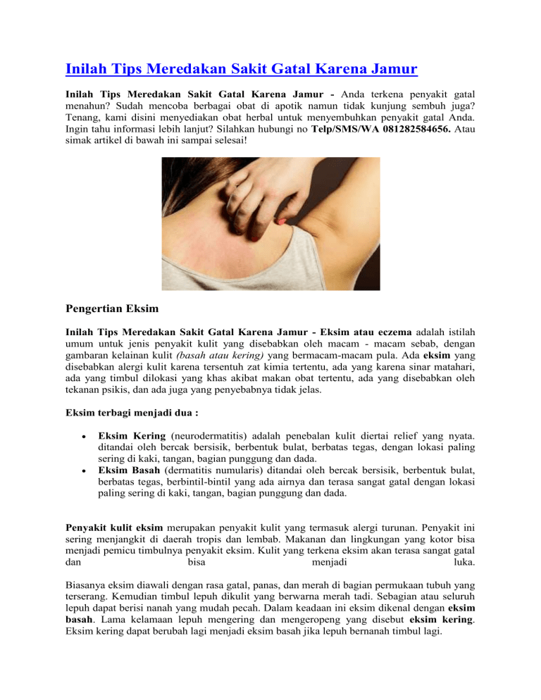 Inilah Tips Meredakan Sakit Gatal Karena Jamur Inilah Tips Meredakan Sakit Gatal Karena Jamur - Anda terkena penyakit gatal menahun? Sudah mencoba berbagai obat di apotik namun tidak kunjung sembuh juga? Tenang, kami disini menyediakan obat herbal untuk menyembuhkan penyakit gatal Anda. Ingin tahu informasi lebih lanjut? Silahkan hubungi no Telp/SMS/WA 081282584656. Atau simak artikel di bawah ini sampai selesai! Pengertian Eksim Inilah Tips Meredakan Sakit Gatal Karena Jamur - Eksim atau eczema adalah istilah umum untuk jenis penyakit kulit yang disebabkan oleh macam - macam sebab, dengan gambaran kelainan kulit (basah atau kering) yang bermacam-macam pula. Ada eksim yang disebabkan alergi kulit karena tersentuh zat kimia tertentu, ada yang karena sinar matahari, ada yang timbul dilokasi yang khas akibat makan obat tertentu, ada yang disebabkan oleh tekanan psikis, dan ada juga yang penyebabnya tidak jelas. Eksim terbagi menjadi dua : Eksim Kering (neurodermatitis) adalah penebalan kulit diertai relief yang nyata. ditandai oleh bercak bersisik, berbentuk bulat, berbatas tegas, dengan lokasi paling sering di kaki, tangan, bagian punggung dan dada. Eksim Basah (dermatitis numularis) ditandai oleh bercak bersisik, berbentuk bulat, berbatas tegas, berbintil-bintil yang ada airnya dan terasa sangat gatal dengan lokasi paling sering di kaki, tangan, bagian punggung dan dada. Penyakit kulit eksim merupakan penyakit kulit yang termasuk alergi turunan. Penyakit ini sering menjangkit di daerah tropis dan lembab. Makanan dan lingkungan yang kotor bisa menjadi pemicu timbulnya penyakit eksim. Kulit yang terkena eksim akan terasa sangat gatal dan bisa menjadi luka. Biasanya eksim diawali dengan rasa gatal, panas, dan merah di bagian permukaan tubuh yang terserang. Kemudian timbul lepuh dikulit yang berwarna merah tadi. Sebagian atau seluruh lepuh dapat berisi nanah yang mudah pecah. Dalam keadaan ini eksim dikenal dengan eksim basah. Lama kelamaan lepuh mengering dan mengeropeng yang disebut eksim kering. Eksim kering dapat berubah lagi menjadi eksim basah jika lepuh bernanah timbul lagi. Harga Rp 295.000 Informasi lebih lanjut hubungi Telp/SMS/WA 081282584656 Apa Saja Gejala Eksim? Inilah Tips Meredakan Sakit Gatal Karena Jamur - Dimanapun lokasi timbulnya eksim, gejala utama yang dirasakan pasien adalah gatal. Terkadang rasa gatal sudah muncul sebelum ada tanda kemerahan pada kulit. Gejala kemerahan biasanya akan muncul pada wajah, lutut, tangan dan kaki, namun tidak menutup kemungkinan kemerahan muncul di daerah lain. Daerah yang terkena akan terasa sangat kering, menebal atau keropeng. Pada orang kulit putih, daerah ini pada mulanya akan berwarna merah muda lalu berubah menjadi cokelat. Sementara itu pada orang dengan kulit lebih gelap, eksim akan mempengaruhi pigmen kulit sehingga daerah eksim akan tampak lebih terang atau lebih gelap. Apa yang Menjadi Penyebab Eksim Inilah Tips Meredakan Sakit Gatal Karena Jamur - Penyebab dari eksim sebenarnya belum diketahui dengan pasti, namun beberapa ahli mencurigai eksim berhubungan dengan aktifitas daya pertahanan tubuh (imun) yang berlebihan. Hal ini menyebabkan tubuh mengalami reaksi berlebihan terhadap bakteri atau iritan yang sebenarnya tidak berbahaya pada kulit. Oleh karena itu, eksim banyak ditemukan pada keluarga dengan riwayat penyakit alergi atau asma. Tiap tiap orang mempunyai pencetus eksim yang berbeda beda. Ada orang yang setelah memegang sabun atau deterjen akan merasakan gatal yang luar biasa, ada pula yang disebabkan oleh bahan atau alat rumah tangga yang lain. Gejala yang timbul pun bervariasi, ada yang gatalnya ringan tetapi rasa panas yang dominan, ada pula yang sebaliknya. Infeksi saluran nafas bagian atas atau flu juga bisa menjadi pencetus timbulnya eksim. Stress yang dialami penderita akan membuat gejala menjadi lebih buruk. Jenis – Jenis Penyakit Gatal Eksim : 1. Dermatitis atopik : salah satu jenis eksim yang paling sering dijumpai dan merupakan penyakit turunan. Dermatitis atopik umumnya dimulai ketika bayi dan masih anak- 2. 3. 4. 5. anak dengan gejala berupa gatal, radang kulit, dan pada sebagian penderita sering timbul asma dan demam hay (hay fever). Dermatitis kontak : meliputi dermatitis kontak alergik dan iritan. Dermatitis kontak alergik disebabkan oleh reaksi kekebalan tertunda (delayed immune system) akibat kontak kulit dengan senyawa alergenik sehingga menyebabkan radang kulit dalam 48 jam setelah paparan terjadi. Beberapa agen penyebab eksim jenis ini adalah jelatang, parfum, pengawet kosmetik, metal, dan pewarna. Dermatitis kontak iritan terjadi karena paparan senyawa iritan yang dapat merusak kulit secara kimiawi, contohnya sabun keras, detergen, dan produk pembersih lainnya. Senyawa iritan tersebut dapat menghilangkan minyak dan kelembaban dari lapisan luar kulit, kemudian merusak lapisan pelindung dan memicu terjadinya peradangan. Eksim numular : beberapa plak eksim yang biasanya berhubungan dengan kulit kering dan terjadi pada bagian luar dari kaki, tangan, dan lengan. Eksim stasis : jenis eksim kronis pada daerah bawah kaki bagian dalam yang berkaitan dengan varises. Pertanyaan yang sering terpikirkan di benak Anda : Jika Saya terlanjur kena penyakit eksim, bagaimana cara mengobatinya? Bagaimana cara mengobati penyakit eksim dengan cepat dan tuntas? Bagaimana berobat yang mudah tanpa perlu malu untuk ke dokter? Jawabannya: semua bisa, asal Anda memilih produk yang tepat, yaitu Eximtas, Kapsul BD De Nature dan Salep Exclear. Pengobatan Penyakit Eksim Inilah Tips Meredakan Sakit Gatal Karena Jamur - Pengobatan Eksim secara tradisional yaitu dengan menggunakan Obat Eksim dari De Nature. Produk yang terbuat dari bahan herbal alami diramu dengan resep tradisional dan diolah secara teknologi modern, sehingga aman di konsumsi. Jadi anda juga tak perlu khawatir karena Obat Herbal De Nature yang kami tawarkan ini, Alhamdulillah, merupakan obat yang telah banyak menyembuhkan penderitanya baik dari dalam maupun luar ne