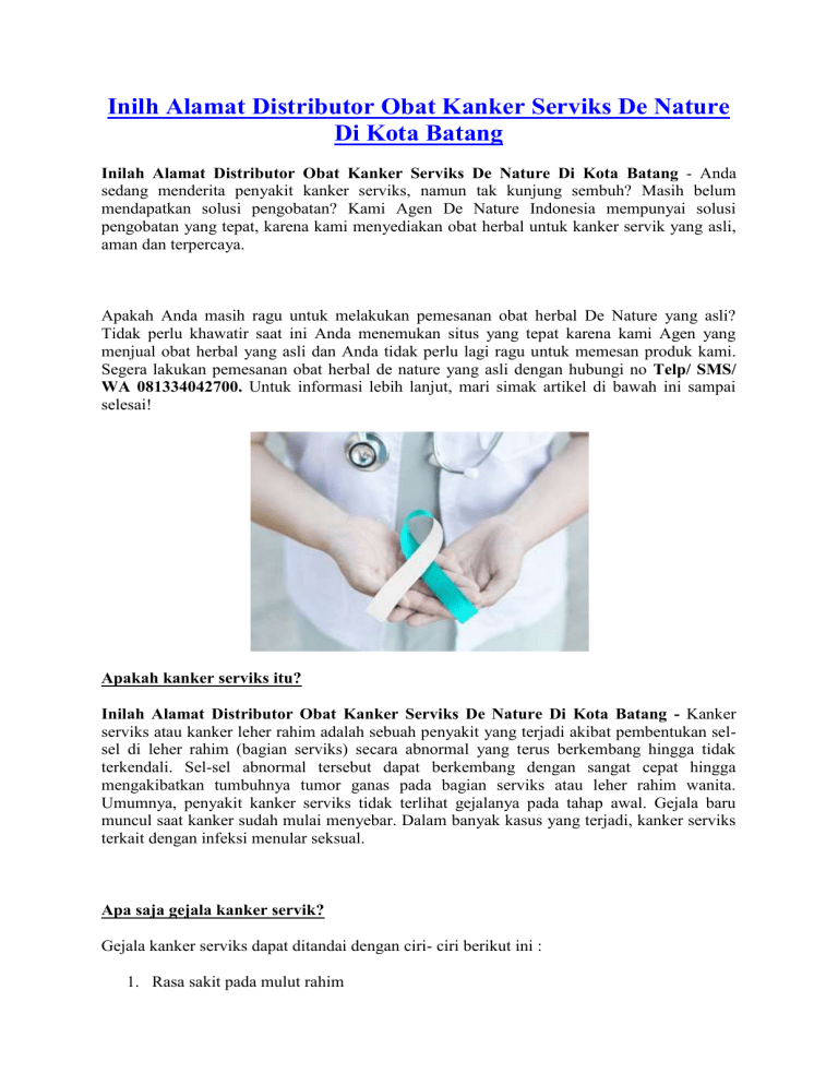Inilh Alamat Distributor Obat Kanker Serviks De Nature Di Kota Batang Inilah Alamat Distributor Obat Kanker Serviks De Nature Di Kota Batang - Anda sedang menderita penyakit kanker serviks, namun tak kunjung sembuh? Masih belum mendapatkan solusi pengobatan? Kami Agen De Nature Indonesia mempunyai solusi pengobatan yang tepat, karena kami menyediakan obat herbal untuk kanker servik yang asli, aman dan terpercaya. Apakah Anda masih ragu untuk melakukan pemesanan obat herbal De Nature yang asli? Tidak perlu khawatir saat ini Anda menemukan situs yang tepat karena kami Agen yang menjual obat herbal yang asli dan Anda tidak perlu lagi ragu untuk memesan produk kami. Segera lakukan pemesanan obat herbal de nature yang asli dengan hubungi no Telp/ SMS/ WA 081334042700. Untuk informasi lebih lanjut, mari simak artikel di bawah ini sampai selesai! Apakah kanker serviks itu? Inilah Alamat Distributor Obat Kanker Serviks De Nature Di Kota Batang - Kanker serviks atau kanker leher rahim adalah sebuah penyakit yang terjadi akibat pembentukan selsel di leher rahim (bagian serviks) secara abnormal yang terus berkembang hingga tidak terkendali. Sel-sel abnormal tersebut dapat berkembang dengan sangat cepat hingga mengakibatkan tumbuhnya tumor ganas pada bagian serviks atau leher rahim wanita. Umumnya, penyakit kanker serviks tidak terlihat gejalanya pada tahap awal. Gejala baru muncul saat kanker sudah mulai menyebar. Dalam banyak kasus yang terjadi, kanker serviks terkait dengan infeksi menular seksual. Apa saja gejala kanker servik? Gejala kanker serviks dapat ditandai dengan ciri- ciri berikut ini : 1. Rasa sakit pada mulut rahim 2. 3. 4. 5. 6. 7. 8. 9. Terjadi pendarahan yang tidak normal Mengalami keputihan yang tidak biasa Mengalami nyeri panggul Sakit saat berhubungan intim Frekuensi buang air kecil meningkat Mengalami gangguan pencernaan Kehilangan nafsu makan Mengalami kelelahan Akan tetapi banyak wanita yang tidak menyadari bahkan meremehkan tanda yang mereka alami yang mungkin bisa jadi gejala kanker serviks stadium awal. Lalu, apa saja pengobatan yang dapat dilakukan oleh penderita kanker serviks? Pengobatan Kanker Serviks Inilah Alamat Distributor Obat Kanker Serviks De Nature Di Kota Batang - Ada beberapa langkah pengobatan yang dapat dilakukan untuk menyembuhkan kanker serviks yang sedang Anda derita yaitu dengan cara Operasi, Radioterapi, ataupun Kemoterapi. Akan tetapi cara pengobatan tersebut ternyata tidak seefektif yang pasien harapkan. Penyakit ini bisa semakin kronis dan muncul kembali meskipun pengobatanya sudah dilakukan. Tapi jangan khawatir karena berbagai penelitian kesehatan yang dilakukan oleh orang berkompeten selalu berupaya menemukan pengobatan yang benar-benar efektif untuk penyakit ini. Baca Juga : Distributor Obat Kanker Serviks De Nature Di Kota Banyumas Obat herbal De Nature adalah satu-satunya solusi terbaik bagi Anda untuk mendapatkan pengobatan yang ampuh untuk penyakit kanker serviks yang sedang Anda derita saat ini. Obat herbal De Nature sudah teruji secara klinis bahwa obat herbal De Nature memiliki kandungan antioksidan yang sangat tinggi di mana zat antioksidan ini merupakan zat antikanker yang mampu menghambat atau menekan pertumbuhan dan perkembangan sel-sel kanker dalam tubuh Anda. Kini Anda tidak perlu ragu untuk melakukan pemesanan obat herbal De Nature yang asli, karena sekarang Anda telah menemukan situs yang tepat. Kami Agen obat herbal de nature yang asli dan terpercaya, jadi Anda tidak perlu lagi khawatir untuk melakukan pemesanan. Untuk mendapatkan produk yang asli segera hubungi no Telp/SMS/ Wa 081334042700. OBAT HERBAL KANKER SERVIKS ZIIRZAX & TYPHOGELL DE NATURE Informasi Pemesanan Produk Hubungi No Telp/SMS/ Wa 081334042700 Harga Obat Kanker Serviks De Nature : Paket 1 minggu : Rp 315.000 (Terdiri dari 1 botol Ziirzax dan 1 botol Typhogell) Paket 1 bulan : Rp 1.150.000 (Terdiri dari 4 botol Ziirzax dan 4 botol Typhogell) hemat Rp 110.000 Paket 2 bulan : Rp 1.995.000 (Terdiri dari 8 botol Ziirzak dan 8 botol Typhogell) hemat Rp 525.000 Obat Kanker Serviks De Nature berisi : 1 Botol Ziirzax isi 50 Kapsul 1 Botol Typhogell isi 50 Kapsul Aturan Minum: Kapsul Ziirzax diminum 3 kali Sehari 2 kapsul/btl 1 jam sebelum makan. Kapsul Typhogell diminum 3 kali Sehari 2 kapsul/btl 1 jam sebelum makan. (Belum termasuk ongkir) Obat Herbal Ziirzax De Nature Obat kanker alami de nature ziirzax diproduksi dari daun dan buah sirsak alami yang mempunyai banyak manfaat, dipadukan dengan bahan- bahan herbal lainya yang dapat membantu menyembuhkan penyakit kanker. Tiap kapsul obat kanker alami de nature ziirzax mengandung ekstrak yang setara dengan Annonane muricata folium 2500 mg. Obat kanker alami de nature ziirzax ini mempunyai banyak khasiat yang dapat membantu anda dalam mempercepat penyembuhan penyakit kanker dalam tubuh anda. Serta daun sirsak juga dapat membunuh dan memperbaiki tingkat kesehatan dalam tubuh. Obat Herbal Thypogell De Nature Obat kanker alami de nature typhogell diproduksi dari tanaman keladi tikus (Typhonium flagelliforme) yang digunakan sebagai obat kanker payudara. Tiap kapsul obat de nature mengandung ekstrak yang setara dengan Typhonium flagelliforme 500 mg Rhizoma exstra. Obat kanker alami de nature typhogell mempunyai banyak khasiat bagi tubuh anda.Sebagai imunitas antikanker, antimikrobia dan antioksidan. Penghambat pertumbuhan sel- sel kanker. Mengurangi efek buruk kemoterapi. Anti virus dan anti bakteri. Mengatasi diabetes. Mengatasi hipertensi. Meningkatkan kekebalan tubuh. OBAT HERBAL DE NATURE INDONESIA AMAN & ALAMI JL. Pahonjean Perum Cendana Asri No 9, Kecamatan Majenang, Kabupaten Cilacap,Jawa Tengah Kode Pos 53257 Whatsapp/ Telp/ Sms : 081334042700 Agen Resmi De Nature Indonesia menyediakan berbagai macam obat herbal de nature sebagai solusi untuk masalah kesehatan Anda. Anda sekarang tidak perlu lagi bingung- bingung untuk mencari obat herbal yang ampuh untuk menyembuhkan penyakit yang sedang Anda derita, setiap penyakit past