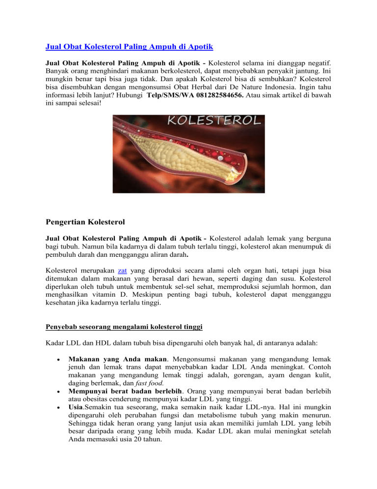 Jual Obat Kolesterol Paling Ampuh di Apotik Jual Obat Kolesterol Paling Ampuh di Apotik - Kolesterol selama ini dianggap negatif. Banyak orang menghindari makanan berkolesterol, dapat menyebabkan penyakit jantung. Ini mungkin benar tapi bisa juga tidak. Dan apakah Kolesterol bisa di sembuhkan? Kolesterol bisa disembuhkan dengan mengonsumsi Obat Herbal dari De Nature Indonesia. Ingin tahu informasi lebih lanjut? Hubungi Telp/SMS/WA 081282584656. Atau simak artikel di bawah ini sampai selesai! Pengertian Kolesterol Jual Obat Kolesterol Paling Ampuh di Apotik - Kolesterol adalah lemak yang berguna bagi tubuh. Namun bila kadarnya di dalam tubuh terlalu tinggi, kolesterol akan menumpuk di pembuluh darah dan mengganggu aliran darah. Kolesterol merupakan zat yang diproduksi secara alami oleh organ hati, tetapi juga bisa ditemukan dalam makanan yang berasal dari hewan, seperti daging dan susu. Kolesterol diperlukan oleh tubuh untuk membentuk sel-sel sehat, memproduksi sejumlah hormon, dan menghasilkan vitamin D. Meskipun penting bagi tubuh, kolesterol dapat mengganggu kesehatan jika kadarnya terlalu tinggi. Penyebab seseorang mengalami kolesterol tinggi Kadar LDL dan HDL dalam tubuh bisa dipengaruhi oleh banyak hal, di antaranya adalah: Makanan yang Anda makan. Mengonsumsi makanan yang mengandung lemak jenuh dan lemak trans dapat menyebabkan kadar LDL Anda meningkat. Contoh makanan yang mengandung lemak tinggi adalah, gorengan, ayam dengan kulit, daging berlemak, dan fast food. Mempunyai berat badan berlebih. Orang yang mempunyai berat badan berlebih atau obesitas cenderung mempunyai kadar LDL yang tinggi. Usia.Semakin tua seseorang, maka semakin naik kadar LDL-nya. Hal ini mungkin dipengaruhi oleh perubahan fungsi dan metabolisme tubuh yang makin menurun. Sehingga tidak heran orang yang lanjut usia akan memiliki jumlah LDL yang lebih besar daripada orang yang lebih muda. Kadar LDL akan mulai meningkat setelah Anda memasuki usia 20 tahun. Kurang olahraga. Olahraga ternyata bisa membantu meningkatkan kadar HDL dan juga membuat LDL menjadi kurang berbahaya, dengan cara meningkatkan ukuran partikel yang membentuk LDL. Riwayat keluarga. Bila anggota keluarga Anda ada yang memiliki riwayat kolesterol tinggi, Anda mungkin akan mengalami hal yang sama. Orang kurus yang mempunyai keturunan kolesterol tinggi pun bisa jadi mempunyai kolesterol yang tinggi juga. Jadi, penyakit ini tidak hanya bisa dimiliki oleh orang gemuk saja, jangan salah. Genetik dapat mengontrol sel agar tidak menghilangkan LDL dalam darah dengan cepat atau juga dapat menyebabkan hati menghasilkan terlalu banyak LDL. Oleh karena itu, jika Anda mempunyai keturunan kolesterol tinggi, sebaiknya kontrol faktor-faktor yang bisa diubah (seperti menjaga asupan makan dan berolahraga). Gejala Kolesterol Jual Obat Kolesterol Paling Ampuh di Apotik - Kolesterol tinggi tidak menimbulkan gejala. Akibatnya, banyak orang tidak sadar memiliki kadar kolesterol tinggi, sampai muncul komplikasi serius seperti penyakit jantung atau stroke. Oleh sebab itu, penting untuk melakukan tes darah untuk mengetahui normal atau tingginya kolesterol.Untuk orang dewasa, disarankan untuk melakukan pemeriksaan kolesterol tiap 4-6 tahun sekali, mulai usia 20 tahun. Walaupun jarang mengalami kolesterol tinggi, pemeriksaan kolesterol pada anak-anak juga disarankan pada saat anak berusia 9-11 tahun, dan diulangi pada saat berusia 17-21. Pada anak-anak dari keluarga penderita diabetes dan kolesterol tinggi, pemeriksaan kolesterol disarankan pada saat anak berusia 2-8 tahun dan diulangi pada usia 12-16 tahun. Informasi lebih lanjut hubungi Telp/SMS/WA 081282584656 Akibat Kolesterol Tinggi Kadar kolesterol yang berlebihan perlu ditangani. Apabila dibiarkan, kolesterol akan menumpuk di dinding pembuluh darah arteri dan membentuk plak, sehingga membuat arteri menyempit. Kondisi ini disebut dengan aterosklerosis. Aterosklerosis lama kelamaan dapat membuat aliran darah tersumbat, akibatnya menimbulkan sejumlah penyakit berbahaya berikut ini: Penyakit jantung koroner. Penyumbatan terjadi di pembuluh arteri jantung, sehingga otot jantung kurang mendapat nutrisi. Serangan jantung. Serangan jantung terjadi ketika aliran darah ke jantung tersumbat total. Stroke. Stroke terjadi ketika aliran darah ke otak tersumbat. Penyakit arteri perifer. Kondisi ini terjadi ketika aliran darah ke tungkai tersumbat. Obat alami kurangi kolesterol Moringa dan Habatop De Nature PAKET HERBAL KOLESTEROLKONSULTASI DAN CARA PEMESANAN HUBUNGI CUSTOMER SERVICE KAMI : TELP/WA : 081282584656 Cara mencegah atau menurunkan kadar kolesterol 1. Gaya hidup sehat sangat diperlukan dalam mengani kondisi kolesterol tinggi. 2. Mengonsumsi makanan sehat dan bergizi seimbang adalah salah satu langkahutama yang bisa dilakukan dalam mencegah atau menurunkan kadar kolesterol. 3. Kandungan lemak dalam makanan harus rendah. Cobalah ganti konsumsi makanan yang mengandung lemak jenuh dengan buah-buahan dan sayur-sayuran, serta bijibijian utuh (misalnya roti gandum utuh). 4. Dengan begitu, kadar kolesterol dalam tubuh akan tetap rendah. Selain diet sehat, 5. Segera mulai melakukan olah raga secara rutin dan turunkan berat badan bagi yang mengalami kelebihan berat badan. 6. Hindari merokok. Pertanyaan yang sering terpikirkan di benak Anda : Jika Saya terlanjur kena penyakit kolesterol, bagaimana cara mengobatinya? Bagaimana cara mengobati penyakit kolesterol dengan cepat dan tuntas? Bagaimana berobat yang mudah tanpa perlu ke dokter? Jawabannya: semua bisa, asal Anda memilih produk yang tepat, yaitu Moringa dan Habatop De Nature Pengobatan Penyakit Kolesterol Jual Obat Kolesterol Paling Ampuh di Apotik - Pengobatan kolesterol secara tradisional yaitu dengan menggunakan Obat kolesterol dari De Nature. Produk yang terbuat dari bahan herbal alami diramu dengan resep tradisional dan diolah secara teknologi modern, sehingga aman di konsumsi. Jadi anda juga tak perlu khawatir karena Obat Herbal De Nature yang kami tawarkan ini, Alhamdul