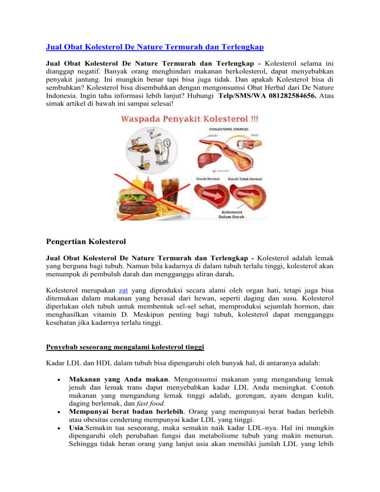 Jual Obat Kolesterol De Nature Termurah dan Terlengkap Jual Obat Kolesterol De Nature Termurah dan Terlengkap - Kolesterol selama ini dianggap negatif. Banyak orang menghindari makanan berkolesterol, dapat menyebabkan penyakit jantung. Ini mungkin benar tapi bisa juga tidak. Dan apakah Kolesterol bisa di sembuhkan? Kolesterol bisa disembuhkan dengan mengonsumsi Obat Herbal dari De Nature Indonesia. Ingin tahu informasi lebih lanjut? Hubungi Telp/SMS/WA 081282584656. Atau simak artikel di bawah ini sampai selesai! Pengertian Kolesterol Jual Obat Kolesterol De Nature Termurah dan Terlengkap - Kolesterol adalah lemak yang berguna bagi tubuh. Namun bila kadarnya di dalam tubuh terlalu tinggi, kolesterol akan menumpuk di pembuluh darah dan mengganggu aliran darah. Kolesterol merupakan zat yang diproduksi secara alami oleh organ hati, tetapi juga bisa ditemukan dalam makanan yang berasal dari hewan, seperti daging dan susu. Kolesterol diperlukan oleh tubuh untuk membentuk sel-sel sehat, memproduksi sejumlah hormon, dan menghasilkan vitamin D. Meskipun penting bagi tubuh, kolesterol dapat mengganggu kesehatan jika kadarnya terlalu tinggi. Penyebab seseorang mengalami kolesterol tinggi Kadar LDL dan HDL dalam tubuh bisa dipengaruhi oleh banyak hal, di antaranya adalah: Makanan yang Anda makan. Mengonsumsi makanan yang mengandung lemak jenuh dan lemak trans dapat menyebabkan kadar LDL Anda meningkat. Contoh makanan yang mengandung lemak tinggi adalah, gorengan, ayam dengan kulit, daging berlemak, dan fast food. Mempunyai berat badan berlebih. Orang yang mempunyai berat badan berlebih atau obesitas cenderung mempunyai kadar LDL yang tinggi. Usia.Semakin tua seseorang, maka semakin naik kadar LDL-nya. Hal ini mungkin dipengaruhi oleh perubahan fungsi dan metabolisme tubuh yang makin menurun. Sehingga tidak heran orang yang lanjut usia akan memiliki jumlah LDL yang lebih besar daripada orang yang lebih muda. Kadar LDL akan mulai meningkat setelah Anda memasuki usia 20 tahun. Kurang olahraga. Olahraga ternyata bisa membantu meningkatkan kadar HDL dan juga membuat LDL menjadi kurang berbahaya, dengan cara meningkatkan ukuran partikel yang membentuk LDL. Riwayat keluarga. Bila anggota keluarga Anda ada yang memiliki riwayat kolesterol tinggi, Anda mungkin akan mengalami hal yang sama. Orang kurus yang mempunyai keturunan kolesterol tinggi pun bisa jadi mempunyai kolesterol yang tinggi juga. Jadi, penyakit ini tidak hanya bisa dimiliki oleh orang gemuk saja, jangan salah. Genetik dapat mengontrol sel agar tidak menghilangkan LDL dalam darah dengan cepat atau juga dapat menyebabkan hati menghasilkan terlalu banyak LDL. Oleh karena itu, jika Anda mempunyai keturunan kolesterol tinggi, sebaiknya kontrol faktor-faktor yang bisa diubah (seperti menjaga asupan makan dan berolahraga). Gejala Kolesterol Jual Obat Kolesterol De Nature Termurah dan Terlengkap - Kolesterol tinggi tidak menimbulkan gejala. Akibatnya, banyak orang tidak sadar memiliki kadar kolesterol tinggi, sampai muncul komplikasi serius seperti penyakit jantung atau stroke. Oleh sebab itu, penting untuk melakukan tes darah untuk mengetahui normal atau tingginya kolesterol.Untuk orang dewasa, disarankan untuk melakukan pemeriksaan kolesterol tiap 4-6 tahun sekali, mulai usia 20 tahun. Walaupun jarang mengalami kolesterol tinggi, pemeriksaan kolesterol pada anak-anak juga disarankan pada saat anak berusia 9-11 tahun, dan diulangi pada saat berusia 17-21. Pada anak-anak dari keluarga penderita diabetes dan kolesterol tinggi, pemeriksaan kolesterol disarankan pada saat anak berusia 2-8 tahun dan diulangi pada usia 12-16 tahun. Informasi lebih lanjut hubungi Telp/SMS/WA 081282584656 Akibat Kolesterol Tinggi Kadar kolesterol yang berlebihan perlu ditangani. Apabila dibiarkan, kolesterol akan menumpuk di dinding pembuluh darah arteri dan membentuk plak, sehingga membuat arteri menyempit. Kondisi ini disebut dengan aterosklerosis. Aterosklerosis lama kelamaan dapat membuat aliran darah tersumbat, akibatnya menimbulkan sejumlah penyakit berbahaya berikut ini: Penyakit jantung koroner. Penyumbatan terjadi di pembuluh arteri jantung, sehingga otot jantung kurang mendapat nutrisi. Serangan jantung. Serangan jantung terjadi ketika aliran darah ke jantung tersumbat total. Stroke. Stroke terjadi ketika aliran darah ke otak tersumbat. Penyakit arteri perifer. Kondisi ini terjadi ketika aliran darah ke tungkai tersumbat. Obat alami kurangi kolesterol Moringa dan Habatop De Nature PAKET HERBAL KOLESTEROLKONSULTASI DAN CARA PEMESANAN HUBUNGI CUSTOMER SERVICE KAMI : TELP/WA : 081282584656 Cara mencegah atau menurunkan kadar kolesterol 1. Gaya hidup sehat sangat diperlukan dalam mengani kondisi kolesterol tinggi. 2. Mengonsumsi makanan sehat dan bergizi seimbang adalah salah satu langkahutama yang bisa dilakukan dalam mencegah atau menurunkan kadar kolesterol. 3. Kandungan lemak dalam makanan harus rendah. Cobalah ganti konsumsi makanan yang mengandung lemak jenuh dengan buah-buahan dan sayur-sayuran, serta bijibijian utuh (misalnya roti gandum utuh). 4. Dengan begitu, kadar kolesterol dalam tubuh akan tetap rendah. Selain diet sehat, 5. Segera mulai melakukan olah raga secara rutin dan turunkan berat badan bagi yang mengalami kelebihan berat badan. 6. Hindari merokok. Pertanyaan yang sering terpikirkan di benak Anda : Jika Saya terlanjur kena penyakit kolesterol, bagaimana cara mengobatinya? Bagaimana cara mengobati penyakit kolesterol dengan cepat dan tuntas? Bagaimana berobat yang mudah tanpa perlu ke dokter? Jawabannya: semua bisa, asal Anda memilih produk yang tepat, yaitu Moringa dan Habatop De Nature Pengobatan Penyakit Kolesterol Jual Obat Kolesterol De Nature Termurah dan Terlengkap - Pengobatan kolesterol secara tradisional yaitu dengan menggunakan Obat kolesterol dari De Nature. Produk yang terbuat dari bahan herbal alami diramu dengan resep tradisional dan diolah secara teknologi modern, sehingga aman di konsumsi. Jadi anda juga tak perlu khawatir karena
