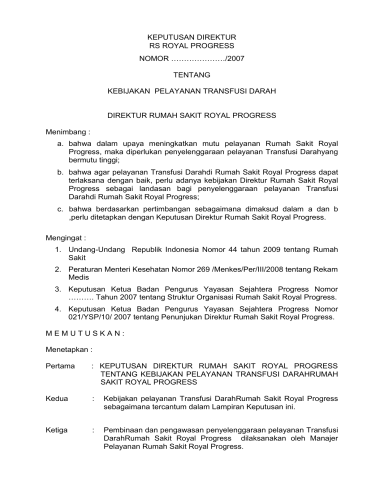 KEPUTUSAN DIREKTUR RS ROYAL PROGRESS NOMOR …………………/2007 TENTANG KEBIJAKAN PELAYANAN TRANSFUSI DARAH DIREKTUR RUMAH SAKIT ROYAL PROGRESS Menimbang : a. bahwa dalam upaya meningkatkan mutu pelayanan Rumah Sakit Royal Progress, maka diperlukan penyelenggaraan pelayanan Transfusi Darahyang bermutu tinggi; b. bahwa agar pelayanan Transfusi Darahdi Rumah Sakit Royal Progress dapat terlaksana dengan baik, perlu adanya kebijakan Direktur Rumah Sakit Royal Progress sebagai landasan bagi penyelenggaraan pelayanan Transfusi Darahdi Rumah Sakit Royal Progress; c. bahwa berdasarkan pertimbangan sebagaimana dimaksud dalam a dan b ,perlu ditetapkan dengan Keputusan Direktur Rumah Sakit Royal Progress. Mengingat : 1. Undang-Undang Republik Indonesia Nomor 44 tahun 2009 tentang Rumah Sakit 2. Peraturan Menteri Kesehatan Nomor 269 /Menkes/Per/III/2008 tentang Rekam Medis 3. Keputusan Ketua Badan Pengurus Yayasan Sejahtera Progress Nomor ………. Tahun 2007 tentang Struktur Organisasi Rumah Sakit Royal Progress. 4. Keputusan Ketua Badan Pengurus Yayasan Sejahtera Progress Nomor 021/YSP/10/ 2007 tentang Penunjukan Direktur Rumah Sakit Royal Progress. MEMUTUSKAN: Menetapkan : Pertama : KEPUTUSAN DIREKTUR RUMAH SAKIT ROYAL PROGRESS TENTANG KEBIJAKAN PELAYANAN TRANSFUSI DARAHRUMAH SAKIT ROYAL PROGRESS Kedua : Kebijakan pelayanan Transfusi DarahRumah Sakit Royal Progress sebagaimana tercantum dalam Lampiran Keputusan ini. Ketiga : Pembinaan dan pengawasan penyelenggaraan pelayanan Transfusi DarahRumah Sakit Royal Progress dilaksanakan oleh Manajer Pelayanan Rumah Sakit Royal Progress. Keempat : Keputusan ini berlaku sejak tanggal ditetapkannya, dan apabila di kemudian hari ternyata terdapat kekeliruan dalam penetapan ini akan diadakan perbaikan sebagaimana mestinya Ditetapkan di J a k a r t a Pada tanggal ................ 2010 Direktur Rumah Sakit Royal Progress, Dr. Djoti Atmodjo, SpA , MARS Lampiran Keputusan Direktur RS Royal Progress Nomor : Tanggal : KEBIJAKAN PELAYANAN TRANSFUSI DARAH RUMAH SAKIT ROYAL PROGRESS Kebijakan Umum 1. Peralatan di unit harus selalu dilakukan pemeliharaan dan kalibrasi sesuai dengan ketentuan yang berlaku. 2. Pelayanan di unit harus selalu berorientasi kepada mutu dan keselamatan pasien. 3. Semua petugas unit wajib memiliki izin sesuai dengan ketentuan yang berlaku. 4. Dalam melaksanakan tugasnya setiap petugas wajib mematuhi ketentuan dalam K3 (Keselamatan dan Kesehatan Kerja) 5. Setiap petugas harus bekerja sesuai dengan standar profesi, standar prosedur opersinal yang berlaku, etika profesi, etikket, dan menghormati hak pasien. 6. Pelayanan unit dilaksanakan dalam 24 jam. 7. Penyediaan tenaga harus mengacu kepada pola ketenagaan. 8. Untuk melaksanakan koordinasi dan evaluasi wajib dilaksanakan rapat rutin bulanan minimal satu bulan sekali. 9. Setiap bulan wajib membuat laporan. Kebijakan Khusus 1. Setiap permintaan darah harus berdasarkan atas permintaan dokter. 2. Pelayanan Unit Transfusi Darah ( UTD ) harus selalu berorientasi kepada mutu dan keselamatan pasien. 3. Unit Transfusi Darah ( UTD ) dipimpin oleh dokter spesialis Patologi Klinik. 4. Untuk mempertahankan dan meningkatkan kompetensi, setiap petugas wajib mengikuti pelatihan di bidang transfusi darah yang diselenggarakan oleh Palang merah Indonesia ( PMI ). 5. Darah untuk pasien kelompok “ cito “ akan diprioritaskan daripada pasien yang tidak tergolong “ cito “. 6. Dokter bertugas memutuskan pemberian, pengawasan dan pemeriksaan lebih lanjut. 7. Bila persediaan darah di Unit Transfusi Darah RSRP tidak mencukupi atau tidak ada, baru di cari ke PMI. 8. Sebelum melakukan transfusi darah, pasien harus melalui serangkaian pemeriksaan kelayakan. 9. Unit Transfusi Darah RSRP menerima permintaan darah dari luar Rumah Sakit. 10. Unit Transfusi Darah RSRP menerima pelayanan donor darah sukarela. 11. Pada pelaksanaan transfusi darah hendaknya dilaksanakan secara aman dan meminimalkan resiko transfusi. Direktur, Rumah Sakit Royal Progress Dr. Djoti Atmodjo, SpA, MARS