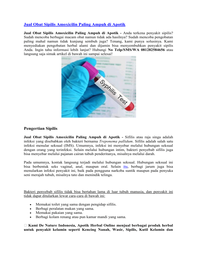 Jual Obat Sipilis Amoxicilin Paling Ampuh di Apotik Jual Obat Sipilis Amoxicilin Paling Ampuh di Apotik - Anda terkena penyakit sipilis? Sudah mencoba berbagai macam obat namun tidak ada hasilnya? Sudah mencoba pengobatan paling mahal namun tidak kunjung sembuh juga? Tenang, kami punya solusinya. Kami menyediakan pengobatan herbal alami dan dijamin bisa menyembuhkan penyakit sipilis Anda. Ingin tahu informasi lebih lanjut? Hubungi No Telp/SMS/WA 081282584656 atau langsung saja simak artikel di bawah ini sampai selesai! Pengertian Sipilis Jual Obat Sipilis Amoxicilin Paling Ampuh di Apotik - Sifilis atau raja singa adalah infeksi yang disebabkan oleh bakteri bernama Treponema pallidum. Sifilis adalah salah satu infeksi menular seksual (IMS). Umumnya, infeksi ini menyebar melalui hubungan seksual dengan orang yang terinfeksi. Selain melalui hubungan intim, bakteri penyebab sifilis juga bisa menyebar melalui pajanan cairan tubuh penderitanya, misalnya melalui darah. Pada umumnya, kontak langsung terjadi melalui hubungan seksual. Hubungan seksual ini bisa berbentuk seks vaginal, anal, maupun oral. Selain itu, berbagi jarum juga bisa menularkan infeksi penyakit ini, baik pada pengguna narkoba suntik maupun pada penyuka seni merajah tubuh, misalnya tato dan menindik telinga. Bakteri penyebab sifilis tidak bisa bertahan lama di luar tubuh manusia, dan penyakit ini tidak dapat ditularkan lewat cara-cara di bawah ini: Memakai toilet yang sama dengan pengidap sifilis. Berbagi peralatan makan yang sama. Memakai pakaian yang sama. Berbagi kolam renang atau pun kamar mandi yang sama. � Kami De Nature Indonesia, Apotik Herbal Online menjual berbagai produk herbal untuk penyakit kelamin seperti Kencing Nanah, Wasir, Sipilis, Kutil Kelamin dan lainnya. Untuk konsultasi dan pemesanan hubungi no Telp/SMS/WA 081282584656. De Nature Indonesia beralamat di Perum Cendana Asri No.9 Majenang, Jl. Pahonjean Km.5 Majenang, Cilacap, Jawa Tengah � Tahapan Sipilis Gejala pertama sifilis muncul sekitar tiga minggu setelah bakteri memasuki tubuh. Infeksi sifilis terbagi menjadi empat tahapan utama, antara lain: Sifilis Primer Penderita sifilis mengalami gejala yang dimulai dengan lesi atau luka pada alat kelamin atau di dalam dan di sekitar mulut. Luka yang terjadi berbentuk seperti gigitan serangga tapi tidak menimbulkan rasa sakit. Pada tahap ini, jika orang yang terinfeksi berhubungan seksual dengan orang lain, penularan sangat mudah terjadi. Luka ini bertahan selama 1-2 bulan. Pada akhirnya, lesi ini akan sembuh tanpa meninggalkan bekas. � � Sifilis Sekunder Penderita sifilis sekunder akan mengalami ruam merah serukuran koin kecil dan biasanya ruam ini muncul pada telapak tangan dan telapak kaki. Gejala lain yang mungkin muncul adalah demam, nafsu makan menurun, radang tenggorokan dan kutil kelamin. Fase ini bisa bertahan selama satu hingga tiga bulan. � Sifilis Laten Setelah fase sifilis sekunder, sifilis seakan-akan menghilang dan tidak menimbulkan gejala sama sekali. Masa laten ini bisa bertahan sekitar dua tahun sebelum kemudian lanjut ke masa yang paling berbahaya dalam infeksi sifilis yaitu sifilis tersier. � Sifilis Tersier Jika infeksi tidak terobati, sifilis akan berkembang ke tahapan akhir, yaitu sifilis tersier. Pada tahap ini, infeksi bisa memberi efek yang serius pada tubuh. Beberapa akibat dari infeksi pada tahapan ini adalah kelumpuhan, kebutaan, demensia, masalah pendengaran, impotensi, dan bahkan kematian jika tidak ditangani. Sifilis paling mudah menular pada fase sifilis primer dan sekunder. Jika Anda merasa terinfeksi sifilis, segera periksakan diri ke dokter atau klinik spesialis penyakit kelamin untuk memastikan diagnosis terhadap sifilis. Makin cepat sifilis diobati, makin kecil kemungkinan sifilis berkembang menjadi penyakit yang serius. GEJALA ATAU TANDA PENYAKIT SIPILIS Jual Obat Sipilis Amoxicilin Paling Ampuh di Apotik - Penyakit sipilis bisa menyebabkan kerusakan organ-organ tubuh. Kerusakan tersebut bisa menimpa syaraf, otak, otot, tulang, mata, serta organ bagian tubuh yang lainnya. Bahkan, jika sudah stadium lajut penyakit ini dapat menyebabkan kematian pada si penderita.Penyakit kelamin yang satu ini memang tidak boleh dianggap remeh. Perlu Anda ketahui bahwa penyakit ini akan menggerogoti sistem kekebalan tubuh penderita sehingga tubuh si penderita akan sangat mudah terkena penyakit dan bertambah parah karena infeksi dari bakteri penyebab penyakit ini menyebar keseluruh tubuh dengan cepat. Untuk itu sebaiknya kita dapat mengenali tanda-tanda penyakit kelamin ini melalui gejala yang muncul. Informasi lebih lanjut hubungi Telp/SMS/WA 081282584656 Gejala/Tanda Penyakit Sipilis Pada Wanita 1. Keluarnya cairan tidak normal dari saluran kencing atau liang senggama 2. Timbulnya keputihan yang banyak, berbau amis, dan warnanya cenderung putih kehijauan. 3. Rasa nyeri ketika buang air kecil 4. Rasa nyeri saat berhubungan seksual 5. Timbulnya rasa gatal di alat kelamin atau sekitarnya dan menjadi luka koreng di kelamin. 6. Timbulnya luka kecil (terkadang tidak terasa sakit) disertai pembengkakan kelenjar getah bening. 7. Terjadinya perubahan warna kulit dan mata komplikasi bartolitis, yaitu membengkaknya kelenjar Bartholin mengakibatkan kesulitan berjalan karena rasa nyeri. Gejala/Tanda Penyakit Sipilis Pada Pria Sering nyeri selama hubungan seksual. Nyeri ketika buang air kecil. Keluarnya cairan atau kotoran dari penis laki-laki. Ada luka kerongkongan pada orang-orang melakukan oral sek, sehingga kerongkongan sering terasa sakit. Nyeri pada daerah sekitar anus (hal ini terjadi pada orang-orang melakukan anal sex). Luka memerah tanpa rasa sakit pada daerah kelamin, anus, kerongkongan dan atau lidah. Bintik merah pada kulit dan menjadi luka koreng di kelamin. Timbulnya bersisik pada telapak tangan dan telapak kaki. Urine (air kencing) berwarna cenderung gelap, feses berwarna terang. Mata dan kulit cendrung berwarna kuning. Timbulnya bentuk lepuh kecil pada daerah kelamin, dimana 