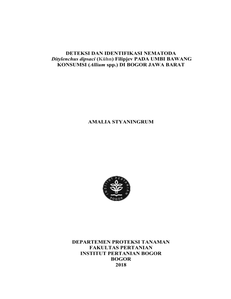 DETEKSI DAN IDENTIFIKASI NEMATODA Ditylenchus dipsaci (Kühn) Filipjev PADA UMBI BAWANG KONSUMSI (Allium spp.) DI BOGOR JAWA BARAT AMALIA STYANINGRUM DEPARTEMEN PROTEKSI TANAMAN FAKULTAS PERTANIAN INSTITUT PERTANIAN BOGOR BOGOR 2018 PERNYATAAN MENGENAI SKRIPSI DAN SUMBER INFORMASI SERTA PELIMPAHAN HAK CIPTA Dengan ini saya menyatakan bahwa skripsi berjudul “Deteksi Dan Identifikasi Nematoda Ditylenchus Dipsaci (Kühn) Filipjev Pada Umbi Bawang Konsumsi (Allium Spp.) di Bogor Jawa Barat” adalah benar karya saya dengan arahan komisi pembimbing dan belum diajukan dalam bentuk apa pun kepada perguruan tinggi mana pun. Sumber informasi yang berasal atau dikutip dari karya yang diterbitkan maupun tidak diterbitkan dari penulis lain telah disebutkan dalam teks dan dicantumkan dalam Daftar Pustaka di bagian akhir skripsi ini. Dengan ini saya melimpahkan hak cipta dari karya tulis saya kepada Institut Pertanian Bogor. Bogor, Oktober 2018 Amalia Styaningrum NIM A34140076 ABSTRAK AMALIA STYANINGRUM. Deteksi dan Identifikasi Nematoda Ditylenchus dipsaci (Kühn) Filipjev pada Umbi Bawang Konsumsi (Allium spp.) di Bogor Jawa Barat. Dibimbing oleh SUPRAMANA. Nematoda umbi Ditylenchus dipsaci merupakan parasit utama pertanaman bawang dan belum dilaporkan ada di wilayah Indonesia. Importasi umbi bawang mencapai 17121.34 ton per tahun dapat menjadi media pembawa hama dan patogen penting. Hama dan patogen yang terbawa berpotensi merusak pertanaman Indonesia. Penelitian ini bertujuan mendeteksi dan mengidentifikasi secara morfologi dan morfometri nematoda D. dipsaci yang terbawa umbi bawang konsumsi, yaitu bawang putih (Allium sativum), bawang bombai (Allium cepa), dan bawang merah (Allium ascalonicum) di Bogor, Jawa Barat. Penelitian dilakukan dengan 5 tahapan kegiatan yaitu pengambilan contoh umbi bawang, pendataan, ekstraksi nematoda, perhitungan populasi nematoda, identifikasi morfologi dan pengukuran morfometrik nematoda, dan analisis data. Pengambilan contoh umbi bawang dilakukan di 5 pasar tradisional dan 5 pasar swalayan. Ekstraksi nematoda dilakukan dengan menggunakan metode corong Baerrman yang dimodifikasi. Air perendaman untuk ekstraksi nematoda menggunakan aquades bersuhu 4 ºC dan diletakkan pada ruangan bersuhu 20 ºC dalam keadaan gelap selama 96 jam. Populasi nematoda dihitung dengan cara sampling yang diulang sebanyak 3 kali. Fiksasi nematoda dilakukan dengan menggunakan metode Ryss untuk memudahkan pengamatan morfologi nematoda. Identifikasi morfologi dan pengukuran karakter morfometrik nematoda dilakukan dengan mengacu pada formula J G De Man. Analisis deskriptif data morfometrik nematoda dilakukan dengan Microsoft Excel 2013. Nematoda D. dipsaci berhasil dideteksi pada bawang putih konsumsi di 5 pasar tradisional dan 1 pasar swalayan. Nematoda berhasil diidentifikasi secara morfologi dan morfometrik. Kata kunci : bawang putih, nematoda umbi, pasar ABSTRACT AMALIA STYANINGRUM. Detection and Identificaton of Ditylenchus dipsaci on Onion Bulbs (Allium spp.) for Consumption in Bogor, West Java. Supervised by SUPRAMANA. Stem and bulb nematode Ditylenchus dipsaci is the main parasitic nematode of onions and has not been reported present in Indonesia. Importation of onion bulb for consumption that reaches 17121.34 tons per year could be an important media for pests and pathogens introduction. The introduction of invasive pests and pathogens have the potential to damage Indonesian crops. This research aims to detect the nematode Ditylenchus dipsaci carried on onion bulb for consumption, includes garlic (Allium sativum), onions (Allium cepa), and shalllots (Allium ascalonicum) in Bogor, West Java. Research was conducted in five steps that are sampling, logging, extraction of nematodes, nematode counting, morphological identification and morphometric measurements of nematodes, and data analysis. Sample of onion bulbs were taken from 5 traditional markets and 5 supermarkets in Bogor. Nematode extraction was done using a modified Baerman funnel method. Nematode extraction was conducted by soaking sampled bulbs into 4ºC distilled water and incubated in a dark room with temperature of 20ºC for 96 hour. Nematode fixation was done according to Ryss method to facilitate morphological observations. Nematode morphological identification and measurement of morphometric characters were carried out based on the J G De Man formula. Nematode morphometric descriptive data was analysed with Microsoft Excel 2013. Ditylenchus dipsaci was detected on garlic bulbs sampled from five traditional markets and one supermarket. The nematode was succesfully identified morphologically and morphometrically. Keywords : bulb nematode, garlic, markets © Hak Cipta milik IPB, tahun 2018 Hak Cipta Dilindungi Undang-Undang Dilarang mengutip sebagian atau seluruh karya tulis ini tanpa mencantumkan atau menyebutkan sumbernya. Pengutipan hanya untuk kepentingan pendidikan, penelitian, penulisan karya ilmiah, penyusunan laporan, penulisan kritik, atau tinjauan suatu masalah; dan pengutipan tersebut tidak merugikan kepentingan yang wajar IPB. Dilarang mengumumkan dan memperbanyak sebagian atau seluruh karya tulis dalam bentuk apa pun tanpa izin IPB. DETEKSI DAN IDENTIFIKASI NEMATODA Ditylenchus dipsaci (Kühn) Filipjev PADA UMBI BAWANG KONSUMSI (Allium spp.) DI BOGOR JAWA BARAT AMALIA STYANINGRUM Skripsi sebagai salah satu syarat untuk memperoleh gelar Sarjana Pertanian pada Departemen Proteksi Tanaman DEPARTEMEN PROTEKSI TANAMAN FAKULTAS PERTANIAN INSTITUT PERTANIAN BOGOR BOGOR 2018 PRAKATA Puji dan syukur penulis panjatkan kepada Allah subhanahu wa ta’ala atas segala karunia-Nya sehingga penelitian tugas akhir ini berhasil diselesaikan. Judul penelitian yang dipilih dalam penelitian ini adalah Deteksi dan Identifikasi Nematoda Ditylenchus dipsaci (Kühn) Filipjev pada Umbi Bawang Konsumsi (Allium spp.) Di Bogor Jawa Barat sebagai deteksi dini dalam upaya pencegahan masuknya organisme pengganggu tanaman karantina A1 ke dalam w