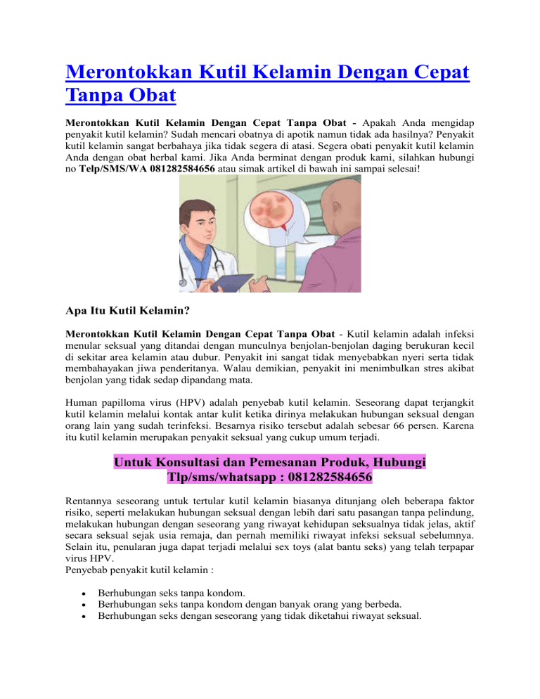 Merontokkan Kutil Kelamin Dengan Cepat Tanpa Obat Merontokkan Kutil Kelamin Dengan Cepat Tanpa Obat - Apakah Anda mengidap penyakit kutil kelamin? Sudah mencari obatnya di apotik namun tidak ada hasilnya? Penyakit kutil kelamin sangat berbahaya jika tidak segera di atasi. Segera obati penyakit kutil kelamin Anda dengan obat herbal kami. Jika Anda berminat dengan produk kami, silahkan hubungi no Telp/SMS/WA 081282584656 atau simak artikel di bawah ini sampai selesai! Apa Itu Kutil Kelamin? Merontokkan Kutil Kelamin Dengan Cepat Tanpa Obat - Kutil kelamin adalah infeksi menular seksual yang ditandai dengan munculnya benjolan-benjolan daging berukuran kecil di sekitar area kelamin atau dubur. Penyakit ini sangat tidak menyebabkan nyeri serta tidak membahayakan jiwa penderitanya. Walau demikian, penyakit ini menimbulkan stres akibat benjolan yang tidak sedap dipandang mata. Human papilloma virus (HPV) adalah penyebab kutil kelamin. Seseorang dapat terjangkit kutil kelamin melalui kontak antar kulit ketika dirinya melakukan hubungan seksual dengan orang lain yang sudah terinfeksi. Besarnya risiko tersebut adalah sebesar 66 persen. Karena itu kutil kelamin merupakan penyakit seksual yang cukup umum terjadi. Untuk Konsultasi dan Pemesanan Produk, Hubungi Tlp/sms/whatsapp : 081282584656 Rentannya seseorang untuk tertular kutil kelamin biasanya ditunjang oleh beberapa faktor risiko, seperti melakukan hubungan seksual dengan lebih dari satu pasangan tanpa pelindung, melakukan hubungan dengan seseorang yang riwayat kehidupan seksualnya tidak jelas, aktif secara seksual sejak usia remaja, dan pernah memiliki riwayat infeksi seksual sebelumnya. Selain itu, penularan juga dapat terjadi melalui sex toys (alat bantu seks) yang telah terpapar virus HPV. Penyebab penyakit kutil kelamin : Berhubungan seks tanpa kondom. Berhubungan seks tanpa kondom dengan banyak orang yang berbeda. Berhubungan seks dengan seseorang yang tidak diketahui riwayat seksual. Stres dan menderita infeksi virus lainnya seperti HIV atau herpes pada waktu yang sama. Tanda-tanda Ciri Penyakit Kutil Kelamin : Merontokkan Kutil Kelamin Dengan Cepat Tanpa Obat - Berikut Ciri ciri kutil kelamin pada wanita (Kondiloma Akuminata) atau jengger ayam ini bisa jadi penyakit paling mematikan dunia jika tidak segera di obati. Tidak hanya wanita sajayang patut mewaspadai tentang penyakit kutil kelamin ini, pria pun harus waspada pada munculnya kutil di kelamin tersebut. Berikut ini tanda-tanda atau ciri -ciri kutil kelamin beserta munculnya penyakit kutil kelamin atau jengger ayam yang patut di waspadai : Munculnya Benjolan di kelamin secara bergerombol Benjolan berisi daging Bentuk benjolan kecil Bengkak Kemerahan Menyerupai Jengger Ayam Menyerupai Kembang Kol Terasa Gatal Tidak Nyaman Pendarahan Nyeri Berbau Perih Kutil bisa berdarah Pada wanita muncul di bibir vagina, serviks, vagina Warna Kutil di kelamin hitam agak kemerahan, abu-abu agak kemerahan, cokelat agak kemerahan dan juga merah. Daerah penyebaran kutil kelamin pada Pria: Batang penis. Ujung kepala penis. Selangkangan. Paha bagian atas. Disekitar anus atau bisa didalamnya. Di dalam Uretra. Daerah penyebaran kutil kelamin pada Wanita: Anus. Vulva. Bagian antara anus dan kelamin. Leher Rahim. Paha bagian atas. Bagaimana cara mencegah Penyakit Kutil Kelamin? Untuk mengurangi risiko infeksi kutil kelamin bisa dilakukan dengan berbagai cara, antara lain : Gunakan kondom dengan benar setiap kali Anda berhubungan seks. Setia terhadap pasangan, jangan berganti-ganti partner seks. Membatasi kontak seksual hanya dengan satu pasangan yang benar-benar steril. Pertanyaan yang sering terpikirkan di benak Anda : Jika Saya terlanjur kena kutil kelamin bagaimana cara mengobatinya? Bagaimana cara mengobati kutil kelamin dengan cepat dan tuntas? Bagaimana berobat yang mudah tanpa perlu malu untuk ke dokter? Jawabannya: semua bisa, asal Anda memilih produk yang tepat, yaitu Gang Jie Gho Siah Pipeca dan Kapsul BD De Nature. Pengobatan Penyakit Kutil Kelamin Merontokkan Kutil Kelamin Dengan Cepat Tanpa Obat - Pengobatan Kutil Kelamin secara tradisional yaitu dengan menggunakan Obat Kutil Kelamin dari De Nature. Produk yang terbuat dari bahan herbal alami diramu dengan resep tradisional dan diolah secara teknologi modern, sehingga aman di konsumsi. Jadi anda juga tak perlu khawatir karena Obat Herbal De Nature yang kami tawarkan ini, Alhamdulillah, merupakan obat yang telah banyak menyembuhkan penderitanya baik dari dalam maupun luar negeri. Sudah banyak pasien kami yang merasakan kesembuhannya dengan mengonsumsi obat herbal dari De Nature. Rp 950.000,Pemesanan obat hubungi tlp/sms/whatsapp : 081282584656 Sekedar informasi untuk kenyamanan Konsumen, bahwa Produk dari perusahaan kami ini sudah memiliki: Ijin Resmi Perusahaan dari Kementerian Kesehatan Ijin BPOM, yang artinya sudah lulus uji stabilitas Produk Sertifikat Halal MUI, sehingga halal bisa dipertanggungjawabkan Apoteker yang sudah berpengalaman Sudah melewati Proses Sortir Bahan Baku, Guna Menjaga Mutu Produk Proses Produksi Sesuai Alur CPOTB (Cara Pembuatan Obat Tradisional Yang Baik Dan Benar). Cara Pembelian: Pembayaran terlebih dulu via transfer Bank, setelah transfer SMS-kan konfirmasinya untuk proses pengiriman. Format Pemesanan: Nama, Alamat Lengkap beserta kode Pos, Nama Bank / Rekening anda, Nominal transfer, Nama Obat yg dipesan, No.Hp Anda Agar pesanan Anda bisa segera diproses, segera konfirmasikan pembayaran Anda via Telp/SMS/WA ke 081282584656 Setelah itu barang kami kirim melalui TIKI / JNE / J&T / POS. CONTOH SMS KONFIRMASI: Ahmad Husein, Jl.Raya Perumas Cendana Asri No.95, Kecamatan Majenang, Kabupaten Cilacap, Provinsi Jawa Tengah Kode Pos 53257, Rekening Pentransfer atas Nama Ahmad Husein, Transfer 320rb, Obat Eksim, 081xxxxxxxxx INFO LENGKAP HUBUNGI KAMI: Telp/SMS/WA ke 081282584656 Sistem Pembayaran : Nikmati pembayaran yang aman dan nyaman melalui Bank BRI, BNI, BCA, dan Mandiri. Jasa Pengiriman : Barang Kami Kirim via POS, JN