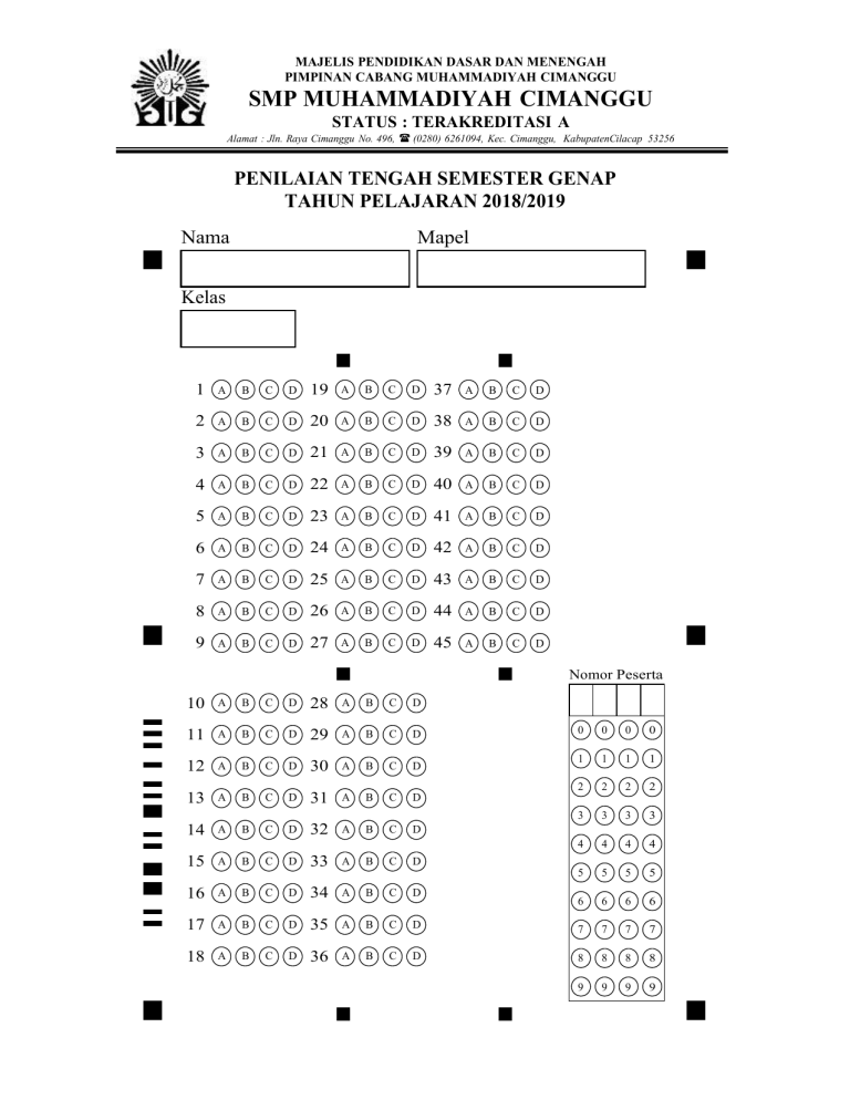 MAJELIS PENDIDIKAN DASAR DAN MENENGAH PIMPINAN CABANG MUHAMMADIYAH CIMANGGU SMP MUHAMMADIYAH CIMANGGU STATUS : TERAKREDITASI A Alamat : Jln. Raya Cimanggu No. 496, (0280) 6261094, Kec. Cimanggu, KabupatenCilacap 53256 PENILAIAN TENGAH SEMESTER GENAP TAHUN PELAJARAN 2018/2019 Nama Mapel Kelas 1 A B C D 19 A B C D 37 A B C D 2 A B C D 20 A B C D 38 A B C D 3 A B C D 21 A B C D 39 A B C D 4 A B C D 22 A B C D 40 A B C D 5 A B C D 23 A B C D 41 A B C D 6 A B C D 24 A B C D 42 A B C D 7 A B C D 25 A B C D 43 A B C D 8 A B C D 26 A B C D 44 A B C D 9 A B C D 27 A B C D 45 A B C D Nomor Peserta 10 A B C D 28 A B C D 11 A B C D 29 A B C D 12 A B C D 30 A B C D 13 A B C D 31 A B C D 14 A B C D 32 A B C D 15 A B C D 33 A B C D 16 A B C D 34 A B C D 17 A B C D 35 A B C 18 A B C D 36 A B C 0 0 0 0 1 1 1 1 2 2 2 2 3 3 3 3 4 4 4 4 5 5 5 5 6 6 6 6 D 7 7 7 7 D 8 8 8 8 9 9 9 9 MAJELIS PENDIDIKAN DASAR DAN MENENGAH PIMPINAN CABANG MUHAMMADIYAH CIMANGGU SMP MUHAMMADIYAH CIMANGGU STATUS : TERAKREDITASI A Alamat : Jln. Raya Cimanggu No. 496, (0280) 6261094, Kec. Cimanggu, KabupatenCilacap 53256 PENILAIAN TENGAH SEMESTER GENAP TAHUN PELAJARAN 2018/2019 Nama Mapel Kelas 1 A B C D 19 A B C D 37 A B C D 2 A B C D 20 A B C D 38 A B C D 3 A B C D 21 A B C D 39 A B C D 4 A B C D 22 A B C D 40 A B C D 5 A B C D 23 A B C D 41 A B C D 6 A B C D 24 A B C D 42 A B C D 7 A B C D 25 A B C D 43 A B C D 8 A B C D 26 A B C D 44 A B C D 9 A B C D 27 A B C D 45 A B C D Nomor Peserta 10 A B C D 28 A B C D 11 A B C D 29 A B C D 12 A B C D 30 A B C D 13 A B C D 31 A B C D 14 A B C D 32 A B C D 15 A B C D 33 A B C D 16 A B C D 34 A B C D 17 A B C D 35 A B C 18 A B C D 36 A B C 0 0 0 0 1 1 1 1 2 2 2 2 3 3 3 3 4 4 4 4 5 5 5 5 6 6 6 6 D 7 7 7 7 D 8 8 8 8 9 9 9 9