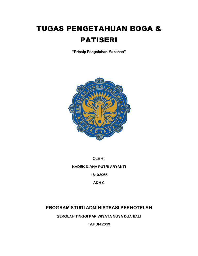 TUGAS PENGETAHUAN BOGA & PATISERI “Prinsip Pengolahan Makanan” OLEH : KADEK DIANA PUTRI ARYANTI 18102065 ADH C PROGRAM STUDI ADMINISTRASI PERHOTELAN SEKOLAH TINGGI PARIWISATA NUSA DUA BALI TAHUN 2019 A. Prinsip pengolahan makanan 1. Chilled cook pemasakan bahan baku dengan cara dipanaskan minimum suhu 70°C selama 2 menit kemudian dilanjutkan dengan penyimpanan dingin ≤3°C selama ≤150 menit dan dihangatkan/dipanaskan kembali ≥70°C sebelum dikonsumsi (Food Safety Authority of Ireland, 2006). Pemasakan pada suhu dan waktu tersebut bertujuan untuk memasak bahan baku yang masih mentah serta memastikan bahwa setiap mikroorganisme patogen yang mungkin masih ada menjadi mati. proses pemanasan yang cukup untuk membunuh bakteri patogen (Listeria monocytogenes) sebesar 6D (Fellows, 2000). Setelah pemasakan selesai, produk disimpan dalam wadah kontainer plastik dan didinginkan secara cepat hingga mencapai 3°C dalam jangka waktu 90 menit menggunakan blast chiller atau chiller freezer dan dan tetap disimpan antara suhu 0-3°C untuk mengontrol pertumbuhan mikroba. 2. Freeze cook Bagi banyak perusahaan katering, Cook-Freeze sistem menawarkan cara terbaik untuk memberikan makanan berkualitas tinggi dengan efisiensi maksimum. Karena dengan persiapan ini metode makanan tidak perlu disiapkan langsung sebelum mereka dikonsumsi, penggunaan optimal dapat dibuat dari kapasitas yang ada. 3. Convetional / Traditional Cook 4. Bath cook Konsep batch memasak cukup sederhana. Pada dasarnya, kita hanya memasak beberapa batch dari bahan-bahan yang berbeda dan menyimpannya dalam kulkas untuk membuat menu sepanjang minggu. Batch cooking atau sering disebut meal preparing. Mempunyai pengertiannya yang sama saja, menyiapkan makanan untuk periode waktu tertentu dengan mengolahnya di awal sekaligus. 5. Sous vide B. Pengertian bahan makanan Menurut kamus besar bahasa indonesia Pengertian Bahan makanan adalah bahan yg dapat dijadikan makanan, seperti beras, terigu, jagung, dan ubi, daging dan lain-lain. Secara garis besar bahan makanan dapat dibedakan menjadi dua berdasarkan dari asalnya yaitu Bahan makanan Hewani dan Bahan makanan Nabati. Bahan makanan adalah bahan yang memungkinkan manusia tumbuh dan mampu memelihara tubuhnya serta berkembang biak. Manusia memerlukan bahan makanan untuk menunjang kelangsungan kehidupannya, misalnya untuk membangun sel-sel tubuh dan menjaga agar tubuh sehat dan berfungsi sebagaimana mestinya (Winarno, 1993). Menurut Peraturan Pemerintah RI nomor 28 tahun 2004 adalah segala sesuatu yang berasal dari sumber hayati dan air, baik yang diolah maupun yang tidak diolah, yang diperuntukkan sebagai makanan atau minuman bagi konsumsi manusia, termasuk bahan tambahan pangan, bahan baku pangan, dan bahan lain yang digunakan dalam proses penyiapan, pengolahan, dan atau pembuatan makanan atau minuman. C. Penggolongan Bahan Makanan Perishable foods adalah mereka cenderung merusak,membusuk,atau menjadi tidak aman untuk dikomsumsi jika tidak di simpan dalam lemari es pada 40 °F (4,4 °C) atau dibawah atau beku pada 0 °F (-17,8 °C) atau dibawah. Perishable foods diartikan sebagai pangan yang dijual atau didistribusikan dalam bentuk yang mudah mengalami kerusakan, kebusukan atau berjamur dalam jangka waktu yang relatif singkat. Termasuk di dalamnya adalah perishable foods yang potensial berbahaya dan yang tidak berbahaya bagi kesehatan manusia. Sementara itu, ada juga yang mengelompokkan perishable foods yang tidak berbahaya bagi kesehatan sebagai semi perishable foods, contohnya adalah olahan serealia (semolina, cracked wheat, rice flakes), produk kacang-kacangan, umbi-umbian (kentang, ubi jalar), lemak dan minyak dan sebagainya. bahan makanan hewani : bahan makanan yang dari hewan atau olahan bahan yang bahan dasarnya adalah hewan. Bahan pangan ini memiliki karasteristik yang berbeda dan pengolahan yang berbeda , sehingga memerlukan penanganan yang berbeda pula. contohnya : susu , telur , daging , ikan , cumi-cumi , kerang , udang , telur bebek . Bahan makanan hewani bersifat lunak dan lembek sehingga mudah terpenetrasin oleh faktor tekanan dari luar. mempunyai sifat khas, tidak mempunyai daya simpan lama kecuali telur, sifatnya lunak, masing-masing jenis punya sifat spesifik, dan umumnya merupakan sumber protein dan lemak. Daging Menurut “Food And Drug Administration” , daging merupakan bagian tubuh yang berasal dari ternak sapi , babi , atau domba yang dalam keadaan sehat dan cukup umur untuk dipotong. Protein daging lebih mudah dicerna ketimbang yang berasal dari nabati. 1. Hewan penghasil daging : 1. Sapi : a. Sapi perah jantan b. Sapi potong : ras Shorthom , Hereford , Brahman , Ongola , sapi Madura , sapi bali. 2. Domba : biasanya untuk produksi bulu dan atau produksi daging Rambrillet , East Frisian , Sheep , Karakul , Romnev , Shoutdown. 3. Babi : Tipe lard : Hampshire , Berkshire , Bacon : Tomworth Yorkshire , lemak rendah : polland China dan babi asli Indonesia. 4. Kambing : Angora , Anglo Saanen dan French – Alpine 5. Kerbau 6. Ikan bahan makanan nabati : bahan-bahan makanan yang berasal dari tanaman (bisa berupa akar, batang, dahan, daun, bunga, buah atau beberapa bagian dari tanaman bahkan keseluruhannya) atau bahan makanan yang diolah dari bahan dasar dari tanaman. Sumber nabati ini dapat dibedakan lagi berdasarkan sifat fisiknya, sifat kimiawi, dan biologisnya. Contohnya : buah alpukat , gandum , kacang kedelai , kacang almond , kangkung , jagung , kacang hijau , bayam , kacang kenari , jambu. Kentang Satu buah kentang ukuran sedang mengandung 3 gram protein, potassium, vitamin C dan serat. Mengolah kentang untuk dimakan pun mudah, bisa direbus, dip anggang, hingga digoreng. 2. Brokoli Ada alasan khusus mengapa brokoli disebut sebagai sayuran super. Satu porsi brokoli kaya akan protein nabati dan serat, dua nutrisi penting untuk menjaga kesehatan saluran cerna. 3. Kembang kol Kembang kol bisa jadi pilihan makanan saat diet. 100 Gram kembang kol mengandung 3 gram protein d