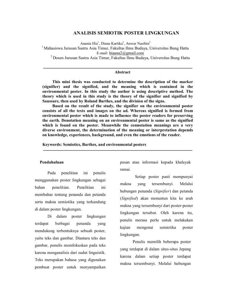 ANALISIS SEMIOTIK POSTER LINGKUNGAN Anania Hia1, Diana Kartika2, Anwar Nasihin2 1 Mahasiswa Jurusan Sastra Asia Timur, Fakultas Ilmu Budaya, Universitas Bung Hatta E-mail: [email protected] 2 Dosen Jurusan Sastra Asia Timur, Fakultas Ilmu Budaya, Universitas Bung Hatta Abstract This mini thesis was conducted to determine the description of the marker (signifier) and the signified, and the meaning which is contained in the environmental poster. In this study the author is using descriptive method. The theory which is used in this study is the theory of the signifier and signified by Saussure, then used by Roland Barthes, and the division of the signs. Based on the result of the study, the signifier on the environmental poster consists of all the texts and images on the ad. Whereas signified is formed from environmental poster which is made to influence the poster readers for preserving the earth. Denotation meaning on an environmental poster is same as the signified which is found on the poster. Meanwhile the connotation meanings are a very diverse environment, the determination of the meaning or interpretation depends on knowledge, experiences, background, and even the emotions of the reader. Keywords: Semiotics, Barthes, and environmental posters Pendahuluan Pada pesan atau informasi kepada khalayak penelitian ini penulis menggunakan poster lingkungan sebagai bahan penelitian. Penelitian ini membahas tentang penanda dan petanda serta makna semiotika yang terkandung di dalam poster lingkungan. Di terdapat dalam berbagai poster lingkungan penanda yang mendukung terbentuknya sebuah poster, yaitu teks dan gambar. Diantara teks dan gambar, penulis memfokuskan pada teks karena menganalisis dari sudut linguistik. Teks merupakan bahasa yang digunakan pembuat poster untuk menyampaikan ramai. Setiap poster pasti mempunyai makna yang tersembunyi. Melalui hubungan penanda (Signifier) dan petanda (Signified) akan menuntun kita ke arah makna yang tersembunyi dari poster-poster lingkungan tersebut. Oleh karena itu, penulis merasa perlu untuk melakukan kajian mengenai semiotika poster lingkungan. Penulis memilih beberapa poster yang terdapat di dalam situs-situs Jepang karena dalam setiap poster terdapat makna tersembunyi. Melalui hubungan penanda (signifier) dan petanda menyadarkan masyarakat tentang (signifiant) akan menuntun kita untuk lingkungan yang berhubungan dengan dapat memahami makna yang ingin kepentingan bersama. Pembuat poster disampaikan oleh pembuat poster. Di ingin dalam poster Jepang terdapat verbal masyarakat melalui poster karena sebagai (teks) dan visual (gambar) yang saling pelaku yang mengolah sumber daya alam, berhubungan sehingga mudah membaca tanpa disadari perbuatan manusia tersebut dan menjelaskan makna dan pesan yang mengakibatkan kerusakan lingkungan. ingin disampaikan oleh pembuat poster. menyampaikan pesan kepada Hal-hal yang harus diperhatikan Untuk mengetahui makna yang terdapat untuk di (http://zona-prasko.blogspot.com) adalah dalam poster lingkungan akan digunakan kajian semiotika. Menurut sebuah poster yang baik a) tulisan harus jelas, Zoest (1993:1), b) kombinasi tulisan dan gambar tidak semiotika adalah cabang ilmu yang berlebihan, berurusan dengan pengkajian tanda dan c) tidak egois, artinya sebaiknya kita segala sesuatu yang berhubungan dengan memposisikan tanda, seperti sistem tanda dan proses poster, yang berlaku bagi pengguna tanda. Tanda d) kombinasi warna yang tepat. merupakan suatu alat komunikasi yang digunakan oleh sebagai pembaca Untuk menganalisis makna yang dengan terdapat di dalam poster lingkungan, masyarakat lain untuk saling memahami penulis menggunakan teori semiotika suatu hal. Tanda terdiri atas 2 bagian, oleh Roland Barthes. Dia adalah penerus yaitu penanda (signifier) dan petanda aliran Ferdinand de Saussure. Dalam (signification) . Penanda adalah aspek teorinya, ia tetap menggunakan istilah material dari bahasa, yaitu apa yang penanda didengar, dibaca. (signifie). Penanda yaitu gejala yang Sedangkan petanda adalah gambaran tercerap secara mental oleh manusia mental, pikiran, atau konsep (Saussure sebagai “citra akustik”. Penanda dilihat http://sherlyfirismapraselin.student.esaun sebagai bentuk atau wujud fisik dapat ggul.ac.id) dikenal melalui wujud karya arsitektur. yang Poster masyarakat diri ditulis atau lingkungan (signifiant) dan petanda biasanya Sedangkan petanda adalah makna atau dipasang di tempat-tempat umum agar konsep yang ditangkap dari penanda. mudah terlihat atau terbaca oleh orang Kemudian Roland Barthes mengubah banyak. Tujuan poster lingkungan untuk istilah signifiant menjadi ekspresi dan pengungkapan serta signifie diubahnya Pada tas tersebut terdapat teks “エコ ”. menjadi isi atau konsep. Pemaknaan Berarti tas tersebut adalah tas yang ramah tanda oleh Roland Barthes ada dua tahap, lingkungan dan tas yang bisa digunakan yaitu tahap pertama (makna denotasi) dan berkali-kali. Selain tas “エコ” , terdapat tahap kedua (makna konotasi). Makna juga kantong plastik. Pada kantong denotasi merupakan pemaknaan dasar plastik tersebut terdapat tanda silang (sistem primer) yang terjadi pada saat merah dan gambar wajah mengeluarkan tanda kalinya. air mata. Artinya, tas berbahan plastik (sistem tersebut sangat tidak ramah lingkungan. pengembangan Makna secara keseluruhan adalah semua dicerap Sedangkan sekunder) makna makna pertama konotasi merupakan dari makna konotasi (Hoed,2004:52-53) orang diajak menjaga bumi dengan cara mengurangi penggunaan tas atau kantong Contoh wujud tanda yang terdapat berbahan plastik yang merusak dalam poster lingkungan adalah di dalam lingkungan. Ketika pergi belanja ke pasar poster lingkungan terdapat teks dan ataupun gambar. Misalnya, teks “マイバッグも membawa tas atau kantong dari rumah. っていますか?” yang artinya ‘apakah Tujuannya anda membawa my bag/tas saya?’. Di lingkungan. dalam kalimat tersebut ke supermarket, adalah sebaiknya untuk menjaga terdapat penggalan kata 