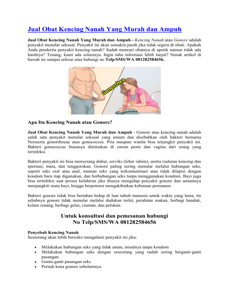 Jual Obat Kencing Nanah Yang Murah dan Ampuh Jual Obat Kencing Nanah Yang Murah dan Ampuh - Kencing Nanah atau Gonore adalah penyakit menular seksual. Penyakit ini akan semakin parah jika tidak segera di obati. Apakah Anda penderita penyakit kencing nanah? Sudah mencari obatnya di apotik namun tidak ada hasilnya? Tenang, kami ada solusinya. Ingin tahu informasi lebih lanjut? Simak artikel di bawah ini sampai selesai atau hubungi no Telp/SMS/WA 081282584656. Apa Itu Kencing Nanah atau Gonore? Jual Obat Kencing Nanah Yang Murah dan Ampuh - Gonore atau kencing nanah adalah salah satu penyakit menular seksual yang umum dan disebabkan oleh bakteri bernama Neisseria gonorrhoeae atau gonococcus. Pria maupun wanita bisa terjangkit penyakit ini. Bakteri gonococcus biasanya ditemukan di cairan penis dan vagina dari orang yang terinfeksi. Bakteri penyakit ini bisa menyerang dubur, serviks (leher rahim), uretra (saluran kencing dan sperma), mata, dan tenggorokan. Gonore paling sering menular melalui hubungan seks, seperti seks oral atau anal, mainan seks yang terkontaminasi atau tidak dilapisi dengan kondom baru tiap digunakan, dan berhubungan seks tanpa menggunakan kondom. Bayi juga bisa terinfeksi saat proses kelahiran jika ibunya mengidap penyakit gonore dan umumnya menjangkiti mata bayi, hingga berpotensi mengakibatkan kebutaan permanen. Bakteri gonore tidak bisa bertahan hidup di luar tubuh manusia untuk waktu yang lama, itu sebabnya gonore tidak menular melalui dudukan toilet, peralatan makan, berbagi handuk, kolam renang, berbagi gelas, ciuman, dan pelukan. Untuk konsultasi dan pemesanan hubungi No Telp/SMS/WA 081282584656 Penyebab Kencing Nanah Seseorang akan lebih berisiko mengalami penyakit ini jika: Melakukan hubungan seks yang tidak aman, misalnya tanpa kondom Melakukan hubungan seks dengan seseorang yang sudah sering berganti-ganti pasangan Gonta-ganti pasangan seks Pernah kena gonore sebelumnya Pernah mengalami penyakit kelamin lain sebelumnya Tanda-tanda & gejala Kondisi ini biasanya tidak akan langsung menunjukkan gejala langsung saat pertama kali terinfeksi. Gejala biasanya muncul sekitar 10-20 hari setelah infeksi. Ketika gejala mulai muncul, Anda lebih baik mendapatkan pengobatan sesegera mungkin. Jika tidak diobati, gonore dapat menyebabkan ruam, demam, dan akhirnya nyeri sendi. Sayangnya, tidak semua orang menyadari gejala yang muncul dari penyakit menular seksual ini. Bahkan ada yang mengidap kondisi ini, etapi tanpa menunjukkan gejala-gejala yang ada dan biasanya disebut nonsymptomatic carrier alias pembawa non gejala. Terdapat dua gejala berbeda pada perempuan dan laki-laki. Gejalanya pada laki-laki Sebagian besar laki-laki mungkin tidak akan menyadari gejala bahwa ia telah mengidap gonore, karena beberapa laki-laki memang tidak mendapatkan gejalanya. Gejala yang paling umum dan paling pertama dikenali adalah rasa panas atau terbakar ketika buang air kecil. Setelah itu akan diikuti oleh gejala lainnya berupa: Frekuensi buang air kecil yang cukup sering Keluarnya nanah dari penis (tetesan cairan) berwarna putih, kuning, krem atau kehijau-hijauan) Bengkak dan kemerahan pada bukaan atau kulup penis Bengkak atau nyeri pada testis Sakit tenggorokan yang datang terus-menerus Ketika telah diobati, infeksi ini mungkin masih akan bertahan di tubuh selama beberapa hari. Pada kasus yang jarang ditemui, gonore dapat menyebabkan kerusakan pada tubuh, khususnya urethra dan testis. Rasa nyeri juga dapat dirasakan hingga ke rektum. Gejalanya pada perempuan Beberapa perempuan sulit mengidentifikasi gejala gonore ini, sebab gejala yang muncul ada kemiripan dengan infeksi lain. Gejala penyakit seksual menular pada perempuan ini awalnya tidak terbentuk dengan jelas, seperti infeksi jamur vagina pada umumnya, sehingga beberapa perempuan salah menebak infeksi yang diidapnya. Berikut ini adalah beberapa gejala yang muncul pada perempuan: Keluar cairan dari vagina (berair, menyerupai krim, sedikit kehijauan) Ketika buang air kecil, adanya sensasi nyeri dan rasa panas Frekuensi buang air kecil yang cukup sering Munculnya bercak darah atau perdarahan saat tidak sedang menstruasi Rasa nyeri ketika melakukan hubungan seksual Rasa nyeri juga dirasakan pada perut bagian bawah atau nyeri panggul Bengkak pada vulva Rasa terbakar atau panas di tenggorokan (ketika sudah melakukan oral seks) Demam Faktor-faktor risiko Ada banyak faktor risiko untuk gonore, seperti: Anda aktif secara seksual Anda memiliki pasangan seks yang baru Anda memiliki banyak pasangan seks Anda pernah didiagnosis gonore sebelumnya Anda memiliki infeksi menular seksual lainnya Bagaimana cara mencegah Penyakit Kencing nanah? Untuk mengurangi risiko infeksi kencing nanah bisa dilakukan dengan berbagai cara, antara lain : Gunakan kondom dengan benar setiap kali Anda berhubungan seks. Setia terhadap pasangan, jangan berganti-ganti partner seks. Membatasi kontak seksual hanya dengan satu pasangan yang benar-benar steril. Pertanyaan yang sering terpikirkan di benak Anda : Jika Saya terlanjur kena gonore bagaimana cara mengobatinya? Bagaimana cara mengobati kencing nanah dengan cepat dan tuntas? Bagaimana berobat yang mudah tanpa perlu malu untuk ke dokter? Jawabannya: semua bisa, asal Anda memilih produk yang tepat, yaitu Gang Jie Gho Siah De Nature. Harga Rp. 295.000 Pemesanan obat hubungi tlp/sms/whatsapp : 081282584656 Manfaat Obat Kencing Nanah De Nature Banyak sekali khasiat yang didapat dari obat ini untuk mengobati sipilis kencing nanah gonore, antara lain : Gang Jie dan Gho Siah terdapat kandungan alami antibiotik dan antiviral, yang bermanfaat membasmi secara cepat dan tuntas bakteri Neisseria gonorrhoeae tanpa efek samping yang membahayakan tubuh. Produk yang mujarab karena berbahan dasar dengan kualitas tinggi yang kami kembangkan sendiri sehingga terjaga kualitasnya. Gang Jie dan Gho Siah sangat berguna untuk imunitas, hal ini sangat penting pagi penderita penyakit kelamin, sehingga proses penyembuhan menjadi lebih cepat dan juga un