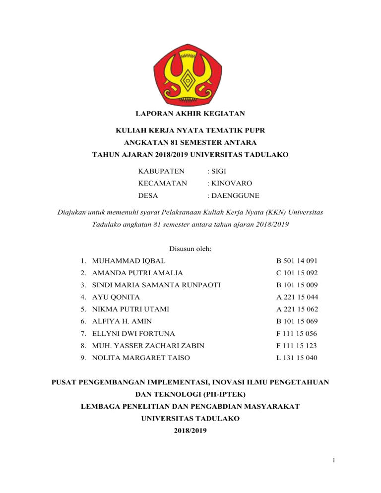 LAPORAN AKHIR KEGIATAN KULIAH KERJA NYATA TEMATIK PUPR ANGKATAN 81 SEMESTER ANTARA TAHUN AJARAN 2018/2019 UNIVERSITAS TADULAKO KABUPATEN : SIGI KECAMATAN : KINOVARO DESA : DAENGGUNE Diajukan untuk memenuhi syarat Pelaksanaan Kuliah Kerja Nyata (KKN) Universitas Tadulako angkatan 81 semester antara tahun ajaran 2018/2019 Disusun oleh: 1. MUHAMMAD IQBAL B 501 14 091 2. AMANDA PUTRI AMALIA C 101 15 092 3. SINDI MARIA SAMANTA RUNPAOTI B 101 15 009 4. AYU QONITA A 221 15 044 5. NIKMA PUTRI UTAMI A 221 15 062 6. ALFIYA H. AMIN B 101 15 069 7. ELLYNI DWI FORTUNA F 111 15 056 8. MUH. YASSER ZACHARI ZABIN F 111 15 123 9. NOLITA MARGARET TAISO L 131 15 040 PUSAT PENGEMBANGAN IMPLEMENTASI, INOVASI ILMU PENGETAHUAN DAN TEKNOLOGI (PII-IPTEK) LEMBAGA PENELITIAN DAN PENGABDIAN MASYARAKAT UNIVERSITAS TADULAKO 2018/2019 i BAB I PENDAHULUAN 1.1 Latar Belakang Kuliah Kerja Nyata (KKN) merupakan salah satu bagian dari kegiatan akademik yang bersifat sosial, dimana mahasiswa akan terjun langsung ke lingkungan masyarakat dan akan menerapkan ilmu yang sudah diperoleh selama perkuliahan. Kuliah Kerja Nyata (KKN) pada tahun ini sudah mencapai angkatan yang ke-81. Namun untuk posko KKN Desa Daenggune berkonsentrasi di bagian SPAM (Sistem Penyediaan Air Minum). Keadaan SPAM di Desa Daenggune terbilang cukup Baik, dikarenakan adanya pemeliharaan rutin terhadap mata air, pipa distribusi, dan dibentuknya badan pengurus yang menangani kelancaran distribusi air sampai kerumah – rumah warga Desa Daenggune. Yang masih menjadi masalah adalah penggunaan sambungan pipa yang menggunakan sambungan karet, bak air yang sudah tidak berfungsi karena berkarat atau bak yang bocor, dan iuran perawatan SPAM yang belum berjalan. 1.2 Tujuan Kuliah Kerja Nyata (KKN) Adapun Tujuan dari Kuliah Kerja Nyata yaitu sebagai berikut : 1. Meningkatkan empati dan kepedulian mahasiswa terhadap masyarakat melalui kegiatan-kegiatan terprogram. 2. Memberikan peluang bagi mahasiswa untuk dapat menerapkan secara komprehensif ilmu yang telah dipelajari dalam kehidupan masyarakat. 3. Mengembangkan kemampuan dan keunggulan mahasiswa dikalangan masyarakat, serta mengembangkan personalitas mahasiswa, memperkuat cara berpikir dan kemampuan memecahkan masalah. 4. Memberikan pengalaman lapangan bagi mahasiswa dalam kehidupan sosial dan komunikasi sosial, serta membangun citra diri dan lembaga dikalangan masyarakat. 1.3 Manfaat Kuliah Kerja Nyata (KKN) Secara umum Manfaat dari Kuliah Kerja Nyata (KKN) sebagai berikut : 1 1. Bagi Mahasiswa a. Mahasiswa dapat memperoleh pengalaman belajar yang berharga dan berbeda, seperti terlibat langsung dalam kegiatan masyarakat. Sehingga mahasiswa dapat menemukan dan memecahkan permasalahan yang terjadi. b. Tumbuhnya rasa kepedulian sosial terhadap masyarakat. c. Melatih mahasiswa untuk menjadi inspirator dalam menghadapi persoalan yang ada dimasyarakat. d. Mendalami penghayatan mahasiswa terhadap manfaat ilmu pengetahuan yang dipelajari bagi pelaksanaan pembangunan. 2. Bagi Masyarakat a. Memperoleh masukan-masukan baru terhadap permasalahan yang dihadapi, sehingga nantinya dapat mengalami perubahan sosial ke arah yang lebih baik. b. Kehadiran mahasiswa sekiranya diharapkan mampu menyelesaikan konflik secara pragmatis. 3. Bagi Perguruan Tinggi a. Melalui mahasiswa/dosen pembimbing, diperoleh umpan balik sebagai pengayaan materi kuliah bagi suatu rancangan bentuk pengabdian kepada masyarakat. b. Memperoleh hasil kegiatan mahasiswa, dapat menelaah dan merumuskan keadaan/kondisi masyarakat yang berguna bagi pengembangan ilmu pengetahuan. c. Meningkatkan, memperluas dan mempererat kerja sama dengan instansi terkait atau departemen lain melalui kerjasama mahasiswa yang melaksanakan. 2 1.4 Sistematika Laporan 1. BAB I Pendahuluan Bab ini berisikan tentang latar belakang dilaksanakannya kuliah kerja nyata (KKN), tujuan kuliah kerja nyata (KKN), dan manfaat kuliah kerja nyata terhadap masyarakat, mahasiswa dan perguruan tinggi. 2. BAB II Program Kerja Pada bab ini memberi kejelasan mengenai sejarah singkat Desa Daenggune, letak geografis Desa Daenggune (sebelah utara, sebelah selatan, sebelah barat, dan sebelah timur), topografi Desa Daenggune, demografi Desa Daenggune, potensi Desa Daenggune, sosial budaya Desa Daenggune, kebersihan lingkungan dan kesehatan Desa Daenggune, sarana dan prasarana, yang merupakan data umum yang diperlukan dan merupakan pendukung dari data SPAM. Pada bab ini juga membahas program 20 persen yang laksanakan untuk mendukung program 80 persen. 3. BAB III Rencana Kerja Masyarakat Pada bab rencana kerja masyarakat pada laporan ini merupakan solusisolusi yang direncanakan oleh Mahasiswa KKN berdasarkan hasil survei mengenai air bersih. 4.BAB V Penutup Pada bab penutup ini berisikan kesimpulan permasalahan yang ada di Desa Daenggune, serta saran yang diberikan oleh Mahasiswa KKN kepada pemerintah dan masyarakat. 3 BAB II PROGRAM KERJA 2.1 Program 80% Program Pokok 80% adalah tugas utama yang dikerjakan dalam sebuah rencana kerja agar suatu kelompok dapat mengetahui apa saja yang menjadi permasalahan dilapangan. Melalui Program 80% dapat membantu mengindetifikasi permasalahan yang paling berpotensi agar di jadikan acuan untuk membuat suatu laporan akhir. Dan sebagai acuan KKN selanjutnya. 2.1.1 Pengumpulan Data Umum A. Profil Desa Daenggune Sebelum desa Daenggue berawal dari sejumlah msyarakat yang bermukim di wilayah pegunungan yakni di Kampung Tua Daenggune, Ova, Vaenampu serta sebagian juga ada yang bermukim di Bolu dan Limba, desa Denggune juga adalah salah satu desa yang tertua di lereng pegunugan Kamalisi. Pada zaman kerajaan,di desa Daenggune tidak mengenai istilah raja (Madika) ,tapi hanya mengenai istilah “Ntina dan Bangunasa” maksudnya hanya mengangkat seseorang untuk menjadi pemimpin (Madika) sedangkan Bangunasa artinya orang tua yang pertama membuka saluran air untuk mengairi kebun dan sawah yang ada di desa Daenggune. Masyarakat Daenggune meyakini bahwa kata “Daenggune” itu adalah di sesua