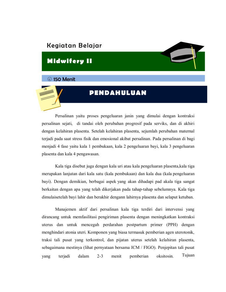 Kegiatan Belajar Midwifery II 150 Menit PENDAH ULUAN Persalinan yaitu proses pengeluaran janin yang dimulai dengan kontraksi persalinan sejati, di tandai oleh perubahan progresif pada serviks, dan di akhiri dengan kelahiran plasenta. Setelah kelahiran plasenta, sejumlah perubahan maternal terjadi pada saat stress fisik dan emosional akibat persalinan. Pada persalinan di bagi menjadi 4 fase yaitu kala 1 pembukaan, kala 2 pengeluaran bayi, kala 3 pengeluaran plasenta dan kala 4 pengawasan. Kala tiga disebut juga dengan kala uri atau kala pengeluaran plasenta,kala tiga merupakan lanjutan dari kala satu (kala pembukaan) dan kala dua (kala pengeluaran bayi). Dengan demikian, berbagai aspek yang akan dihadapi pad akala tiga sangat berkaitan dengan apa yang telah dikerjakan pada tahap-tahap sebelumnya. Kala tiga dimulaisetelah bayi lahir dan berakhir dengann lahirnya plasenta dan selaput ketuban. Manajemen aktif dari persalinan kala tiga terdiri dari intervensi yang dirancang untuk memfasilitasi pengiriman plasenta dengan meningkatkan kontraksi uterus dan untuk mencegah perdarahan postpartum primer (PPH) dengan menghindari atonia uteri. Komponen yang biasa termasuk pemberian agen uterotonik, traksi tali pusat yang terkontrol, dan pijatan uterus setelah kelahiran plasenta, sebagaimana mestinya (lihat pernyataan bersama ICM / FIGO). Penjepitan tali pusat yang terjadi dalam 2-3 menit pemberian oksitosin. Tujuan manajemen aktif kala tiga adalah untuk menghasilkan kontraksi uterus yang lebih efektif sehingga dapat mempersingkat waktu dan mencegah pendarahan. Sebagian besar kasus kesakitan dan kematian ibu di Indonesia disebabkan oleh perdarahan pasca persalinan dimana sebagian besar disebabkan oleh atonia uteris dan retensio plasenta yang sebenarnya dapat dicegah dengan melakukan manajemen aktif kala tiga. Setelah plasenta lahir, dinding uterus akan berkontraksi dan menekan semua pembuluh darah sehingga melekatnya plasenta. Sebelum akan menghentikan perdarahan dari tempat uterus berkontraksi, dapat terjadi kehilangan darah350-560 cc/menit dari tempat pelekatan plasenta. TUJUAN MATA KULIAH A. Tujuan Umum Untuk mengetahui manfaat Fisiologi Kala III B. Tujuan Khusus a. b. c. d. e. f. g. h. i. j. k. l. m. n. o. p. q. r. s. t. Untuk mengetahui pengertian persalinan Untuk mengetahui tahapan persalinan Untuk mengetahui pengertian Fisiologi Pelepasan Plasenta Untuk mengetahui Pembagian tahap kala III Untuk mengetahui mekanisme pelepasan plasenta Untuk mengetagui tanda-tanda pelepasan plasenta Untuk mengetagui perubahan fisiologi kala III Untuk mengetahui pengawasan perdarahan Untuk mengetahui Pemberian suntikan oksitoxin Untuk mengetahui peregangan tali pusat terkendali Untuk mengetahui Rangsangan Taktil (Masase) Fundus Uteri Untuk mengetahui Memeriksa plasenta, selaput ketuban dan tali pusat Untuk mengetahui pemantauan kontraksi Untuk mengetahui robekan jalan lahir dan luka perineum Untuk mengetahui hygiene Untuk mengetahui Tanda Vital Untuk mengetahui Melakukan Inisisasi Menyusui Dini Untuk mengetahui Perawatan Kala III Untuk mengetahui Menyusui Bayi Untuk mengetahui tentang kontraksi uterus URAIAN MATERI KONSEP DAN ASUHAN NATURAL BASIC THERAPY PERSALINAN A. Kompetensi Dasar dan Indikator NO Kompetensi Dasar 1. Persalinan Indikator 1. Menjelaskan pengertian persalinan 2. Menjelaksan tahapan persalinan 2. Kala III a. Menjelaskan pengertian kala III b. Menjelaskan Fisiologi Pelepasan Plasenta c. Menjelaskan Pembagian tahap kala III d. Menjelaskan mekanisme pelepasan plasennta e. Menjelaskan tanda-tanda pelepasan plasenta f. Menjelaskan perubahan fisiologi kala III g. Menjelaskan pengawasan perdarahan 3. Manajemen Aktif Kala III a. Menjelaskan Pemberian suntikan oksitoxin b. Menjelaskan peregangan tali pusat terkendali c. Menjelaskan Rangsangan Taktil (Masase) Fundus Uteri d. Menjelaskan Memeriksa plasenta, selaput ketuban dan tali pusat 4 Pemantauan keadaan ibu Kala III a. Menjelaskan pemantauan kontraksi b. Menjelaskan robekan jalan lahir dan luka perineum c. Menjelaskan hygiene d. Menjelaskan Tanda Vital 5 Kebutuhan Ibu Kala III a. Menjelaskan Melakukan Inisisasi Menyusui Dini b. Menjelaskan Perawatan Kala III c. Menjelaskan Menyusui Bayi d. Menjelaskan uterus tentang kontraksi A. MATERI PERSALINAN 1. Pengertian Persalinan Persalinan adalah proses pengeluaran hasil konsepsi (janin dan plasenta) yang telah cukup bulan atau dapat hidup di luar kandungan melalui jalan lahir atau melalui jalan lain, dengan bantuan atau tanpa bantuan (kekutan sendiri) (Manuaba, 2010: 164). Persalinan adalah suatu proses pengeluaran hasil konsepsi (janin + uri) yang dapat hidup ke dunia luar, dari rahim melalui jalan lahir atau jalan lain (Mochtar, 2011: 69). Persalinan adalah proses dimana bayi, plasenta dan selaput ketuban keluar dari uterus ibu. Persalinan dianggap normal jika prosesnya terjadi pada usia kehamilan cukup bulan (setelah 37 minggu) tanpa disertai adanya penyulit. persalinan dimulai (inpartu)sejak uterus berkontraksi dan menyebabkan perubahan pada serviks (membuka dan menipis) dan berakhir dengan lahirnya plasenta secara lengkap) (Setianingrum Erna,2013 :17).3.9 2. Tahapan persalinan Dalam kelangsungan persalinan, dapat dibagi menjadi 4 kala diantaranya: 1. Kala I (kala pembukaan) Kala I persalinan dimulai sejak terjadinya kontraksi uterus yang teratur dan meningkat (frekuensi dan kekuatannya) hinga serviks membuka lengkap (10 cm). kala satu persalinan terdiri dari atas dua fase, yaitu fase laten yaitu pembukaan serviks hingga 4 cm, dan fase aktif yaitu pembukaan serviks 4 cm sampai dengan 10 cm. 2. Kala II (kala pengeluaran) Kala II persalinan dimulai ketika pembukaan serviks sudah lengkap (10 cm) dan berakhir dengan lahirnya bayi. 3. Kala III (kala uri) Kala III persalinan dimulai setelah lahirnya bayi dan berakhir dengan lahirnya plasenta dan selaput ketuban. 4. Kala IV (kala pengawasan) Kala IV dimulai setelah lahirnya plasenta dan berakhir dua jam setelah melahirkan (Gulardi W, 2008:95) 3.9 B. MATERI KALA I