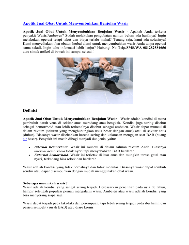 Apotik Jual Obat Untuk Menyembuhkan Benjolan Wasir Apotik Jual Obat Untuk Menyembuhkan Benjolan Wasir - Apakah Anda terkena penyakit Wasir/Ambeyen? Sudah melakukan pengobatan namun belum ada hasilnya? Ingin melakukan operasi tetapi takut dan biaya terlalu mahal? Tenang saja, kami ada solusinya! Kami menyediakan obat obatan herbal alami untuk menyembuhkan wasir Anda tanpa operasi sama sekali. Ingin tahu informasi lebih lanjut? Hubungi No Telp/SMS/WA 081282584656 atau simak artikel di bawah ini sampai selesai! Definisi Apotik Jual Obat Untuk Menyembuhkan Benjolan Wasir - Wasir adalah kondisi di mana pembuluh darah vena di sekitar anus meradang atau bengkak. Kondisi juga sering disebut sebagai hemorrhoid atau lebih terkenalnya disebut sebagai ambeien. Wasir dapat muncul di dalam rektum (saluran yang menghubungkan usus besar dengan anus) atau di sekitar anus (dubur). Biasanya wasir disebabkan karena sering dan kelamaan mengejan saat BAB (buang air besar). Penyakit ini masih dibagi menjadi dua jenis, yaitu: Internal hemorrhoid. Wasir ini muncul di dalam saluran rektum Anda. Biasanya internal hemorrhoid tidak nyeri tapi menyebabkan BAB berdarah. External hemorrhoid. Wasir ini terletak di luar anus dan mungkin terasa gatal atau nyeri, terkadang bisa robek dan berdarah. Wasir adalah kondisi yang tidak berbahaya dan tidak menular. Biasanya wasir dapat sembuh sendiri atau dapat disembuhkan dengan mudah menggunakan obat wasir. Seberapa umumkah wasir? Wasir adalah kondisi yang sangat sering terjadi. Berdasarkan penelitian pada usia 50 tahun, hampir setengah populasi pernah mengalami wasir. Ambeien atau wasir adalah kondisi yang bisa menyerang siapa saja. Wasir dapat terjadi pada laki-laki dan perempuan, tapi lebih sering terjadi pada ibu hamil dan pasien sembelit (susah BAB) atau diare kronis. Apa saja tanda-tanda dan gejala Ambeien atau wasir adalah kondisi yang memiliki beberapa gejala berikut, yakni: wasir? BAB berdarah berwarna merah terang dan tidak nyeri Gatal dan iritasi pada area rektum Nyeri dan rasa tidak nyaman Bengkak di sekitar anus Benjolan yang sensitif atau nyeri di dekat anus Kondisi ambeien yang yang lebih sering menyebabkan rasa tidak nyaman dan nyeri yaitu external hemorrhoid. Internal hemorrhoid biasanya tidak menyebabkan rasa nyeri. Kemungkinan ada tanda-tanda dan gejala yang tidak disebutkan di atas. Bila Anda memiliki kekhawatiran akan sebuah gejala tertentu, konsultasikanlah dengan dokter Anda. Penyebab Penyebab wasir yaitu pembengkakan pembuluh darah vena. Pembengkakan bisa terjadi akibat meningkatnya tekanan di rektum bagian bawah. Faktor yang meningkatkan tekanan tersebut yaitu: Mengejan saat BAB Duduk terlalu lama Diare atau sembelit kronis Berat badan berlebih atau obesitas Hamil Kurang asupan makanan berserat Faktor-faktor risiko Wasir disebabkan oleh bengkaknya pembuluh darah vena akibat peningkatan tekanan di rektum bagian bawah. Faktor-faktor yang bisa menjadi penyebab wasir antara lain: 1. Sembelit kronis. Feses yang mengeras akibat sembelit membuat Anda harus mengeluarkan tenaga lebih banyak untuk mengejan. Tekanan ekstra tersebut akhirnya bisa memicu pembengkakan pembuluh darah di anus, menjadi penyebab wasir. 2. Kehamilan. Seiring usia kehamilan yang semakin membesar, rahim akan ikut berkembang mengikuti perkembangan janin. Tekanan rahim ini kemudian akan menekan pembuluh darah yang ada di usus besar hingga memicu munculnya benjolan di daerah anus. 3. Duduk terlalu lama. Kebiasaan duduk yang terlalu lama bisa menjadi penyebab wasir, sebab pembuluh darah di sekitar anus akan banyak terisi darah. Aliran darah yang konstan tersebut akhirnya akan menekan dinding pembuluh darah hingga semakin membesar. 4. Mengangkat benda berat. Berulang kali mengangkat benda yang berat bisa jadi penyebab wasir karena adanya penumpukan tekanan di bagian rektum yang akan memengaruhi aliran darah dan membuat pembuluh darah menjadi bengkak. 5. Usia. Kondisi tubuh yang semakin menua secara alami menyebabkan jaringan pembuluh darah di sekitar rektum dan anus semakin melemah dan meregang, sehingga rentan membengkak. Inilah yang akhirnya jadi penyebab wasir. Untuk Konsultasi dan Pemesanan Obat Hubungi No Telp/SMS/WA 081282584656 Siapa saja yang berisiko kena wasir? Ada banyak faktor risiko untuk wasir, yaitu: Memiliki pekerjaan yang mengharuskan Anda duduk atau berdiri dalam waktu yang lama. Mengalami diare atau sembelit kronis. Anda mengalami obesitas. Ibu hamil. Sering melakukan seks anal, yakni penetrasi lewat anus. Konsumsi makanan tinggi lemak dan rendah serat. Tingkatan Stadium Wasir Atau Sakit Ambeien Pada Ibu Hamil Wasir stadium 1 : Wasir Jenis ini Biasanya tidak Sampai prolaps. Rasanya Cuma kadang Kurang Nyaman Saat Buang Air Besar. Ambeien stadium 2 : bagian anus sudah bisa diraba ada benjolan, namun biasanya belum ada pendarahan. kadang ada rasa panas dan gatal Wasir stadium 3 : benjolan pada anus sudah besar dan susah masuk lagi harus dibantu dengan jari Ambeien stadium 4 : benjolan vena sudah besar sekali dan sering pendarahan, Obat ambeien alami Pertanyaan yang sering terpikirkan di benak Anda : Jika Saya terlanjur kena wasir bagaimana cara mengobatinya? Bagaimana cara mengobati wasir dengan cepat dan tuntas? Bagaimana berobat yang mudah tanpa perlu malu untuk ke dokter dan tanpa operasi? Jawabannya: semua bisa, asal Anda memilih produk yang tepat, yaitu Ambejoss dan Salep Salwa De Nature. Harga Rp 275.000 Anda ingin sembuh dari wasir? Segera hubungi tlp/sms/whatsapp : 081282584656 Sekedar informasi untuk kenyamanan Konsumen, bahwa Produk dari perusahaan kami ini sudah memiliki: Ijin Resmi Perusahaan dari Kementerian Kesehatan Ijin BPOM, yang artinya sudah lulus uji stabilitas Produk Sertifikat Halal MUI, sehingga halal bisa dipertanggungjawabkan Apoteker yang sudah berpengalaman Sudah melewati Proses Sortir Bahan Baku, Guna Menjaga Mutu Produk Proses Produksi Sesuai Alur CPOTB (Cara Pembuatan Obat Tradisional Yang Baik Dan Benar) Cara Pemesanan Pembayaran terlebih dulu via tr