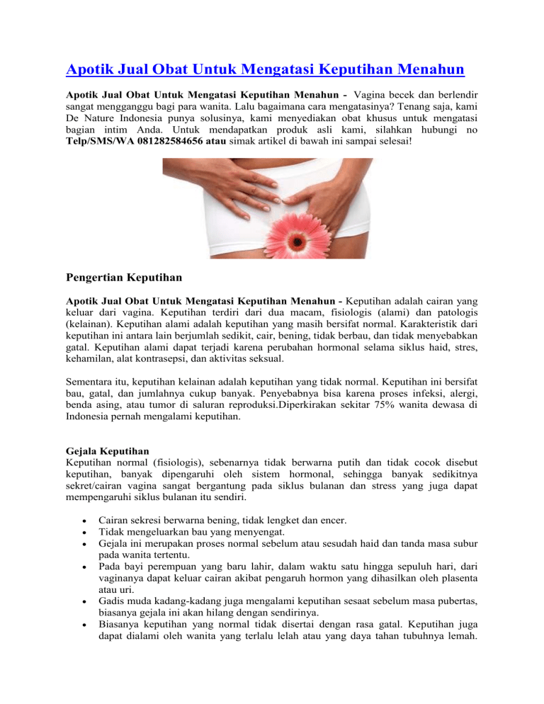 Apotik Jual Obat Untuk Mengatasi Keputihan Menahun Apotik Jual Obat Untuk Mengatasi Keputihan Menahun - Vagina becek dan berlendir sangat mengganggu bagi para wanita. Lalu bagaimana cara mengatasinya? Tenang saja, kami De Nature Indonesia punya solusinya, kami menyediakan obat khusus untuk mengatasi bagian intim Anda. Untuk mendapatkan produk asli kami, silahkan hubungi no Telp/SMS/WA 081282584656 atau simak artikel di bawah ini sampai selesai! Pengertian Keputihan Apotik Jual Obat Untuk Mengatasi Keputihan Menahun - Keputihan adalah cairan yang keluar dari vagina. Keputihan terdiri dari dua macam, fisiologis (alami) dan patologis (kelainan). Keputihan alami adalah keputihan yang masih bersifat normal. Karakteristik dari keputihan ini antara lain berjumlah sedikit, cair, bening, tidak berbau, dan tidak menyebabkan gatal. Keputihan alami dapat terjadi karena perubahan hormonal selama siklus haid, stres, kehamilan, alat kontrasepsi, dan aktivitas seksual. Sementara itu, keputihan kelainan adalah keputihan yang tidak normal. Keputihan ini bersifat bau, gatal, dan jumlahnya cukup banyak. Penyebabnya bisa karena proses infeksi, alergi, benda asing, atau tumor di saluran reproduksi.Diperkirakan sekitar 75% wanita dewasa di Indonesia pernah mengalami keputihan. Gejala Keputihan Keputihan normal (fisiologis), sebenarnya tidak berwarna putih dan tidak cocok disebut keputihan, banyak dipengaruhi oleh sistem hormonal, sehingga banyak sedikitnya sekret/cairan vagina sangat bergantung pada siklus bulanan dan stress yang juga dapat mempengaruhi siklus bulanan itu sendiri. Cairan sekresi berwarna bening, tidak lengket dan encer. Tidak mengeluarkan bau yang menyengat. Gejala ini merupakan proses normal sebelum atau sesudah haid dan tanda masa subur pada wanita tertentu. Pada bayi perempuan yang baru lahir, dalam waktu satu hingga sepuluh hari, dari vaginanya dapat keluar cairan akibat pengaruh hormon yang dihasilkan oleh plasenta atau uri. Gadis muda kadang-kadang juga mengalami keputihan sesaat sebelum masa pubertas, biasanya gejala ini akan hilang dengan sendirinya. Biasanya keputihan yang normal tidak disertai dengan rasa gatal. Keputihan juga dapat dialami oleh wanita yang terlalu lelah atau yang daya tahan tubuhnya lemah. Sebagian besar cairan tersebut berasal dari leher rahim, walaupun ada yang berasal dari vagina yang terinfeksi, atau alat kelamin luar. Pada wanita hamil keputihan lebih sering timbul, karena pada ssat wanita hamil, maka kekebaln tubuhnya akan menurun. Pada waktu menopause dimana keseimbangan hormonalnya terganggu. Pada orang tua dimana kekebalan tubuhnya sudah menurun dapat pula timbul Keputihan Tanda-tanda keputihan tidak :: normal Berbau Umumnya keputihan yang normal tidaklah bau. Ketika keputihan Anda berbau bahkan menyengat dan hampir dikatakan seperti bau busuk, maka bisa jadi ada kuman yang bersarang dan berkembang biak di miss V Anda. ::Berwarna Ketika normal, warna keputihan adalah bening dan transparan. Namun jika sudah hijau pekat, kuning, atau bahkan disertai dengan darah, ini masuk dalam kategori keputihan yang tidak normal. ::Menimbulkan gatal Area V Anda gatal dan ketika mengalami keputihan? Ini juga merupakan salah satu ciri miss V dalam masalah. :: Nyeri ketika kencing Nyeri ketika kencing merupakan tanda bahaya ketika Anda sedang mengalami keputihan. Ini tanda bahwa kuman sudah sampai di kandung kemih Anda. Penyebab keputihan Penyebab keputihan secara umum adalah: Ketidakseimbangan hormon Gejala suatu penyakit tertentu Rusaknya keseimbangan biologis dan keasaman (pH) lingkungan vagina. Hal-hal yang bisa terjadinya infeksi Sering memakai tissue saat membasuh bagian kewanitaan, sehabis buang air kecil maupun buang air besar Memakai pakaian dalam yang ketat dari bahan sintetis (bukan katun), sehingga berkeringat dan memudahkan timbulnya jamur Sering menggunakan toilet umum yang kotor Tidak mengganti panty liner Membilas vagina dari arah yang salah, yaitu dari arah anus ke arah depan vagina Sering bertukar celana dalam/handuk dengan orang lain Kurang menjaga kebersihan vagina Kelelahan yang amat sangat Stres Tidak segera mengganti pembalut saat menstruasi Sering membasuh vagina, yang harus dibasuh adalah vulva (bagian yang menggembung) dan bukan vaginanya Tidak mejalani pola hidup sehat (makan tidak teratur, tidak pernah olahraga, tidur kurang) Lingkungan sanitasi yang kotor. Sering mandi berendam dengan air hangat dan panas. Jamur yang menyebabkan keputihan lebih mungkin tumbuh di kondisi hangat. Sering berganti pasangan dalam berhubungan seks Kadar gula darah tinggi Sering menggaruk vagina � Kami De Nature Indonesia, Apotik Herbal Online menjual berbagai produk herbal untuk penyakit kelamin seperti Kencing Nanah, Wasir, Sipilis, Kutil Kelamin dan lainnya. Untuk konsultasi dan pemesanan hubungi no Telp/SMS/WA 081282584656. De Nature Indonesia beralamat di Perum Cendana Asri No.9 Majenang, Jl. Pahonjean Km.5 Majenang, Cilacap, Jawa Tengah � Jenis-jenis Keputihan yang Tidak Normal Keputihan yang tidak normal umumnya terjadi karena infeksi. Kondisi ini juga terkadang dapat menjadi indikasi dari penyakit-penyakit tertentu sehingga sebaiknya diwaspadai. Berikut ini adalah penjelasan jenis-jenis keputihan yang tidak normal: :: Keputihan dengan lendir berwarna cokelat atau mengandung darah Keputihan ini umumnya disebabkan oleh siklus menstruasi yang tidak teratur. Tetapi tetap perlu diwaspadai karena walau jarang, kondisi ini bisa menjadi indikasi dari kanker serviks atau rahim. :: Keputihan disertai rasa nyeri atau pendarahan Rasa nyeri pada tulang panggul atau saat buang air kecil serta munculnya pendarahan di luar siklus menstruasi atau setelah berhubungan seks yang menyertai keputihan, dapat mengindikasikan gonore atau chlamydia (klamidia). Jika dibiarkan, kedua penyakit menular seksual ini dapat memicu infeksi serius pada organ reproduksi wanita. Karena itu, segera temui dokter untuk menjalani pengobatan dengan antibiotik. :: Keputihan dengan lendir berwarna hijau
