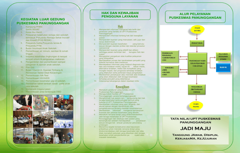 HAK DAN KEWAJIBAN PENGGUNA LAYANAN KEGIATAN LUAR GEDUNG PUSKESMAS PANUNGGANGAN 1. 2. 3. 4. 5. 6. 7. 8. 9. 10. 11. 12. 13. 14. 15. 16. 17. Kampung PHBS SAPA SEHAT Kelas Ibu Hamil. Pelayanan kesehatan remaja dan sekolah termasuk Posyandu Remaja Sehat Inovatif dan Kreatif (POS RESIK) Posyandu balita,Posyandu lansia & Posyandu PTM. Bulan Imunisasi Anak Sekolah Pemeriksaan air minum, sanitasi & rumah tinggal. Inspeksi kesehatan lingkungan di tempat tempat umum & pengolahan makanan. Pengambilan dan pemeriksaan sampel panganan & jajanan anak sekolah. Pos Gizi Bulan Vitamin A, Operasi Timbang & Pemberian Tablet Obat Kecacingan. Pemeriksaan IVA-Test Pemeriksaan HIV/AIDS Pemeriksaan kesehatan gigi di sekolah. Pemberian tablet tambah darah pada anak usia sekolah Homecare (cageur-jasa) Pemeriksaan area terdampak DBD ALUR PELAYANAN PUSKESMAS PANUNGGANGAN Hak 1. 2. 3. 4. 5. 6. 7. 8. 9. 10. Memperoleh informasi mengenai tata tertib dan peraturan yang berlaku di UPT Puskesmas Panunggangan Memperoleh informasi tentang hak dan kewajiban pasien Memperoleh layanan yang manusiawi, adil, jujur dan tanpa diskriminasi Memperoleh layanan kesehatan yang bernutu sesuai dengan standar profesi dan standar prosedur operasional Memperoleh layanan yang efektif dan efisien sehingga pasien terhindar dari kerugian fisik dan materi Mengajukan pengaduan atas kualitas pelayanan yang didapatkan Mendapatkan privasi dan kerahasiaan penyakit yang diderita termasuk data medisnya Mendapatkan informasi yang meliputi diagnosis dan tata cara tindakan medis, tujuan tin dakan medis, alternative tindakan, resiko dan komplikasi yang mungkin terjadi, dan prognosis terhadap tindakan yang dilakukan serta perkiraan biaya pengobatan Memberikan persetujuan atau menolak atas tindakan yang akan dilakukan oleh tenaga kesehatan terhadap penyakit yang dideritanya Didampingi keluarganya dalam keadaan kritis Kewajiban 1. 2. 3. 4. 5. 6. 7. Mematuhi peraturan yang berlaku di UPT Puskesmas Panunggangan Menggunakan fasiitas UPT Puskesmas Panunggangan secara bertanggungjawab Menghormati hak pasien lain, pengunjung dan hak tenaga kesehatan serta petugas lainnya yang bekerja di UPT Puskesmas Panunggangan. Memberikan informasi yang jujur, lengkap, dan akurat sesuai dengan kemampuan dan pengetahuannya tentang masalah kesehatannya. Memberikan informasi mengenai kemampuan finansial dan jaminan kesehatan yang dimiliki. Mematuhi rencana terapi yang direkomendasikan oleh tenaga kesehatan di UPT Puskesmas Panunggangan dan disetujui oleh pasien yang bersangkutan setelah mendapatkan penjelasan sesuai dengan ket entuan peraturan perundang – undangan. Menerima segala konsekuensi atas keputusan pribadinya untuk menolak rencana terapi yang direkomendasikan oleh tenaga kesehatan dan atau tidak mematuhi petunjuk yang diberikan oleh tenaga kesehatan untuk penyembuhan pe nyakit atau masalah kesehatan. TATA NILAI UPT PUSKESMAS PANUNGGANGAN JADI MAJU Tanggung JAwab, DIsiplin, KerjasaMA, KeJUjuran Telp. 021-22353600 Kota Tangerang Kelurahan Panunggangan, Kecamatan Pinang, Jalan Kyai Maja No. 2 @ [email protected] +6287748811864 KRITIK DAN SARAN : KESEHATAN ANDA KEPUASAN KAMI a. Pemeriksaan umum 3. Layanan Pemeriksaan Umum 2. 1. masyarakat terjangkau seluruh lapisan yang bermutu, merata, dan Memberikan pelayanan kesehatan kesehatan pendukung pembangunan Memberdayakan seluruh komponen berwawasan kesehatan Menggerakkan pembangunan MISI TANGERANG SEHAT MANDIRI HIDUP SEHAT MENUJU KOTA WILAYAH KERJA PUSKESMAS UNTUK MEWUJUDKAN MASYARAKAT DI PRIMA DALAM PELAYANAN DAN UPT PUSKESMAS PANUNGGANGAN JENIS PELAYANAN & JADWAL PELAYANAN VISI