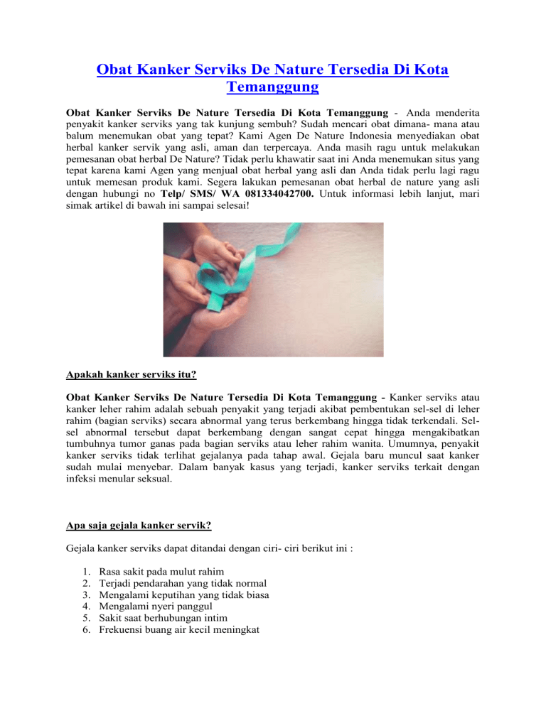 Obat Kanker Serviks De Nature Tersedia Di Kota Temanggung Obat Kanker Serviks De Nature Tersedia Di Kota Temanggung - Anda menderita penyakit kanker serviks yang tak kunjung sembuh? Sudah mencari obat dimana- mana atau balum menemukan obat yang tepat? Kami Agen De Nature Indonesia menyediakan obat herbal kanker servik yang asli, aman dan terpercaya. Anda masih ragu untuk melakukan pemesanan obat herbal De Nature? Tidak perlu khawatir saat ini Anda menemukan situs yang tepat karena kami Agen yang menjual obat herbal yang asli dan Anda tidak perlu lagi ragu untuk memesan produk kami. Segera lakukan pemesanan obat herbal de nature yang asli dengan hubungi no Telp/ SMS/ WA 081334042700. Untuk informasi lebih lanjut, mari simak artikel di bawah ini sampai selesai! Apakah kanker serviks itu? Obat Kanker Serviks De Nature Tersedia Di Kota Temanggung - Kanker serviks atau kanker leher rahim adalah sebuah penyakit yang terjadi akibat pembentukan sel-sel di leher rahim (bagian serviks) secara abnormal yang terus berkembang hingga tidak terkendali. Selsel abnormal tersebut dapat berkembang dengan sangat cepat hingga mengakibatkan tumbuhnya tumor ganas pada bagian serviks atau leher rahim wanita. Umumnya, penyakit kanker serviks tidak terlihat gejalanya pada tahap awal. Gejala baru muncul saat kanker sudah mulai menyebar. Dalam banyak kasus yang terjadi, kanker serviks terkait dengan infeksi menular seksual. Apa saja gejala kanker servik? Gejala kanker serviks dapat ditandai dengan ciri- ciri berikut ini : 1. 2. 3. 4. 5. 6. Rasa sakit pada mulut rahim Terjadi pendarahan yang tidak normal Mengalami keputihan yang tidak biasa Mengalami nyeri panggul Sakit saat berhubungan intim Frekuensi buang air kecil meningkat 7. Mengalami gangguan pencernaan 8. Kehilangan nafsu makan 9. Mengalami kelelahan Akan tetapi banyak wanita yang tidak menyadari bahkan meremehkan tanda yang mereka alami yang mungkin bisa jadi gejala kanker serviks stadium awal. Lalu, apa saja pengobatan yang dapat dilakukan oleh penderita kanker serviks? Pengobatan Kanker Serviks Obat Kanker Serviks De Nature Tersedia Di Kota Temanggung - Ada beberapa langkah pengobatan yang dapat dilakukan untuk menyembuhkan kanker serviks yang sedang Anda derita yaitu dengan cara Operasi, Radioterapi, ataupun Kemoterapi. Akan tetapi cara pengobatan tersebut ternyata tidak seefektif yang pasien harapkan. Penyakit ini bisa semakin kronis dan muncul kembali meskipun pengobatanya sudah dilakukan. Tapi jangan khawatir karena berbagai penelitian kesehatan yang dilakukan oleh orang berkompeten selalu berupaya menemukan pengobatan yang benar-benar efektif untuk penyakit ini. Baca Juga : Obat Kanker Serviks De Nature Tersedia Di Kota Bangkalan Obat herbal De Nature adalah satu-satunya solusi terbaik bagi Anda untuk mendapatkan pengobatan yang ampuh untuk penyakit kanker serviks yang sedang Anda derita saat ini. Obat herbal De Nature sudah teruji secara klinis bahwa obat herbal De Nature memiliki kandungan antioksidan yang sangat tinggi di mana zat antioksidan ini merupakan zat antikanker yang mampu menghambat atau menekan pertumbuhan dan perkembangan sel-sel kanker dalam tubuh Anda. Kini Anda tidak perlu ragu untuk melakukan pemesanan obat herbal De Nature yang asli, karena sekarang Anda telah menemukan situs yang tepat. Kami Agen obat herbal de nature yang asli dan terpercaya, jadi Anda tidak perlu lagi khawatir untuk melakukan pemesanan. Untuk mendapatkan produk yang asli segera hubungi no Telp/SMS/ Wa 081334042700. OBAT HERBAL KANKER SERVIKS ZIIRZAX & TYPHOGELL DE NATURE Informasi Pemesanan Produk Hubungi No Telp/SMS/ Wa 081334042700 Harga Obat Kanker Serviks De Nature : Paket 1 minggu : Rp 315.000 (Terdiri dari 1 botol Ziirzax dan 1 botol Typhogell) Paket 1 bulan : Rp 1.150.000 (Terdiri dari 4 botol Ziirzax dan 4 botol Typhogell) hemat Rp 110.000 Paket 2 bulan : Rp 1.995.000 (Terdiri dari 8 botol Ziirzak dan 8 botol Typhogell) hemat Rp 525.000 Obat Kanker Serviks De Nature berisi : 1 Botol Ziirzax isi 50 Kapsul 1 Botol Typhogell isi 50 Kapsul Aturan Minum: Kapsul Ziirzax diminum 3 kali Sehari 2 kapsul/btl 1 jam sebelum makan. Kapsul Typhogell diminum 3 kali Sehari 2 kapsul/btl 1 jam sebelum makan. (Belum termasuk ongkir) Obat Herbal Ziirzax De Nature Obat kanker alami de nature ziirzax diproduksi dari daun dan buah sirsak alami yang mempunyai banyak manfaat, dipadukan dengan bahan- bahan herbal lainya yang dapat membantu menyembuhkan penyakit kanker. Tiap kapsul obat kanker alami de nature ziirzax mengandung ekstrak yang setara dengan Annonane muricata folium 2500 mg. Obat kanker alami de nature ziirzax ini mempunyai banyak khasiat yang dapat membantu anda dalam mempercepat penyembuhan penyakit kanker dalam tubuh anda. Serta daun sirsak juga dapat membunuh dan memperbaiki tingkat kesehatan dalam tubuh. Obat Herbal Thypogell De Nature Obat kanker alami de nature typhogell diproduksi dari tanaman keladi tikus (Typhonium flagelliforme) yang digunakan sebagai obat kanker payudara. Tiap kapsul obat de nature mengandung ekstrak yang setara dengan Typhonium flagelliforme 500 mg Rhizoma exstra. Obat kanker alami de nature typhogell mempunyai banyak khasiat bagi tubuh anda.Sebagai imunitas antikanker, antimikrobia dan antioksidan. Penghambat pertumbuhan sel- sel kanker. Mengurangi efek buruk kemoterapi. Anti virus dan anti bakteri. Mengatasi diabetes. Mengatasi hipertensi. Meningkatkan kekebalan tubuh. OBAT HERBAL DE NATURE INDONESIA AMAN & ALAMI JL. Pahonjean Perum Cendana Asri No 9, Kecamatan Majenang, Kabupaten Cilacap,Jawa Tengah Kode Pos 53257 Whatsapp/ Telp/ Sms : 081334042700 Agen Resmi De Nature Indonesia menyediakan berbagai macam obat herbal de nature sebagai solusi untuk masalah kesehatan Anda. Anda sekarang tidak perlu lagi bingung- bingung untuk mencari obat herbal yang ampuh untuk menyembuhkan penyakit yang sedang Anda derita, setiap penyakit pasti ada obatnya tetapi tidak semua penyakit obatnya sama, jadi Anda harus bijak dalam memilih obat herbal. Obat 