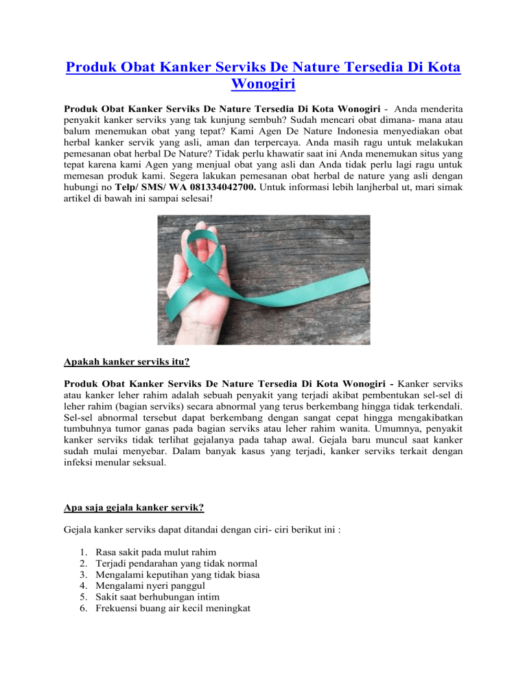 Produk Obat Kanker Serviks De Nature Tersedia Di Kota Wonogiri Produk Obat Kanker Serviks De Nature Tersedia Di Kota Wonogiri - Anda menderita penyakit kanker serviks yang tak kunjung sembuh? Sudah mencari obat dimana- mana atau balum menemukan obat yang tepat? Kami Agen De Nature Indonesia menyediakan obat herbal kanker servik yang asli, aman dan terpercaya. Anda masih ragu untuk melakukan pemesanan obat herbal De Nature? Tidak perlu khawatir saat ini Anda menemukan situs yang tepat karena kami Agen yang menjual obat yang asli dan Anda tidak perlu lagi ragu untuk memesan produk kami. Segera lakukan pemesanan obat herbal de nature yang asli dengan hubungi no Telp/ SMS/ WA 081334042700. Untuk informasi lebih lanjherbal ut, mari simak artikel di bawah ini sampai selesai! Apakah kanker serviks itu? Produk Obat Kanker Serviks De Nature Tersedia Di Kota Wonogiri - Kanker serviks atau kanker leher rahim adalah sebuah penyakit yang terjadi akibat pembentukan sel-sel di leher rahim (bagian serviks) secara abnormal yang terus berkembang hingga tidak terkendali. Sel-sel abnormal tersebut dapat berkembang dengan sangat cepat hingga mengakibatkan tumbuhnya tumor ganas pada bagian serviks atau leher rahim wanita. Umumnya, penyakit kanker serviks tidak terlihat gejalanya pada tahap awal. Gejala baru muncul saat kanker sudah mulai menyebar. Dalam banyak kasus yang terjadi, kanker serviks terkait dengan infeksi menular seksual. Apa saja gejala kanker servik? Gejala kanker serviks dapat ditandai dengan ciri- ciri berikut ini : 1. 2. 3. 4. 5. 6. Rasa sakit pada mulut rahim Terjadi pendarahan yang tidak normal Mengalami keputihan yang tidak biasa Mengalami nyeri panggul Sakit saat berhubungan intim Frekuensi buang air kecil meningkat 7. Mengalami gangguan pencernaan 8. Kehilangan nafsu makan 9. Mengalami kelelahan Akan tetapi banyak wanita yang tidak menyadari bahkan meremehkan tanda yang mereka alami yang mungkin bisa jadi gejala kanker serviks stadium awal. Lalu, apa saja pengobatan yang dapat dilakukan oleh penderita kanker serviks? Pengobatan Kanker Serviks Produk Obat Kanker Serviks De Nature Tersedia Di Kota Wonogiri - Ada beberapa langkah pengobatan yang dapat dilakukan untuk menyembuhkan kanker serviks yang sedang Anda derita yaitu dengan cara Operasi, Radioterapi, ataupun Kemoterapi. Akan tetapi cara pengobatan tersebut ternyata tidak seefektif yang pasien harapkan. Penyakit ini bisa semakin kronis dan muncul kembali meskipun pengobatanya sudah dilakukan. Tapi jangan khawatir karena berbagai penelitian kesehatan yang dilakukan oleh orang berkompeten selalu berupaya menemukan pengobatan yang benar-benar efektif untuk penyakit ini. Baca Juga : Obat Kanker Serviks De Nature Tersedia Di Kota Temanggung Obat herbal De Nature adalah satu-satunya solusi terbaik bagi Anda untuk mendapatkan pengobatan yang ampuh untuk penyakit kanker serviks yang sedang Anda derita saat ini. Obat herbal De Nature sudah teruji secara klinis bahwa obat herbal De Nature memiliki kandungan antioksidan yang sangat tinggi di mana zat antioksidan ini merupakan zat antikanker yang mampu menghambat atau menekan pertumbuhan dan perkembangan sel-sel kanker dalam tubuh Anda. Kini Anda tidak perlu ragu untuk melakukan pemesanan obat herbal De Nature yang asli, karena sekarang Anda telah menemukan situs yang tepat. Kami Agen obat herbal de nature yang asli dan terpercaya, jadi Anda tidak perlu lagi khawatir untuk melakukan pemesanan. Untuk mendapatkan produk yang asli segera hubungi no Telp/SMS/ Wa 081334042700. OBAT HERBAL KANKER SERVIKS ZIIRZAX & TYPHOGELL DE NATURE Informasi Pemesanan Produk Hubungi No Telp/SMS/ Wa 081334042700 Harga Obat Kanker Serviks De Nature : Paket 1 minggu : Rp 315.000 (Terdiri dari 1 botol Ziirzax dan 1 botol Typhogell) Paket 1 bulan : Rp 1.150.000 (Terdiri dari 4 botol Ziirzax dan 4 botol Typhogell) hemat Rp 110.000 Paket 2 bulan : Rp 1.995.000 (Terdiri dari 8 botol Ziirzak dan 8 botol Typhogell) hemat Rp 525.000 Obat Kanker Serviks De Nature berisi : 1 Botol Ziirzax isi 50 Kapsul 1 Botol Typhogell isi 50 Kapsul Aturan Minum: Kapsul Ziirzax diminum 3 kali Sehari 2 kapsul/btl 1 jam sebelum makan. Kapsul Typhogell diminum 3 kali Sehari 2 kapsul/btl 1 jam sebelum makan. (Belum termasuk ongkir) Obat Herbal Ziirzax De Nature Obat kanker alami de nature ziirzax diproduksi dari daun dan buah sirsak alami yang mempunyai banyak manfaat, dipadukan dengan bahan- bahan herbal lainya yang dapat membantu menyembuhkan penyakit kanker. Tiap kapsul obat kanker alami de nature ziirzax mengandung ekstrak yang setara dengan Annonane muricata folium 2500 mg. Obat kanker alami de nature ziirzax ini mempunyai banyak khasiat yang dapat membantu anda dalam mempercepat penyembuhan penyakit kanker dalam tubuh anda. Serta daun sirsak juga dapat membunuh dan memperbaiki tingkat kesehatan dalam tubuh. Obat Herbal Thypogell De Nature Obat kanker alami de nature typhogell diproduksi dari tanaman keladi tikus (Typhonium flagelliforme) yang digunakan sebagai obat kanker payudara. Tiap kapsul obat de nature mengandung ekstrak yang setara dengan Typhonium flagelliforme 500 mg Rhizoma exstra. Obat kanker alami de nature typhogell mempunyai banyak khasiat bagi tubuh anda.Sebagai imunitas antikanker, antimikrobia dan antioksidan. Penghambat pertumbuhan sel- sel kanker. Mengurangi efek buruk kemoterapi. Anti virus dan anti bakteri. Mengatasi diabetes. Mengatasi hipertensi. Meningkatkan kekebalan tubuh. OBAT HERBAL DE NATURE INDONESIA AMAN & ALAMI JL. Pahonjean Perum Cendana Asri No 9, Kecamatan Majenang, Kabupaten Cilacap,Jawa Tengah Kode Pos 53257 Whatsapp/ Telp/ Sms : 081334042700 Agen Resmi De Nature Indonesia menyediakan berbagai macam obat herbal de nature sebagai solusi untuk masalah kesehatan Anda. Anda sekarang tidak perlu lagi bingung- bingung untuk mencari obat herbal yang ampuh untuk menyembuhkan penyakit yang sedang Anda derita, setiap penyakit pasti ada obatnya tetapi tidak semua penyakit obatnya sama, jadi Anda harus bijak dalam memi