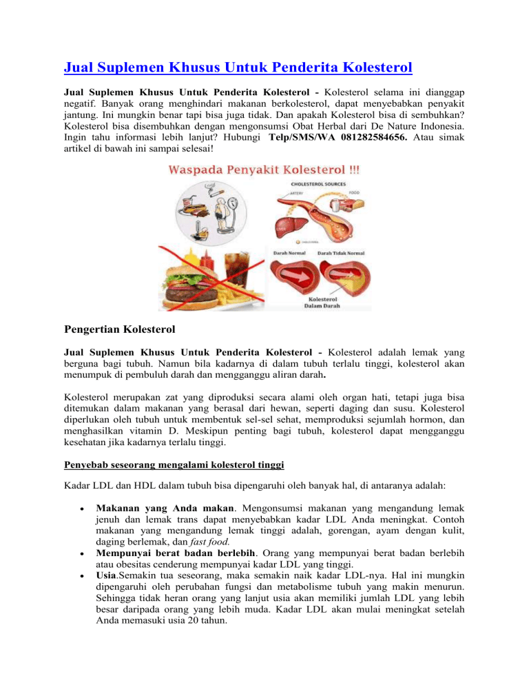 Jual Suplemen Khusus Untuk Penderita Kolesterol Jual Suplemen Khusus Untuk Penderita Kolesterol - Kolesterol selama ini dianggap negatif. Banyak orang menghindari makanan berkolesterol, dapat menyebabkan penyakit jantung. Ini mungkin benar tapi bisa juga tidak. Dan apakah Kolesterol bisa di sembuhkan? Kolesterol bisa disembuhkan dengan mengonsumsi Obat Herbal dari De Nature Indonesia. Ingin tahu informasi lebih lanjut? Hubungi Telp/SMS/WA 081282584656. Atau simak artikel di bawah ini sampai selesai! Pengertian Kolesterol Jual Suplemen Khusus Untuk Penderita Kolesterol - Kolesterol adalah lemak yang berguna bagi tubuh. Namun bila kadarnya di dalam tubuh terlalu tinggi, kolesterol akan menumpuk di pembuluh darah dan mengganggu aliran darah. Kolesterol merupakan zat yang diproduksi secara alami oleh organ hati, tetapi juga bisa ditemukan dalam makanan yang berasal dari hewan, seperti daging dan susu. Kolesterol diperlukan oleh tubuh untuk membentuk sel-sel sehat, memproduksi sejumlah hormon, dan menghasilkan vitamin D. Meskipun penting bagi tubuh, kolesterol dapat mengganggu kesehatan jika kadarnya terlalu tinggi. Penyebab seseorang mengalami kolesterol tinggi Kadar LDL dan HDL dalam tubuh bisa dipengaruhi oleh banyak hal, di antaranya adalah: Makanan yang Anda makan. Mengonsumsi makanan yang mengandung lemak jenuh dan lemak trans dapat menyebabkan kadar LDL Anda meningkat. Contoh makanan yang mengandung lemak tinggi adalah, gorengan, ayam dengan kulit, daging berlemak, dan fast food. Mempunyai berat badan berlebih. Orang yang mempunyai berat badan berlebih atau obesitas cenderung mempunyai kadar LDL yang tinggi. Usia.Semakin tua seseorang, maka semakin naik kadar LDL-nya. Hal ini mungkin dipengaruhi oleh perubahan fungsi dan metabolisme tubuh yang makin menurun. Sehingga tidak heran orang yang lanjut usia akan memiliki jumlah LDL yang lebih besar daripada orang yang lebih muda. Kadar LDL akan mulai meningkat setelah Anda memasuki usia 20 tahun. Kurang olahraga. Olahraga ternyata bisa membantu meningkatkan kadar HDL dan juga membuat LDL menjadi kurang berbahaya, dengan cara meningkatkan ukuran partikel yang membentuk LDL. Riwayat keluarga. Bila anggota keluarga Anda ada yang memiliki riwayat kolesterol tinggi, Anda mungkin akan mengalami hal yang sama. Orang kurus yang mempunyai keturunan kolesterol tinggi pun bisa jadi mempunyai kolesterol yang tinggi juga. Jadi, penyakit ini tidak hanya bisa dimiliki oleh orang gemuk saja, jangan salah. Genetik dapat mengontrol sel agar tidak menghilangkan LDL dalam darah dengan cepat atau juga dapat menyebabkan hati menghasilkan terlalu banyak LDL. Oleh karena itu, jika Anda mempunyai keturunan kolesterol tinggi, sebaiknya kontrol faktor-faktor yang bisa diubah (seperti menjaga asupan makan dan berolahraga). Gejala Kolesterol Jual Suplemen Khusus Untuk Penderita Kolesterol - Kolesterol tinggi tidak menimbulkan gejala. Akibatnya, banyak orang tidak sadar memiliki kadar kolesterol tinggi, sampai muncul komplikasi serius seperti penyakit jantung atau stroke. Oleh sebab itu, penting untuk melakukan tes darah untuk mengetahui normal atau tingginya kolesterol.Untuk orang dewasa, disarankan untuk melakukan pemeriksaan kolesterol tiap 4-6 tahun sekali, mulai usia 20 tahun. Walaupun jarang mengalami kolesterol tinggi, pemeriksaan kolesterol pada anak-anak juga disarankan pada saat anak berusia 9-11 tahun, dan diulangi pada saat berusia 17-21. Pada anak-anak dari keluarga penderita diabetes dan kolesterol tinggi, pemeriksaan kolesterol disarankan pada saat anak berusia 2-8 tahun dan diulangi pada usia 12-16 tahun. Informasi lebih lanjut hubungi Telp/SMS/WA 081282584656 Akibat Kolesterol Tinggi Kadar kolesterol yang berlebihan perlu ditangani. Apabila dibiarkan, kolesterol akan menumpuk di dinding pembuluh darah arteri dan membentuk plak, sehingga membuat arteri menyempit. Kondisi ini disebut dengan aterosklerosis. Aterosklerosis lama kelamaan dapat membuat aliran darah tersumbat, akibatnya menimbulkan sejumlah penyakit berbahaya berikut ini: Penyakit jantung koroner. Penyumbatan terjadi di pembuluh arteri jantung, sehingga otot jantung kurang mendapat nutrisi. Serangan jantung. Serangan jantung terjadi ketika aliran darah ke jantung tersumbat total. Stroke. Stroke terjadi ketika aliran darah ke otak tersumbat. Penyakit arteri perifer. Kondisi ini terjadi ketika aliran darah ke tungkai tersumbat. Obat alami kurangi kolesterol Moringa dan Habatop De Nature PAKET HERBAL KOLESTEROLKONSULTASI DAN CARA PEMESANAN HUBUNGI CUSTOMER SERVICE KAMI : TELP/WA : 081282584656 Cara mencegah atau menurunkan kadar kolesterol 1. Gaya hidup sehat sangat diperlukan dalam mengani kondisi kolesterol tinggi. 2. Mengonsumsi makanan sehat dan bergizi seimbang adalah salah satu langkahutama yang bisa dilakukan dalam mencegah atau menurunkan kadar kolesterol. 3. Kandungan lemak dalam makanan harus rendah. Cobalah ganti konsumsi makanan yang mengandung lemak jenuh dengan buah-buahan dan sayur-sayuran, serta bijibijian utuh (misalnya roti gandum utuh). 4. Dengan begitu, kadar kolesterol dalam tubuh akan tetap rendah. Selain diet sehat, 5. Segera mulai melakukan olah raga secara rutin dan turunkan berat badan bagi yang mengalami kelebihan berat badan. 6. Hindari merokok. Pertanyaan yang sering terpikirkan di benak Anda : Jika Saya terlanjur kena penyakit kolesterol, bagaimana cara mengobatinya? Bagaimana cara mengobati penyakit kolesterol dengan cepat dan tuntas? Bagaimana berobat yang mudah tanpa perlu ke dokter? Jawabannya: semua bisa, asal Anda memilih produk yang tepat, yaitu Moringa dan Habatop De Nature Pengobatan Penyakit Kolesterol Jual Suplemen Khusus Untuk Penderita Kolesterol - Pengobatan kolesterol secara tradisional yaitu dengan menggunakan Obat kolesterol dari De Nature. Produk yang terbuat dari bahan herbal alami diramu dengan resep tradisional dan diolah secara teknologi modern, sehingga aman di konsumsi. Jadi anda juga tak perlu khawatir karena Obat Herbal De Nature yang kami ta