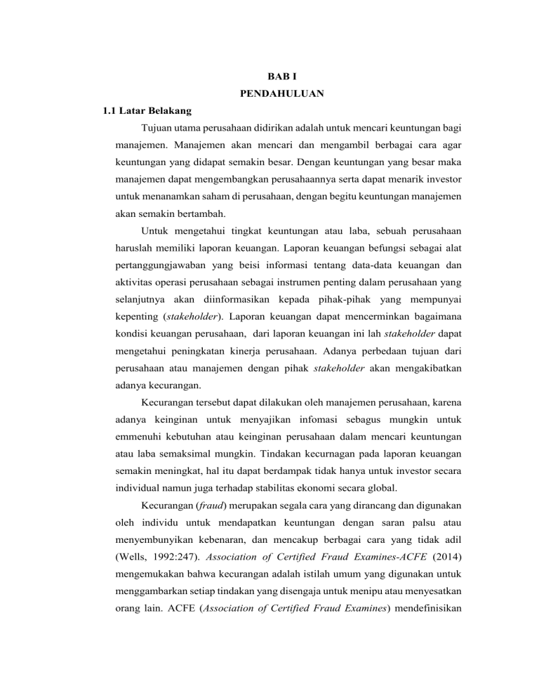BAB I PENDAHULUAN 1.1 Latar Belakang Tujuan utama perusahaan didirikan adalah untuk mencari keuntungan bagi manajemen. Manajemen akan mencari dan mengambil berbagai cara agar keuntungan yang didapat semakin besar. Dengan keuntungan yang besar maka manajemen dapat mengembangkan perusahaannya serta dapat menarik investor untuk menanamkan saham di perusahaan, dengan begitu keuntungan manajemen akan semakin bertambah. Untuk mengetahui tingkat keuntungan atau laba, sebuah perusahaan haruslah memiliki laporan keuangan. Laporan keuangan befungsi sebagai alat pertanggungjawaban yang beisi informasi tentang data-data keuangan dan aktivitas operasi perusahaan sebagai instrumen penting dalam perusahaan yang selanjutnya akan diinformasikan kepada pihak-pihak yang mempunyai kepenting (stakeholder). Laporan keuangan dapat mencerminkan bagaimana kondisi keuangan perusahaan, dari laporan keuangan ini lah stakeholder dapat mengetahui peningkatan kinerja perusahaan. Adanya perbedaan tujuan dari perusahaan atau manajemen dengan pihak stakeholder akan mengakibatkan adanya kecurangan. Kecurangan tersebut dapat dilakukan oleh manajemen perusahaan, karena adanya keinginan untuk menyajikan infomasi sebagus mungkin untuk emmenuhi kebutuhan atau keinginan perusahaan dalam mencari keuntungan atau laba semaksimal mungkin. Tindakan kecurnagan pada laporan keuangan semakin meningkat, hal itu dapat berdampak tidak hanya untuk investor secara individual namun juga terhadap stabilitas ekonomi secara global. Kecurangan (fraud) merupakan segala cara yang dirancang dan digunakan oleh individu untuk mendapatkan keuntungan dengan saran palsu atau menyembunyikan kebenaran, dan mencakup berbagai cara yang tidak adil (Wells, 1992:247). Association of Certified Fraud Examines-ACFE (2014) mengemukakan bahwa kecurangan adalah istilah umum yang digunakan untuk menggambarkan setiap tindakan yang disengaja untuk menipu atau menyesatkan orang lain. ACFE (Association of Certified Fraud Examines) mendefinisikan juga kecurangan pada laporan keuangan sebagai kesengajaan, kesalhan dalam melaporkan atau penghilangan fakta yang bersifat material, atau data akuntansi yang dapat menyesatkan dan ketika digunakan sebagai bahan pertimbangandengan seluruh informasi yang ada, akan menyebabkan pengguna laporan keuangan mengubah atau menukar pertimbangan atau keputusannya. ACFE (Association of Certified Fraud Examines) membagi kecurangan dalam tiga kategori yang memengaruhi organisasi yaitu pengembalian aset secara ilegal (asset misappropriation), kecurangan dalam penyajian laporan keuangan (fraudulent financial statement) dan korupsi (corruption) (Bhasin, 2013:12). Dai ketiga kategori tersebut, kecurangan terhadap aset (asset misappropriation) adalah kecurangan yang paling banyak terjadi, disusul dengan tindak korupsi dan penyuapan. Risiko penipuan meningkat karena adanya pertumbuhan globalisasi, pasar yang kompetitif, perkembangan yang pesat dalam teknologi, dan adanya kesulitan ekonomi. Kecurangan dalam penyajian laporan keuangan (fraudulent financial statement) merupakan kecurangan yang peling sedikit ditemui, namun memiliki tingkat kerugian yang paling besar dari ketiga bentuk kecurangan tersebut. Kecurangan penyajian laporan keuangan (fraudulent financial statement) pada umumnya digunakan untuk menyembunyikan kondisi keuangan yang sebenarnya terjadi dalam perusahaan dengan melakukan rekayasa keuangan. Laporan keuangan yang disajikan dengan informasi yang salah atau tidak sesuai dengan kondisi keuangan yang ada akan menimbulkan masalah serius bagi perusahaan maupun pihak ekstrenal yang terkait. Kecurangan penyajian Laporan Keuangan dapat dideteksi salah satunya dengan menggunakan Fraud Model. Fraud Model telah melalui beberapa pengembangan hingga saat ini. Teori pertama yang berkaitan dengan Fraud Model adalah teori kecurangan segitiga (fraud triagle) yang di kemukakan oleh Donald R.Cressey (1953). Theory Fraud Triangle terdiri dari 3 komponen, yaitu tekanan (pressure), rasionalisasi (rationalization), dan peluang atau kesempatan (opportunity) (Skousen et al., 2009). Ketiga kondisi tersebut merupakan faktor risiko dari munculnya kecurangan dalam berbagai situasi. Seiring dengan berjalannya waktu, terus terjadi perkembangan akan teori fraud triangle yang dikemukakan oleh Cressey. Theory Fraud Triangle dikembangkan oleh Wolfe dan Hermason (2004) dengan menambahkan tiga elemen indikator yang telah di kemukakan oleh Cressey dengan kemampuan (Capacity) sebagai pertimbangan kondisi lain yang dimungkinkan dapat mempengaruhi terjadinya Fraud (kecurangan), empat kondisi tersebut dikenal sebagai Theory Fraud Diamond. Tidak terhenti pada Fraud Diamond, Crowe (2011) juga turut menyempurnakan terori yang dicetuskan oleh Cressey dikarenakan permasalahan kecurangan (fraud) yang lebih komplek. Crowe menambahkan elemen arogansi (arrogance) yang juga turut mempengaruhi terjadinya kecurangan. Crowe turut memasukkan fraud triangle theory dan elemen kompetensi (competence) di dalamnya, sehingga fraud model yang dikemukakan oleh Crowe terdiri dari lima elemen indikator yaitu tekanan (pressure), kesempatan (opportunity), rasionalisasi (razionaization), kompetensi (competence), dan arogansi (arrogance). Teori yang dipaparkan oleh Crowe pada tahun 2011 ini dinamakan dengan Crowe’s fraud pentagon theory. Dengan penerapan Fraud Model yang tepat dapat mempermudah deteksi kecurangan dalam laporran keuangan perusahaan. Dari ketiga teori dalam fraud model sebenarnya tidak memiliki banyak perbedaan. Jika dalam theory fraud triangle yang dikemukakan Donald R.Cressey (1953) hanya memfokuskan pada kemungkinkan terjadinya manipulasi laporan oleh manajemen menengah, dalam fraud pentagon theory terdapat adanya skema kecurangan (fraud) yang lebih luas yang dapat dilakukan oleh manajemen atas ataupun CEO perusahaan (Jonathan Marks, 2012). Dengan alasan tersebut maka penelitian ini menerapkan Crowe’s fraud pentagon theory. Disamping alasan diatas, juga kerana elemen indikator pada 