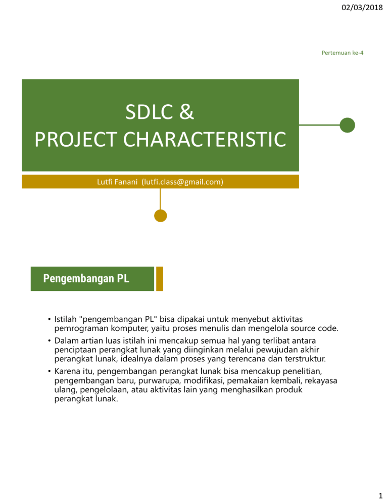 02/03/2018 Pertemuan ke-4 SDLC & PROJECT CHARACTERISTIC Lutfi Fanani ([email protected]) • Istilah "pengembangan PL" bisa dipakai untuk menyebut aktivitas pemrograman komputer, yaitu proses menulis dan mengelola source code. • Dalam artian luas istilah ini mencakup semua hal yang terlibat antara penciptaan perangkat lunak yang diinginkan melalui pewujudan akhir perangkat lunak, idealnya dalam proses yang terencana dan terstruktur. • Karena itu, pengembangan perangkat lunak bisa mencakup penelitian, pengembangan baru, purwarupa, modifikasi, pemakaian kembali, rekayasa ulang, pengelolaan, atau aktivitas lain yang menghasilkan produk perangkat lunak. 1 02/03/2018 • Tujuan pengembangan PL: 1. Memenuhi kebutuhan klien/bisnis tertentu (perangkat lunak kustom), 2. Memenuhi persepsi kebutuhan sejumlah pengguna potensial (perangkat lunak komersial dan terbuka), atau 3. Memenuhi kebutuhan pribadi (misalnya seorang ilmuwan menulis perangkat lunak untuk mengotomasikan sebuah tugas yang rumit). • Proses pengembangan perangkat lunak (Software development process) adalah suatu struktur yang diterapkan pada pengembangan suatu produk perangkat lunak yang bertujuan untuk mengembangkan sistem dan memberikan panduan yang bertujuan untuk menyukseskan proyek pengembangan sistem melalui tahap demi tahap. • Proses ini memiliki beberapa model yang masing-masing menjelaskan pendekatan terhadap berbagai tugas atau aktivitas yang terjadi selama proses 2 02/03/2018 • Waterfall merupakan pendekatan yang paling sederhana dari berbagai pendekatan yang ada pada pengembangan perangkat lunak. • Pada gambar di bawah, di jelaskan bahwa apabila suatu fase telah selesai (contoh : requirement gathering), barulah proses dapat berlanjut ke fase berikutnya (contoh : system analysis). 3 02/03/2018 • Pendekatan jenis ini mengasumsikan bahwa semuanya berjalan dengan lancar apabila suatu fase telah terselesaikan sehingga tidak perlu untuk kembali ke fase sebelumnya. • Pendekatan ini cocok digunakan bila pengembang telah atau pernah mengembangkan perangkat lunak yang serupa sebelumnya dan sadar akan setiap permasalahan yang ada dalam pengembangannya. • Pendekatan spiral merupakan pendekatan yang memungkinkan pengembangan secara incremental. • Incremental yang dimaksud adalah pada setiap fasenya dapat dilalui lebih dari 1 kali dalam rangka pengembangan maupun perbaikan perangkat lunak yang dikembangkan. • Berbeda dengan pendekatan waterfall yang setiap fasenya hanya dilalui sekali, pada pendekatan ini, fase – fase yang terdapat pada pendekatan ini bisa dilalui berkali -kali. • Kekurangan dari pendekatan jenis ini adalah proses serta management nya yang komples serta tidak sesuai untuk diterapkan ke projek – projek kecil. 4 02/03/2018 • Pendekatan jenis ini merupakan pendekatan yang mengacu pada pembuatan prototipe perangkat lunak yang memiliki fungsionalitas terbatas. • Pendekatan ini memungkinkan untuk mendapat feedback dari coustomer dan membantu pengembang untuk memahami apa yang diinginkan oleh costumer secara jelas. 5 02/03/2018 • Pendekatan model ini mengharuskan tugas-tugas pengembangan di pisahkan ke dalam sebuah time boxes. • Pendekatan ini merupakan kombinasi dari iterative dan incremental proses model yang berfokus pada adaptability dan kepuasan costumer dengan waktu pengerjaan yang cepat. • Beberapa metode agile yang populer digunakan yaitu SCRUM, Extreme Programming, Rational Unified Process, dan lain sebagainya. 6 02/03/2018 project management quadrant • Proyek PL memiliki tingkat abstraksi yang berbeda, yang terbagi menjadi dua dimensi. • Dimensi pertama berkaitan dengan tujuan proyek, terdapat dua nilai: 1. Tujuannya ditentukan dengan jelas (benar-benar diketahui) atau 2. Tidak secara jelas ditentukan (tidak sepenuhnya diketahui). • Dimensi kedua berkaitan dengan solusinya, bagaimana berharap untuk mencapai tujuan, memiliki dua nilai: 1. Solusinya dengan jelas ditentukan (benar-benar diketahui) atau 2. Tidak secara jelas ditentukan (tidak sepenuhnya diketahui). 7 02/03/2018 • Jika kita memotong dua dimensi tersebut, kita telah mendefinisikan klasifikasi empat kategori proyek. Penting untuk dicatat bahwa batas antara yang jelas dan tidak jelas adalah batas konseptual. • Artinya, setiap proyek harus dibagi menjadi satu dari empat kuadran berikut: 1. 2. 3. 4. TPM: Traditional Project Management (linear and incremental PMLC models) APM: Agile Project Management (iterative and adaptive PMLC models) xPM: Extreme Project Management (extreme PMLC models) MPx: Emertxe Project Management (extreme PMLC models) • TPM: Traditional Project Management (linear and incremental PMLC models) • APM: Agile Project Management (iterative and adaptive PMLC models) • xPM: Extreme Project Management (extreme PMLC models) • MPx: Emertxe Project Management (extreme PMLC models) 8 02/03/2018 • Pada kuadran TPM, tujuan dan solusinya telah terdefinisikan dengan jelas. Proyek pada kuadran ini tergolong proyek yang sederhana. • Karena proyek ini sangat familiar bagi organisasi, persyaratannya juga akan diketahui. • Memiliki persyaratan lengkap berarti solusinya akan didefinisikan secara jelas dan struktur rincian kerja yang lengkap (WBS) dapat dihasilkan. • Model TPM akan bekerja cukup baik untuk proyek-proyek ini. • Selanjutnya dalam rangka meningkatkan ketidakpastian adalah proyek di kuadran APM. • Pada kuadran APM, tujuan yang didefinisikan dengan jelas dan sebagian besar solusi diketahui, dan harus ditemukan sebagai bagian dari model PMLC yang dipilih untuk mengelola proyek. • Karena beberapa solusi tidak diketahui, risiko yang terkait dengan proyek ini jauh lebih tinggi daripada risiko yang terkait dengan proyek di kuadran TPM. 9 02/03/2018 • Keberhasilan penyelesaian proyek semacam ini akan sangat penting bagi organisasi. Oleh karena itu, nilai bisnis harus cukup tinggi untuk menjamin pengambilan proyek berisiko tinggi ini. • Jelas, persyaratan tidak dapat didefinisikan