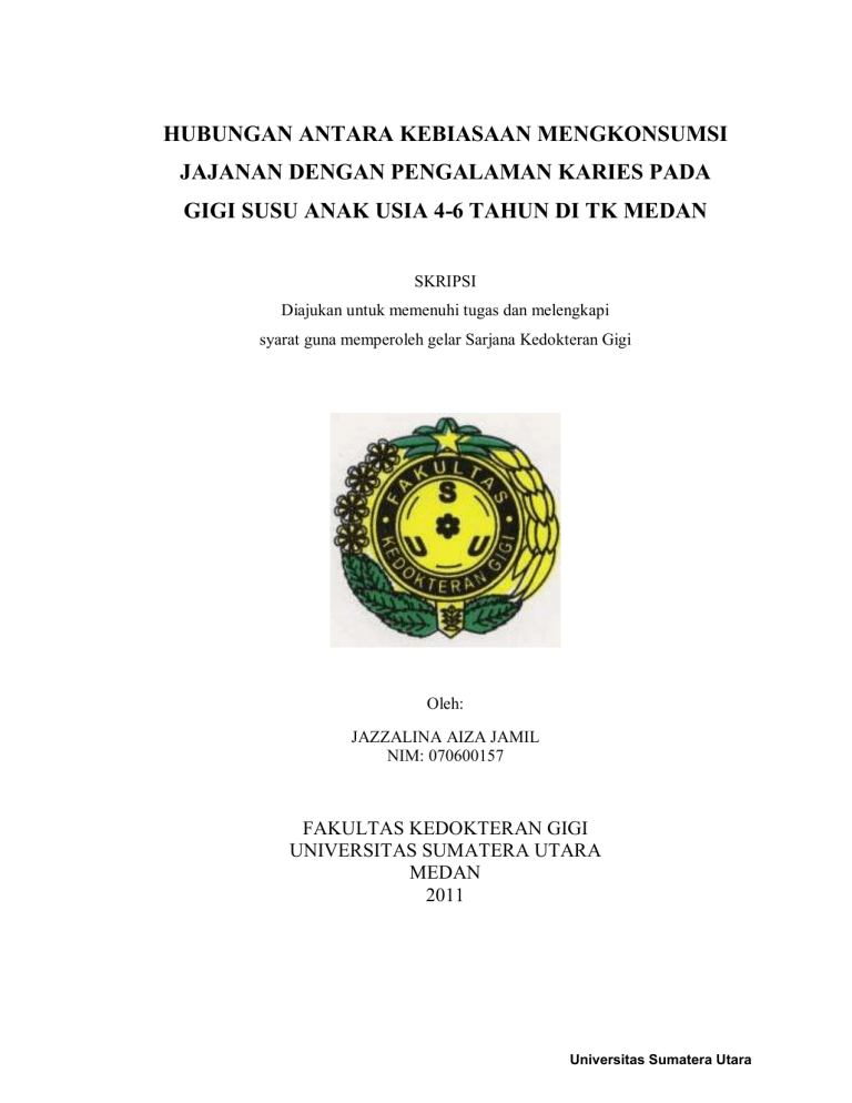 HUBUNGAN ANTARA KEBIASAAN MENGKONSUMSI JAJANAN DENGAN PENGALAMAN KARIES PADA GIGI SUSU ANAK USIA 4-6 TAHUN DI TK MEDAN SKRIPSI Diajukan untuk memenuhi tugas dan melengkapi syarat guna memperoleh gelar Sarjana Kedokteran Gigi Oleh: JAZZALINA AIZA JAMIL NIM: 070600157 FAKULTAS KEDOKTERAN GIGI UNIVERSITAS SUMATERA UTARA MEDAN 2011 Universitas Sumatera Utara Fakultas Kedokteran Gigi Departemen Ilmu Kedokteran Gigi Anak Tahun 2011 Jazzalina Aiza Jamil Hubungan antara kebiasaan mengkonsumsi jajanan dengan pengalaman karies pada gigi susu anak usia 4-6 tahun di TK Medan. ix + 41 halaman. Salah satu faktor etiologi terjadinya karies adalah faktor substrat atau diet dimana dapat terdiri dari jajanan yang bersifat kariogenik dan dimakan di luar jamjam makan atau di antara jam-jam makan. Pada umumnya hampir semua anak menyukai jajanan yang rasanya manis seperti coklat, permen dan es krim. Jenis makanan ini merupakan karbohidrat yang sangat kariogenik dan berpotensi mengakibatkan karies. Tujuan penelitian ini adalah untuk mengetahui hubungan antara kebiasaan mengkonsumsi jajanan dengan pengalaman karies pada gigi susu anak usia 4-6 tahun di TK Medan Bakti, TK Annisa’ dan TK An-Nida’ Penelitian ini adalah penelitian analitik observasional dengan desain cross sectional yang dilakukan pada anak-anak usia 4-6 tahun di 3 taman kanak-kanak yaitu TK Medan Bakti, TK Annisa’ dan TK An-Nida’. Jumlah responden penelitian ini adalah sebesar 120 orang. Pemilihan sekolah TK di Medan dilakukan secara purposive. Indeks pengukuran karies yang digunakan adalah indeks karies Klein untuk def-t. Uji analisis yang digunakan adalah One way Anova, Kruskal Wallis dan Mann-Whitney. Universitas Sumatera Utara Kebiasaan mengkonsumsi jajanan meliputi frekuensi jajanan dengan jenis jajanan yang bersifat kariogenik dan non-kariogenik. Hasil penelitian menunjukkan bahwa kebanyakan anak-anak menyukai jajanan yang berpotensi tinggi, sedang dan rendah menyebabkan karies. Berdasarkan uji statistik terlihat adanya perbedaan bermakna antara jajanan berpotensi tinggi, sedang dan rendah menyebabkan karies dengan pengalaman karies. Hasil penelitian ini menunjukkan jenis jajanan dan frekuensi jajan anak memainkan peran yang penting dalam menjaga kesehatan gigi dan mulut anak. Orang tua perlu mengawasi perilaku jajan anak agar kesehatan gigi anak yang baik dapat dibentuk sejak dini. Daftar pustaka: 31 (1975-2010) Universitas Sumatera Utara PERNYATAAN PERSETUJUAN Skripsi ini telah disetujui untuk dipertahankan di hadapan tim penguji skripsi Medan, 20 Juni 2011 Pembimbing: Tanda tangan 1. Taqwa Dalimunthe, drg.,Sp. KGA ……………..…… NIP : 1952 0314 1979 02 200 Universitas Sumatera Utara TIM PENGUJI SKRIPSI Skripsi ini telah dipertahankan di hadapan tim penguji pada tanggal 20 Juni 2011 TIM PENGUJI KETUA : Essie Octiara, drg., SpKGA ANGGOTA : 1. T. Hermina M., drg 2. Taqwa D., drg., SpKGA Universitas Sumatera Utara KATA PENGANTAR Puji dan syukur dipanjatkan kepada Tuhan Yang Maha Esa yang telah memberikan rahmat dan hidayahNya sehingga penulis dapat menyelesaikan skripsi ini dalam rangka memenuhi kewajiban penulis sebagai salah satu syarat untuk mendapatkan gelar Sarjana Kedokteran Gigi Universitas Sumatera Utara. Dalam penulisan skripsi ini, penulis telah banyak mendapat bimbingan, pengarahan dan saran dari berbagai pihak. Untuk itu penulis mempersembahkan rasa hormat dan terima kasih sedalam-dalamnya kepada kedua orang tua tercinta. Ayahanda Jamil Bin Anwar, Ibunda Seloma Binti Ahmad dan keluarga yang telah memberikan dorongan dan semangat sejak awal kuliah hingga selesainya skripsi ini. Pada kesempatan ini penulis ingin mengucapkan terima kasih yang sebenarbenarnya kepada: 1. Prof. H Nazruddin, drg., C.ort Ph.D., Sp.Ort. selaku Dekan Fakultas Kedokteran Gigi Universitas Sumatera Utara. 2. Yati Roesnawi, drg., selaku Ketua Departemen Ilmu Kedokteran Gigi Anak, Fakultas Kedokteran Gigi Universitas Sumatera Utara. 3. Taqwa Dalimunthe, drg.,Sp. KGA selaku dosen pembimbing skripsi yang telah meluangkan waktu, tenaga, dan pikiran dengan penuh kesabaran membimbing, memberi petunjuk dan pengarahan serta saran kepada penulis sehingga dapat menyelesaikan skripsi. Universitas Sumatera Utara 4. Prof. Lina Natamiharja yang telah sudi meluangkan waktunya untuk memberi petunjuk dan bimbingan kepada penulis. 5. Seluruh staf dosen dan pegawai Departemen Ilmu Kedokteran Gigi Anak, Fakultas Kedokteran Gigi USU. 6. Teman-teman skripsi penulis, Jesica N. Sihite, Yusoff dan Nurul Syahidah diatas dorongan dan saran selama penulisan skripsi ini. 7. Teman-teman penulis, Muhammad Shamill, Nabilah Amran, dan Afzan Syahanim Balqis serta sahabat-sahabat penulis atas dukungan, saran, semangat yang diberikan selama masa kuliah dan dalam penulisan skripsi ini. Akhir kata dengan segala kerendahan hati penulis berharap, semoga skripsi ini dapat memberikan sumbangan pikiran yang berguna bagi fakultas, pengembangan ilmu pengetahuan dan masyarakat. Medan, Juni 2011 Penulis, ( ……………………... ) Jazzalina Aiza Jamil NIM: 070600157 Universitas Sumatera Utara DAFTAR ISI Halaman HALAMAN JUDUL ……………………….…………............................... i HALAMAN PERSETUJUAN ………………………………...…….......... ii HALAMAN TIM PENGUJI SKRIPSI ……………………………............. iii KATA PENGANTAR ………………………………….…………............. iv DAFTAR ISI ……………………………………………..………............... vi DAFTAR TABEL ….………………………………………....……............. viii DAFTAR LAMPIRAN …………………………………………..…............ ix BAB 1 BAB 2 BAB 3 PENDAHULUAN 1.1 Latar Belakang ………………………………..……..................... 1.2 Rumusan Masalah ……………………...…………………........... 1.3 Tujuan Penelitian ….………...……………………………........... 1.4 Hipotesa Pe