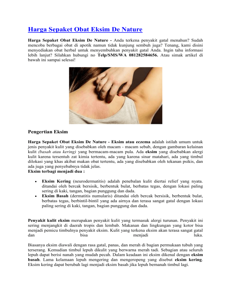 Harga Sepaket Obat Eksim De Nature Harga Sepaket Obat Eksim De Nature - Anda terkena penyakit gatal menahun? Sudah mencoba berbagai obat di apotik namun tidak kunjung sembuh juga? Tenang, kami disini menyediakan obat herbal untuk menyembuhkan penyakit gatal Anda. Ingin tahu informasi lebih lanjut? Silahkan hubungi no Telp/SMS/WA 081282584656. Atau simak artikel di bawah ini sampai selesai! Pengertian Eksim Harga Sepaket Obat Eksim De Nature - Eksim atau eczema adalah istilah umum untuk jenis penyakit kulit yang disebabkan oleh macam - macam sebab, dengan gambaran kelainan kulit (basah atau kering) yang bermacam-macam pula. Ada eksim yang disebabkan alergi kulit karena tersentuh zat kimia tertentu, ada yang karena sinar matahari, ada yang timbul dilokasi yang khas akibat makan obat tertentu, ada yang disebabkan oleh tekanan psikis, dan ada juga yang penyebabnya tidak jelas. Eksim terbagi menjadi dua : Eksim Kering (neurodermatitis) adalah penebalan kulit diertai relief yang nyata. ditandai oleh bercak bersisik, berbentuk bulat, berbatas tegas, dengan lokasi paling sering di kaki, tangan, bagian punggung dan dada. Eksim Basah (dermatitis numularis) ditandai oleh bercak bersisik, berbentuk bulat, berbatas tegas, berbintil-bintil yang ada airnya dan terasa sangat gatal dengan lokasi paling sering di kaki, tangan, bagian punggung dan dada. Penyakit kulit eksim merupakan penyakit kulit yang termasuk alergi turunan. Penyakit ini sering menjangkit di daerah tropis dan lembab. Makanan dan lingkungan yang kotor bisa menjadi pemicu timbulnya penyakit eksim. Kulit yang terkena eksim akan terasa sangat gatal dan bisa menjadi luka. Biasanya eksim diawali dengan rasa gatal, panas, dan merah di bagian permukaan tubuh yang terserang. Kemudian timbul lepuh dikulit yang berwarna merah tadi. Sebagian atau seluruh lepuh dapat berisi nanah yang mudah pecah. Dalam keadaan ini eksim dikenal dengan eksim basah. Lama kelamaan lepuh mengering dan mengeropeng yang disebut eksim kering. Eksim kering dapat berubah lagi menjadi eksim basah jika lepuh bernanah timbul lagi. Harga Rp 295.000 Informasi lebih lanjut hubungi Telp/SMS/WA 081282584656 Apa Saja Gejala Eksim? Harga Sepaket Obat Eksim De Nature - Dimanapun lokasi timbulnya eksim, gejala utama yang dirasakan pasien adalah gatal. Terkadang rasa gatal sudah muncul sebelum ada tanda kemerahan pada kulit. Gejala kemerahan biasanya akan muncul pada wajah, lutut, tangan dan kaki, namun tidak menutup kemungkinan kemerahan muncul di daerah lain. Daerah yang terkena akan terasa sangat kering, menebal atau keropeng. Pada orang kulit putih, daerah ini pada mulanya akan berwarna merah muda lalu berubah menjadi cokelat. Sementara itu pada orang dengan kulit lebih gelap, eksim akan mempengaruhi pigmen kulit sehingga daerah eksim akan tampak lebih terang atau lebih gelap. Apa yang Menjadi Penyebab Eksim Harga Sepaket Obat Eksim De Nature - Penyebab dari eksim sebenarnya belum diketahui dengan pasti, namun beberapa ahli mencurigai eksim berhubungan dengan aktifitas daya pertahanan tubuh (imun) yang berlebihan. Hal ini menyebabkan tubuh mengalami reaksi berlebihan terhadap bakteri atau iritan yang sebenarnya tidak berbahaya pada kulit. Oleh karena itu, eksim banyak ditemukan pada keluarga dengan riwayat penyakit alergi atau asma. Tiap tiap orang mempunyai pencetus eksim yang berbeda beda. Ada orang yang setelah memegang sabun atau deterjen akan merasakan gatal yang luar biasa, ada pula yang disebabkan oleh bahan atau alat rumah tangga yang lain. Gejala yang timbul pun bervariasi, ada yang gatalnya ringan tetapi rasa panas yang dominan, ada pula yang sebaliknya. Infeksi saluran nafas bagian atas atau flu juga bisa menjadi pencetus timbulnya eksim. Stress yang dialami penderita akan membuat gejala menjadi lebih buruk. Jenis – Jenis Penyakit Gatal Eksim : 1. Dermatitis atopik : salah satu jenis eksim yang paling sering dijumpai dan merupakan penyakit turunan. Dermatitis atopik umumnya dimulai ketika bayi dan masih anakanak dengan gejala berupa gatal, radang kulit, dan pada sebagian penderita sering timbul asma dan demam hay (hay fever). 2. Dermatitis kontak : meliputi dermatitis kontak alergik dan iritan. Dermatitis kontak alergik disebabkan oleh reaksi kekebalan tertunda (delayed immune system) akibat kontak kulit dengan senyawa alergenik sehingga menyebabkan radang kulit dalam 48 jam setelah paparan terjadi. Beberapa agen penyebab eksim jenis ini adalah jelatang, parfum, pengawet kosmetik, metal, dan pewarna. 3. Dermatitis kontak iritan terjadi karena paparan senyawa iritan yang dapat merusak kulit secara kimiawi, contohnya sabun keras, detergen, dan produk pembersih lainnya. Senyawa iritan tersebut dapat menghilangkan minyak dan kelembaban dari lapisan luar kulit, kemudian merusak lapisan pelindung dan memicu terjadinya peradangan. 4. Eksim numular : beberapa plak eksim yang biasanya berhubungan dengan kulit kering dan terjadi pada bagian luar dari kaki, tangan, dan lengan. 5. Eksim stasis : jenis eksim kronis pada daerah bawah kaki bagian dalam yang berkaitan dengan varises. Pertanyaan yang sering terpikirkan di benak Anda : Jika Saya terlanjur kena penyakit eksim, bagaimana cara mengobatinya? Bagaimana cara mengobati penyakit eksim dengan cepat dan tuntas? Bagaimana berobat yang mudah tanpa perlu malu untuk ke dokter? Jawabannya: semua bisa, asal Anda memilih produk yang tepat, yaitu Eximtas, Kapsul BD De Nature dan Salep Exclear. Pengobatan Penyakit Eksim Harga Sepaket Obat Eksim De Nature - Pengobatan Eksim secara tradisional yaitu dengan menggunakan Obat Eksim dari De Nature. Produk yang terbuat dari bahan herbal alami diramu dengan resep tradisional dan diolah secara teknologi modern, sehingga aman di konsumsi. Jadi anda juga tak perlu khawatir karena Obat Herbal De Nature yang kami tawarkan ini, Alhamdulillah, merupakan obat yang telah banyak menyembuhkan penderitanya baik dari dalam maupun luar negeri. Sudah banyak pasien kami yang merasakan kesembuhannya dengan mengons