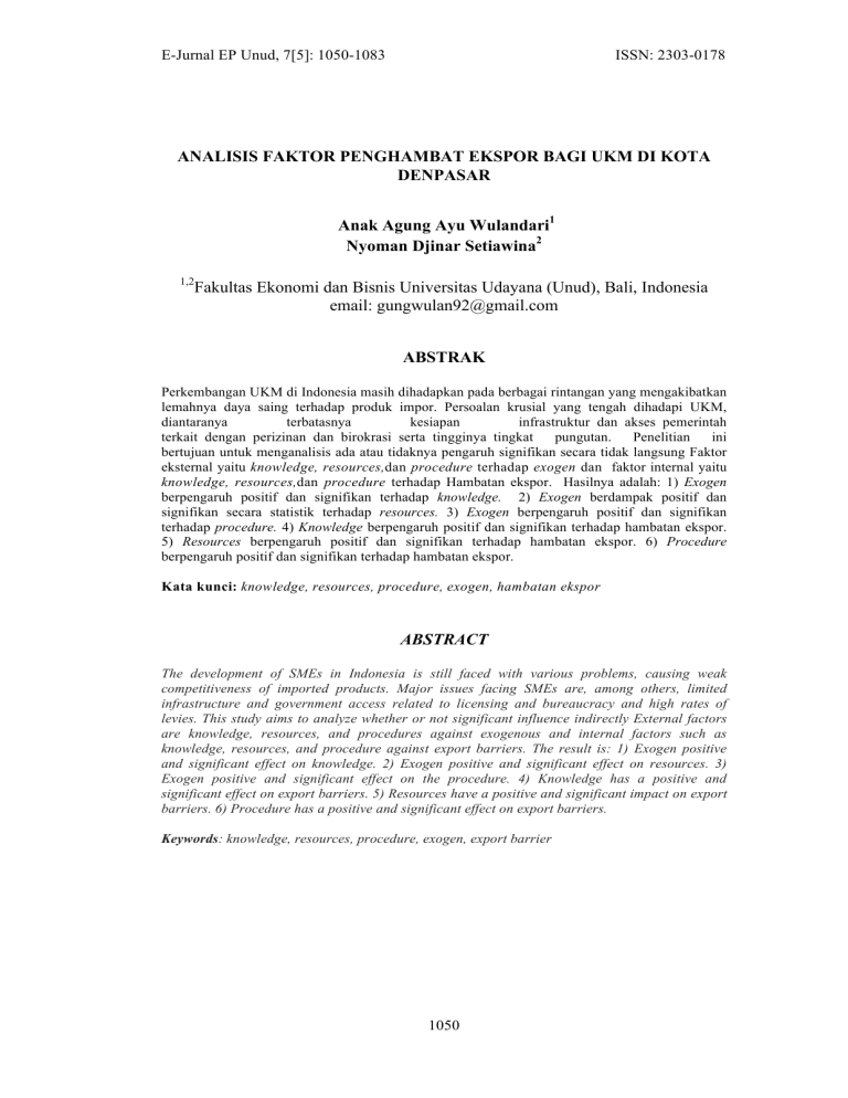 E-Jurnal EP Unud, 7[5]: 1050-1083 ISSN: 2303-0178 ANALISIS FAKTOR PENGHAMBAT EKSPOR BAGI UKM DI KOTA DENPASAR Anak Agung Ayu Wulandari1 Nyoman Djinar Setiawina2 1,2 Fakultas Ekonomi dan Bisnis Universitas Udayana (Unud), Bali, Indonesia email: [email protected] ABSTRAK Perkembangan UKM di Indonesia masih dihadapkan pada berbagai rintangan yang mengakibatkan lemahnya daya saing terhadap produk impor. Persoalan krusial yang tengah dihadapi UKM, diantaranya terbatasnya kesiapan infrastrukturndannaksesnpemerintah terkaitndengannperizinanndannbirokrasinsertantingginyantingkat pungutan. Penelitian ini bertujuan untuk menganalisis ada atau tidaknya pengaruh signifikan secara tidak langsung Faktor eksternal yaitu knowledge, resources,dan procedure terhadap exogen dan faktor internal yaitu knowledge, resources,dan procedure terhadap Hambatan ekspor. Hasilnya adalah: 1) Exogen berpengaruh positif dan signifikan terhadap knowledge. 2) Exogen berdampak positif dan signifikan secara statistik terhadap resources. 3) Exogen berpengaruh positif dan signifikan terhadap procedure. 4) Knowledge berpengaruh positif dan signifikan terhadap hambatan ekspor. 5) Resources berpengaruh positif dan signifikan terhadap hambatan ekspor. 6) Procedure berpengaruh positif dan signifikan terhadap hambatan ekspor. Kata kunci: knowledge, resources, procedure, exogen, hambatan ekspor ABSTRACT The development of SMEs in Indonesia is still faced with various problems, causing weak competitiveness of imported products. Major issues facing SMEs are, among others, limited infrastructure and government access related to licensing and bureaucracy and high rates of levies. This study aims to analyze whether or not significant influence indirectly External factors are knowledge, resources, and procedures against exogenous and internal factors such as knowledge, resources, and procedure against export barriers. The result is: 1) Exogen positive and significant effect on knowledge. 2) Exogen positive and significant effect on resources. 3) Exogen positive and significant effect on the procedure. 4) Knowledge has a positive and significant effect on export barriers. 5) Resources have a positive and significant impact on export barriers. 6) Procedure has a positive and significant effect on export barriers. Keywords: knowledge, resources, procedure, exogen, export barrier 1050 Analisis Faktor……… [Anak Agung Ayu Wulandari, Nyoman Djinar Setiawina] PENDAHULUAN Pertumbuhan tenaga kerja, perkembangan inovasi, dan perdagangan di n n n n n n n n berbagai negara sangat disokong dengan keberadaan UKM (Bachi-Sen, 1999). n n n n n n Tambunan (2003) mengungkapkan bahwa UKM dapat bertahan dari kondisi yang kurang sehat pada makroekonomi berkat dua factor utama. Salah satunya adalah keberadaan input lokal yang tinggi selama proses produksi. Tingginya kandungan lokal namun belum menjadi factor utama yang menurunkan risiko keterpurukan akibat penurunan nilai tukar rupiah, sehingga biaya produksi meningkat akibat tingginya bahan penunjang yang diimpor. Unggulnya faktor pertama ini juga dapat dilanjutkan untuk menelurkan komoditas yang unik dank has dengan ciri n n tertentu yang menjadi nilai tambah bagi produk sehingga membuatnya memiliki n n n n n daya bersaing lebih tinggi. Bisa dikatakan, suatu produk akan bernilai lebih baik n n n dan berdaya saing tinggi di pasar ketika produk tersebut dapat menjadi yang unggul di kelasnya atau menjadi sebuah item yang unik. Samosirn(2000) menyatakan faktor-faktor penghambat bagi UKMn ProdusennEksportirndan n n UKMnIndirectnExporterndalam melakukannekspor pada saat krisis dipengaruhi olehndua faktor penghambatnyaitu faktor eksternal dan faktor internal. Di sisi lain, faktorneksternal yang sangat mempengaruhi kinerja ekspor UKM adalah: 1. Kenaikan suku bunga perbankan yang cukup tinggi mengakibatkan kelangkaan modal tambahan untuk memproduksi barang, 2. Kenaikan harga baku lebih dipengaruhi adanya sebagian bahan baku terutama dalam proses akhir masih diimpor, n3. nKurangnya informasi pasar baik itu negara-negara yang menjadi orientasi pasar produk UKMnmaupun disain produk yang belum mengikuti 1051 E-JURNALnEKONOMInPEMBANGUNANnUNIVERSITASnUDAYANA Vol.7, No.5 Mei 2018 keinginan pasar , dan 4. Kurangnya dukungan Pemda dan rendahnya koordinasi n n n n n antar instansi terkait dalam melakukan pembinaan UKM setempat. Sedangkan n n n n faktor-faktor internal yang berdampak pada kinerja ekspor UKM diantaranya: 1. n n n n Sifat manajemen UKM yang tradisional, 2. Pengaruh krisis terhadap likuiditas, n n n n dan 3. Upah tenaga kerja. Tabel 1. Laporan Realisasi Ekspor UKM di Kota Denpasar NO KOMODITI 2013 NILAI ( US$ ) 2014 NILAI ( US$ ) % 2015 NILAI ( US$ ) % 2016 NILAI ( US$ ) % 2017 NILAI ( US$ ) % Total per Komoditi % 1 Hasil Kerajinan 158.932.293,17 41,31 173.661.462,34 43,79 154.958.735,10 40,96 156.676.631,49 46,17 176.838.928,70 41,56 821.068.050,80 2 Hasil Industri 114.943.007,87 29,88 112.804.630,81 28,44 110.098.300,79 29,10 108.707.997,21 32,04 89.366.897,25 21,00 535.920.833,93 3 Hasil Pertanian 109.569.720,73 28,48 108.221.675,27 27,29 111.338.087,22 29,43 71.626.480,00 21,11 155.700.621,12 36,60 556.456.584,34 251.362,00 0,07 881.454,73 0,22 427.367,56 0,11 455.408,38 0,13 667.293,40 0,16 2.682.886,07 1.049.756,67 0,27 1.049.756,67 0,26 1.512.747,53 0,40 1.850.350,50 0,55 2.895.592,04 0,68 8.358.203,41 384.746.140,44 100,00 396.618.979,82 100,00 378.335.238,20 100,00 339.316.867,58 100,00 425.469.332,51 100,00 1.924.486.558,55 4 Hasil Perkebunan 5 Lain - Lain Total Sumber : Dinas Perindustrian dan Perdagangan Kota Denpasar Gambar 1. Grafik Total Per tahun Sumber : Dinas Perindustrian dan Perdagangan Kota Denpasar Sektor UKM mengalami berbagai fluktuasi dari tahun ke tahun, karena adanya hambatan seperti hambatan pengetahuan, hambatan sumber daya, hambatan prosedur, dan hambatan eksternal yang berasal dari luar UKM atau perusahaan. Di Denpasar jumlah pelaku atau pengusaha UKM berdasarkan data yang dimiliki
