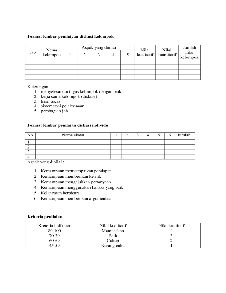 Format lembar penilaiyan diskusi kelompok No Aspek yang dinilai Nama kelompok 1 2 3 5 Nilai Nilai kualitatif kuantitatif 2 3 4 Jumlah nilai kelompok Keterangan: 1. menyelesaikan tugas kelompok dengan baik 2. kerja sama kelompok (diskusi) 3. hasil tugas 4. sistemetasi pelaksanaan 5. pembagian job Format lembar penilaian diskusi individu No Nama siswa 1 4 5 6 Jumlah 1 2 3 4 Aspek yang dinilai : 1. 2. 3. 4. 5. 6. Kemampuan menyampaikan pendapat Kemampuan memberikan keritik Kemampuan mengajukkan pertanyaan Kemampuan menggunakan bahasa yang baik Kelancaran berbicara Kemampuan memberikan argumentasi Kriteria penilaian Kreteria indikator 80-100 70-79 60-69 45-59 Nilai kualitatif Memuaskan Baik Cukup Kurang cuku Nilai kuntitaif 4 3 2 1 Penilaian Unjuk Kerja No Nama 1 20 Unjuk kerja 2 3 4 20 20 20 5 20 Jumlah skor Kriteria penilaian Kreteria indikator 80-100 70-79 60-69 45-59 Nilai kualitatif Memuaskan Baik Cukup Kurang Nilai kuntitaif 4 3 2 1