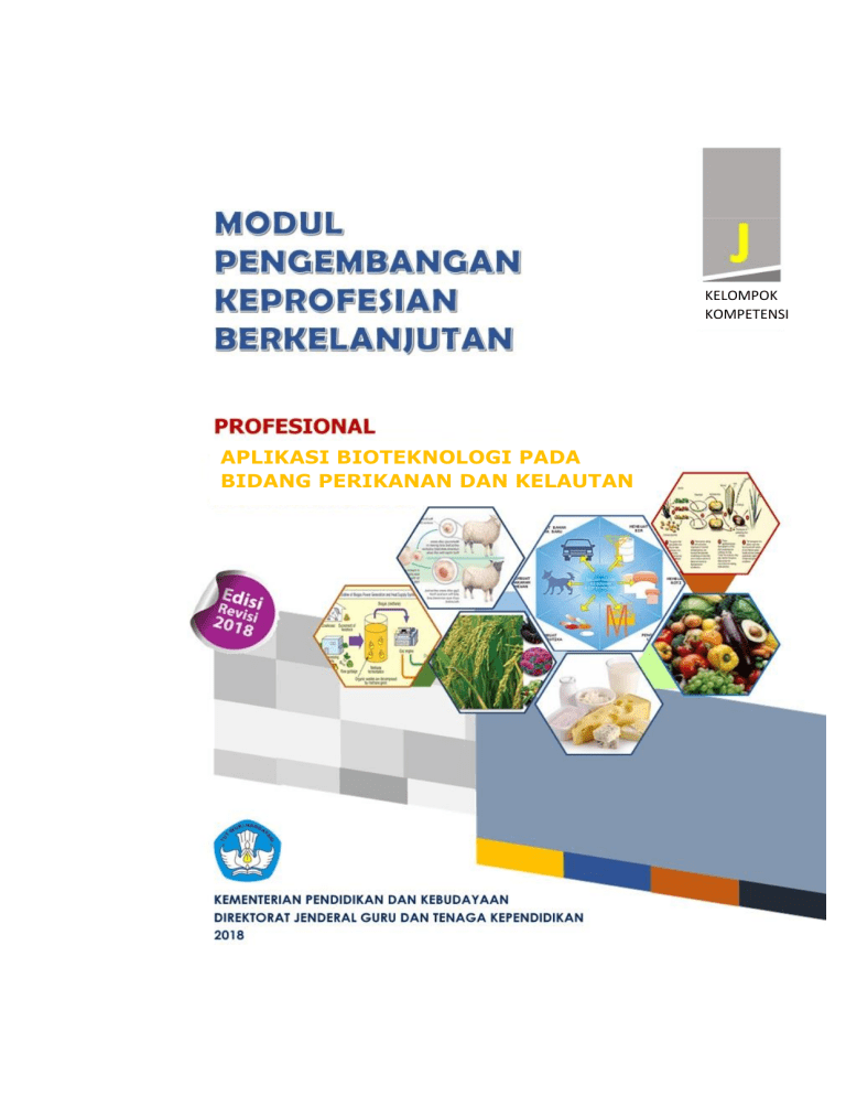 KELOMPOK KOMPETENSI APLIKASI BIOTEKNOLOGI PADA BIDANG PERIKANAN DAN KELAUTAN MODUL PENGEMBANGAN KEPROFESIAN BERKELANJUTAN MATA PELAJARAN BIOLOGI BIDANG PERIKANAN DAN KELAUTAN SEKOLAH MENENGAH KEJURUAN (SMK) KELOMPOK KOMPETENSI : J PROFESIONAL APLIKASI BIOTEKNOLOGI PADA BIDANG PERIKANAN DAN KELAUTAN Penulis : Dra. Wisnuwati, M.Pd Penelaah : Ir. Firman Heriansyah .M.Si Reviewer : Dra. Wisnuwati, M.Pd Ilustration Tim Desain Grafis Copyright @2018 Pusat Pengembangan dan Pemberdayaan Pendidik dan Tenaga Kependidikan Pertanian Direktorat Jenderal Guru dan Tenaga Kependidikan Kementerian Pendidikan dan Kebudayaan Hak Cipta Dilindungi Undang-Undang Dilarang mengcopy sebagian atau keseluruhan isi buku untuk kepentingan komersial tanpa izin tertulis dari Kementerian Pendidikan dan Kebudayaan Kata Sambutan Peran guru profesional dalam proses pembelajaran sangat penting sebagai kunci keberhasilan belajar siswa. Guru profesional adalah guru yang kompeten membangun proses pembelajaran yang baik sehingga dapat menghasilkan pendidikan yang berkualitas dan berkarakter prima. Hal tersebut menjadikan guru sebagai komponen yang menjadi fokus perhatian pemerintah pusat maupun pemerintah daerah dalam peningkatan mutu pendidikan terutama menyangkut kompetensi guru. Pengembangan profesionalitas guru melalui Program Pengembangan Keprofesian Berkelanjutan merupakan upaya Kementerian Pendidikan dan Kebudayaan melalui Direktorat Jenderal Guru dan Tenaga Kependikan dalam upaya peningkatan kompetensi guru. Sejalan dengan hal tersebut, pemetaan kompetensi guru telah dilakukan melalui Uji Kompetensi Guru (UKG) untuk kompetensi pedagogik dan profesional pada akhir tahun 2015. Peta profil hasil UKG menunjukkan kekuatan dan kelemahan kompetensi guru dalam penguasaan pengetahuan pedagogik dan profesional. Peta kompetensi guru tersebut dikelompokkan menjadi 10 (sepuluh) kelompok kompetensi. Tindak lanjut pelaksanaan UKG diwujudkan dalam bentuk pelatihan guru paska UKG sejak tahun 2016 dan akan dilanjutkan pada tahun 2018 ini dengan Program Pengembangan Keprofesian Berkelanjutan bagi Guru. Tujuannya adalah untuk meningkatkan kompetensi guru sebagai agen perubahan dan sumber belajar utama bagi peserta didik. Program Pengembangan Keprofesian Berkelanjutan bagi Guru dilaksanakan melalui Moda Tatap Muka. Pusat Pengembangan dan Pemberdayaan Pendidik dan Tenaga Kependidikan (PPPPTK) dan, Lembaga Pengembangan dan Pemberdayaan Pendidik dan Tenaga Kependidikan Kelautan Perikanan Teknologi Informasi dan Komunikasi (LP3TK KPTK) merupakan Unit Pelaksanana Teknis di lingkungan Direktorat Jenderal Guru dan Tenaga Kependidikan yang bertanggung jawab dalam mengembangkan perangkat dan melaksanakan peningkatan kompetensi guru sesuai bidangnya. Adapun perangkat pembelajaran yang dikembangkan tersebut adalah modul Program Pengembangan Keprofesian Berkelanjutan melalui Pendidikan dan Pelatihan Guru moda tatap muka untuk semua mata pelajaran dan kelompok kompetensi. Dengan modul ini diharapkan program Pengembangan Keprofesian Berkelanjutan memberikan sumbangan yang sangat besar dalam peningkatan kualitas kompetensi guru. Mari kita sukseskan Program Pengembangan Keprofesian Berkelanjutan melalui Pendidikan dan Pelatihan Guru ini untuk mewujudkan Guru Mulia karena Karya. Jakarta, Juli 2018 Direktur Jenderal Guru dan Tenaga Kependidikan, Dr. Supriano, M.Ed. NIP. 196208161991031001 Kata Pengantar Peraturan Menteri Pendayaan Aparatur Negara dan Reformasi Birokrasi nomor 16 Tahun 2009 pada ayat 7 menyatakan bahwa Pengembangan Keprofesian Berkelanjutan (PKB) adalah pengembangan kompetensi guru yang dilaksanakan sesuai dengan kebutuhan, bertahap, berkelanjutan untuk meningkatkan profesionalitasnya. Sejalan dengan tugas Pusat Pengembangan dan Pemberdayaan Pendidik dan Tenaga Kependidikan Pertanian dalam mengembangkan dan memberdayakan pendidik dan tenaga kependidikan maka pada tahun anggaran 2018 ini PPPPTK Pertanian telah merevisi modul-modul untuk pelatihan guru khususnya dalam lingkup bidang kejuruan perikanan dan kelautandimana modul disusun berdasarkan pengelompokan grade mulai grade 1 sampai dengan grade 10. Modul yang disusun akan digunakan untuk bahan pelatihan guru dimana guru akan diberikan pelatihan berdasarkan nilai hasil uji kompetensi yang dapat dipetakan posisinya pada grade berapa. Adapun modul ini adalah modul grade 1 yang merupakan bagian dari modul Biologi Bidang Keahlian perikanan dan kelautan yang terdiri dari 4 (empat) bagian yaitu bagian I Pendahuluan, bagian II Kegiatan Pembelajaran, bagian III Evaluasi, dan bagian IV Penutup. Modul yang telah disusun selalu dilakukan pembaruan secara periodik setiap kurun waktu tertentu mengikuti perkembangan ilmu pengetahuan dan teknologi dan perubahan kebijakan-kebijakan terkait pengembangan dengan pendekatan High Order Tainking Skill (HOTS). Semoga Modul Diklat PKB Guru Biologi Bidang Keahlian perikanan dan kelautan Grade-1 ini dapat bermanfaat bagi yang memerlukannya. Cianjur, Juli 2018 Kepala PPPPTK Pertanian DR. Ir. H. R. Ruli Basuni, MP NIP. 19630720 199001 1 001 DAFTAR ISI Cover Luar Cover Dalam Kata Pengantar ........................................................................................... Daftar Isi....................................................................................................... Daftar Gambar .............................................................................................. Daftar Tabel .................................................................................................. Daftar Lampiran ............................................................................................ Pendahuluan A. Latar Belakang ................................................................................. 10 B. Tujuan ............................................................................................ 12 C. Peta Kompetensi ........... ................................................................. 12 D. Ruang Lingkup ......................