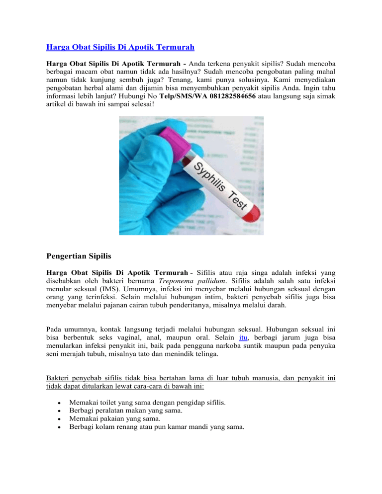 Harga Obat Sipilis Di Apotik Termurah Harga Obat Sipilis Di Apotik Termurah - Anda terkena penyakit sipilis? Sudah mencoba berbagai macam obat namun tidak ada hasilnya? Sudah mencoba pengobatan paling mahal namun tidak kunjung sembuh juga? Tenang, kami punya solusinya. Kami menyediakan pengobatan herbal alami dan dijamin bisa menyembuhkan penyakit sipilis Anda. Ingin tahu informasi lebih lanjut? Hubungi No Telp/SMS/WA 081282584656 atau langsung saja simak artikel di bawah ini sampai selesai! Pengertian Sipilis Harga Obat Sipilis Di Apotik Termurah - Sifilis atau raja singa adalah infeksi yang disebabkan oleh bakteri bernama Treponema pallidum. Sifilis adalah salah satu infeksi menular seksual (IMS). Umumnya, infeksi ini menyebar melalui hubungan seksual dengan orang yang terinfeksi. Selain melalui hubungan intim, bakteri penyebab sifilis juga bisa menyebar melalui pajanan cairan tubuh penderitanya, misalnya melalui darah. Pada umumnya, kontak langsung terjadi melalui hubungan seksual. Hubungan seksual ini bisa berbentuk seks vaginal, anal, maupun oral. Selain itu, berbagi jarum juga bisa menularkan infeksi penyakit ini, baik pada pengguna narkoba suntik maupun pada penyuka seni merajah tubuh, misalnya tato dan menindik telinga. Bakteri penyebab sifilis tidak bisa bertahan lama di luar tubuh manusia, dan penyakit ini tidak dapat ditularkan lewat cara-cara di bawah ini: Memakai toilet yang sama dengan pengidap sifilis. Berbagi peralatan makan yang sama. Memakai pakaian yang sama. Berbagi kolam renang atau pun kamar mandi yang sama. � Kami De Nature Indonesia, Apotik Herbal Online menjual berbagai produk herbal untuk penyakit kelamin seperti Kencing Nanah, Wasir, Sipilis, Kutil Kelamin dan lainnya. Untuk konsultasi dan pemesanan hubungi no Telp/SMS/WA 081282584656. De Nature Indonesia beralamat di Perum Cendana Asri No.9 Majenang, Jl. Pahonjean Km.5 Majenang, Cilacap, Jawa Tengah � Tahapan Sipilis Gejala pertama sifilis muncul sekitar tiga minggu setelah bakteri memasuki tubuh. Infeksi sifilis terbagi menjadi empat tahapan utama, antara lain: Sifilis Primer Penderita sifilis mengalami gejala yang dimulai dengan lesi atau luka pada alat kelamin atau di dalam dan di sekitar mulut. Luka yang terjadi berbentuk seperti gigitan serangga tapi tidak menimbulkan rasa sakit. Pada tahap ini, jika orang yang terinfeksi berhubungan seksual dengan orang lain, penularan sangat mudah terjadi. Luka ini bertahan selama 1-2 bulan. Pada akhirnya, lesi ini akan sembuh tanpa meninggalkan bekas. � � Sifilis Sekunder Penderita sifilis sekunder akan mengalami ruam merah serukuran koin kecil dan biasanya ruam ini muncul pada telapak tangan dan telapak kaki. Gejala lain yang mungkin muncul adalah demam, nafsu makan menurun, radang tenggorokan dan kutil kelamin. Fase ini bisa bertahan selama satu hingga tiga bulan. � Sifilis Laten Setelah fase sifilis sekunder, sifilis seakan-akan menghilang dan tidak menimbulkan gejala sama sekali. Masa laten ini bisa bertahan sekitar dua tahun sebelum kemudian lanjut ke masa yang paling berbahaya dalam infeksi sifilis yaitu sifilis tersier. � Sifilis Tersier Jika infeksi tidak terobati, sifilis akan berkembang ke tahapan akhir, yaitu sifilis tersier. Pada tahap ini, infeksi bisa memberi efek yang serius pada tubuh. Beberapa akibat dari infeksi pada tahapan ini adalah kelumpuhan, kebutaan, demensia, masalah pendengaran, impotensi, dan bahkan kematian jika tidak ditangani. Sifilis paling mudah menular pada fase sifilis primer dan sekunder. Jika Anda merasa terinfeksi sifilis, segera periksakan diri ke dokter atau klinik spesialis penyakit kelamin untuk memastikan diagnosis terhadap sifilis. Makin cepat sifilis diobati, makin kecil kemungkinan sifilis berkembang menjadi penyakit yang serius. GEJALA ATAU TANDA PENYAKIT SIPILIS Harga Obat Sipilis Di Apotik Termurah - Penyakit sipilis bisa menyebabkan kerusakan organ-organ tubuh. Kerusakan tersebut bisa menimpa syaraf, otak, otot, tulang, mata, serta organ bagian tubuh yang lainnya. Bahkan, jika sudah stadium lajut penyakit ini dapat menyebabkan kematian pada si penderita.Penyakit kelamin yang satu ini memang tidak boleh dianggap remeh. Perlu Anda ketahui bahwa penyakit ini akan menggerogoti sistem kekebalan tubuh penderita sehingga tubuh si penderita akan sangat mudah terkena penyakit dan bertambah parah karena infeksi dari bakteri penyebab penyakit ini menyebar keseluruh tubuh dengan cepat. Untuk itu sebaiknya kita dapat mengenali tanda-tanda penyakit kelamin ini melalui gejala yang muncul. Informasi lebih lanjut hubungi Telp/SMS/WA 081282584656 Gejala/Tanda Penyakit Sipilis Pada Wanita 1. Keluarnya cairan tidak normal dari saluran kencing atau liang senggama 2. Timbulnya keputihan yang banyak, berbau amis, dan warnanya cenderung putih kehijauan. 3. Rasa nyeri ketika buang air kecil 4. Rasa nyeri saat berhubungan seksual 5. Timbulnya rasa gatal di alat kelamin atau sekitarnya dan menjadi luka koreng di kelamin. 6. Timbulnya luka kecil (terkadang tidak terasa sakit) disertai pembengkakan kelenjar getah bening. 7. Terjadinya perubahan warna kulit dan mata komplikasi bartolitis, yaitu membengkaknya kelenjar Bartholin mengakibatkan kesulitan berjalan karena rasa nyeri. Gejala/Tanda Penyakit Sipilis Pada Pria Sering nyeri selama hubungan seksual. Nyeri ketika buang air kecil. Keluarnya cairan atau kotoran dari penis laki-laki. Ada luka kerongkongan pada orang-orang melakukan oral sek, sehingga kerongkongan sering terasa sakit. Nyeri pada daerah sekitar anus (hal ini terjadi pada orang-orang melakukan anal sex). Luka memerah tanpa rasa sakit pada daerah kelamin, anus, kerongkongan dan atau lidah. Bintik merah pada kulit dan menjadi luka koreng di kelamin. Timbulnya bersisik pada telapak tangan dan telapak kaki. Urine (air kencing) berwarna cenderung gelap, feses berwarna terang. Mata dan kulit cendrung berwarna kuning. Timbulnya bentuk lepuh kecil pada daerah kelamin, dimana itu bisa berubah menjadi koreng. Pembengkakan pada kelen
