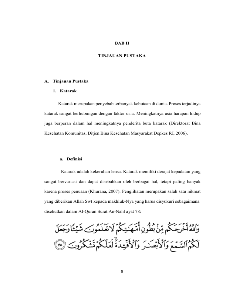 BAB II TINJAUAN PUSTAKA A. Tinjauan Pustaka 1. Katarak Katarak merupakan penyebab terbanyak kebutaan di dunia. Proses terjadinya katarak sangat berhubungan dengan faktor usia. Meningkatnya usia harapan hidup juga berperan dalam hal meningkatnya penderita buta katarak (Direktorat Bina Kesehatan Komunitas, Ditjen Bina Kesehatan Masyarakat Depkes RI, 2006). a. Definisi Katarak adalah kekeruhan lensa. Katarak memiliki derajat kepadatan yang sangat bervariasi dan dapat disebabkan oleh berbagai hal, tetapi paling banyak karena proses penuaan (Khurana, 2007). Penglihatan merupakan salah satu nikmat yang diberikan Allah Swt kepada makhluk-Nya yang harus disyukuri sebagaimana disebutkan dalam Al-Quran Surat An-Nahl ayat 78: 8 9 Yang artinya: “Dan Allah mengeluarkan kamu dari perut ibumu dalam keadaan tidak mengetahui sesuatupun, dan Dia memberi kamu pendengaran, penglihatan, dan hati agar kamu bersyukur” (QS. An-Nahl ayat 78). b. Tipe Katarak Senilis 1) Katarak Nuklear Setelah melewati usia pertengahan, terjadi proses kondensasi normal dalam nukleus lensa mata yang disebut sebagai sklerosis nuklear (Vaughan dan Asbury, 2008). Secara umum, kondisi ini hanya sedikit mengganggu fungsi penglihatan. Terjadinya sklerosis dan penguningan dalam jumlah yang berlebihan disebut katarak nuklear yang menyebabkan kekeruhan sentral (American Academy of Ophtalmology, 2007-2008). Katarak nuklear cenderung progresif perlahan-lahan, dan secara khas mengakibatkan gangguan penglihatan jarak jauh yang lebih besar daripada penglihatan jarak dekat (Suhardjo, et al., 2007). Ini merupakan akibat meningkatnya kekuatan fokus lensa bagian sentral, menyebabkan refraksi bergeser ke miopia. Gejala-gejala lain dapat berupa diskriminasi warna yang buruk atau diplopia monokuler. Sebagian besar katarak nuklear adalah bilateral, tetapi bisa asimetrik (Vaughan dan Asbury, 2008). 2) Katarak Kortikal Katarak kortikal merupakan kekeruhan pada korteks lensa. Katarak ini 10 cenderung bilateral, tetapi sering asimetrik. Derajat gangguan fungsi penglihatan bervariasi, tergantung seberapa dekat kekeruhan lensa dengan sumbu penglihatan (Vaughan dan Asbury, 2008). Kekeruhan kortikal terjadi akibat perubahan komposisi ion pada korteks lensa dan perubahan hidrasi pada serabut lensa. Tanda pertama pembentukan katarak kortikal terlihat dengan slitlamp sebagai vakuola dan celah air di korteks anterior atau posterior. Gejala yang sering dijumpai adalah silau akibat sumber cahaya fokal, seperti lampu mobil (American Academy of Ophtalmology, 2007-2008). 3) Katarak Subkapsular Posterior Katarak subkapsular posterior terdapat pada korteks di dekat kapsul posterior bagian sentral. Pada awal perkembangannya, katarak ini cenderung menimbulkan gangguan penglihatan karena adanya keterlibatan sumbu penglihatan (Vaughan dan Asbury, 2008). Pasien sering mengeluhkan silau dan penglihatan jelek pada kondisi cahaya terang karena katarak subkapsular posterior menutupi pupil ketika miosis akibat cahaya terang, akomodasi, atau miotikum. Penglihatan dekat lebih buruk daripada penglihatan jauh. Katarak ini sering dijumpai pada pasien yang lebih muda (American Academy of Ophtalmology, 2007-2008). c. Anatomi Lensa Kristalina Lensa adalah suatu struktur bikonveks, vaskular, tidak berwarna dan hampir transparan sempurna. Lensa tidak mempunyai asupan darah ataupun inervasi 11 syaraf, dan bergantung sepenuhnya pada akuos humor untuk metabolisme dan pembuangan. Lensa terletak di belakang iris dan di depan korpus vitreous. Posisinya ditopang oleh Zonula Zinni, terdiri dari serabut-serabut kuat yang melekat ke korpus siliaris (Khurana, 2007; American Academy of Ophtalmology, 2007-2008). Diameter lensa adalah 9-10 mm dan tebalnya bervariasi sesuai dengan umur, mulai dari 3,5 mm (saat lahir) dan 5 mm (dewasa) (Khurana, 2007; American Academy of Ophtalmology, 2007-2008). Lensa dapat membiaskan cahaya karena memiliki indeks refraksi, normalnya 1,4 di sentral dan 1,36 di perifer. Dalam keadaaan nonakomodatif, kekuatannya 15-20 dioptri (D) (American Academy of Ophtalmology, 2007-2008). Struktur lensa terdiri dari kapsul yang tipis, transparan, dikelilingi oleh membran hialin yang lebih tebal pada permukaan anterior dibanding posterior (Khurana, 2007). Lensa disokong oleh serabut zonular. Diameter serabutnya 5-30 mm (American Academy of Ophtalmology, 2007-2008). Di bagian ekuator sel ini aktif membelah dan membentuk serabut lensa baru sepanjang kehidupan (Khurana, 2007; American Academy of Ophtalmology, 2007-2008). Nukleus pada bagian sentralnya terdiri dari serabut-serabut tua. Terdiri beberapa zona berbeda, yang menumpuk ke bawah sesuai dengan perkembangannya. Korteks pada bagian perifer terdiri dari serabut-serabut lensa yang muda (Khurana, 2007; American Academy of Ophtalmology, 2007-2008). Enam puluh lima persen lensa terdiri dari air, sekitar 35% protein 12 (kandungan protein tertinggi di antara jaringan-jaringan tubuh), dan sedikit sekali mineral yang biasa ada di jaringan tubuh lainnya. Kandungan kalium lebih tinggi di lensa daripada di kebanyakan jaringan lain. Asam askorbat dan glutation terdapat dalam bentuk teroksidasi maupun tereduksi. Secara fisiologik lensa mempunyai sifat tertentu, yaitu kenyal atau lentur karena memegang peranan penting dalam akomodasi untuk menjadi cembung, jernih atau transparan karena diperlukan sebagai media penglihatan, dan berada di tempatnya. Keadaan patologik lensa ini dapat berupa, tidak kenyal pada orang dewasa yang akan mengakibatkan presbiopia, keruh atau yang dinamakan katarak. Tidak berada di tempat atau subluksasi dan dislokasi. Lensa orang dewasa di dalam perjalanan hidupnya akan menjadi bertambah besar dan berat (Vaughan dan Asbury, 2008; Ilyas, 2010). d. Patofisiologi Katarak Meskipun pathogenesis katarak belum sepenuhnya dimengerti, pada lensa katarak secara karakteristik terdapat agregat-agregat protein yang menghamburkan berkas cahaya dan mengurangi transparansinya. Perubahan protein lainnya akan mengakibatkan perubahan warna 